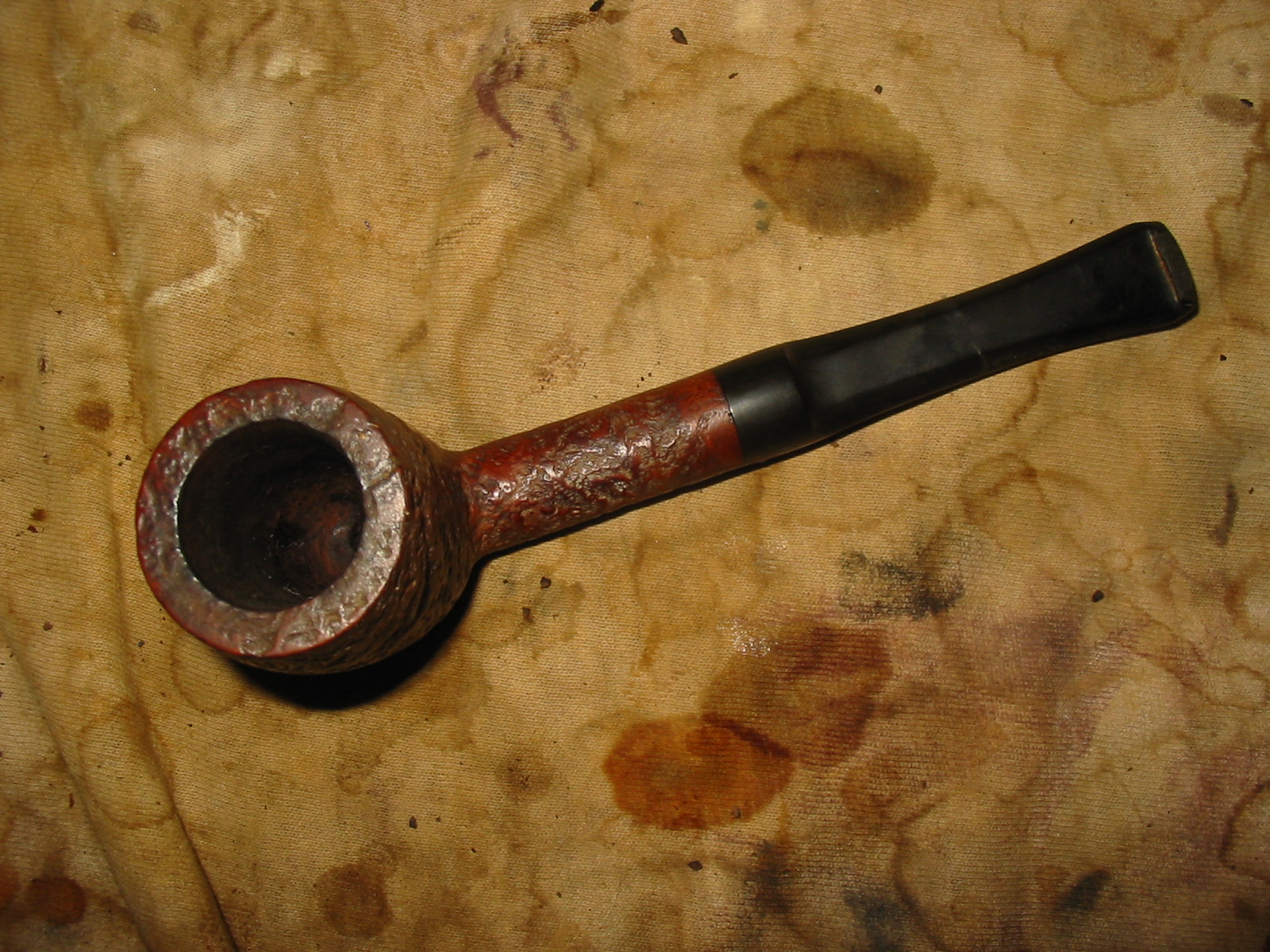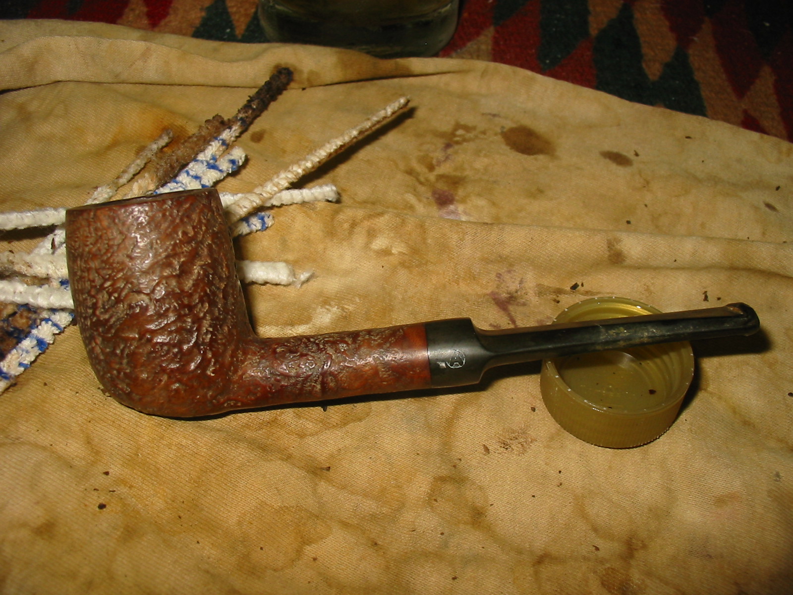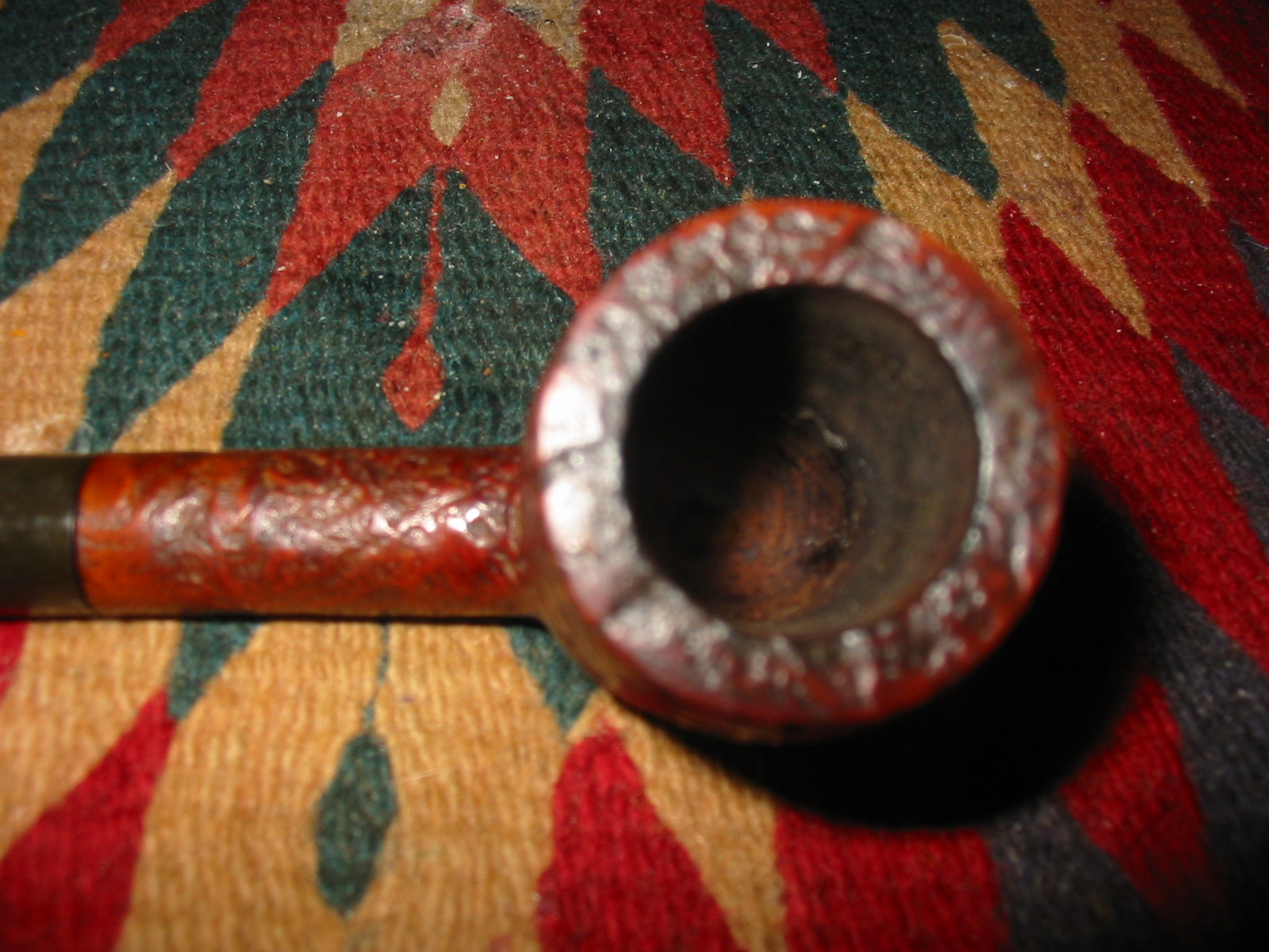It has a deep craggy blast that attracted me to the pipe in the first place. The briar was dirty and the finish was gone. The remaining stain was very spotty and dirty. The grime of many dirty hands had ground into the blast leaving dark spots all around the bowl and shank. The state of the finish can be seen in the photo below. The bowl was dirty and had a slight cake with dottle still in the bowl. The rim had some darkening from the lighter and there was lava on the surface hiding most of the blast. The beauty was that the bowl did not have any damage from tapping it out or burning on the edges. It would clean up very nicely. The stem was slightly oxidized and had a calcified buildup in several spots. It also had a few faint tooth marks about a ¼ inch back from the button. The button itself had several dents in it as well. The slot in the button was too tight to even take a thin pipe cleaner. The inside of the shank was thick with a tarry buildup and the stem was clogged with buildup as well. I am pretty sure the stem had never been cleaned out as a pipe cleaner would not pass through the slot.