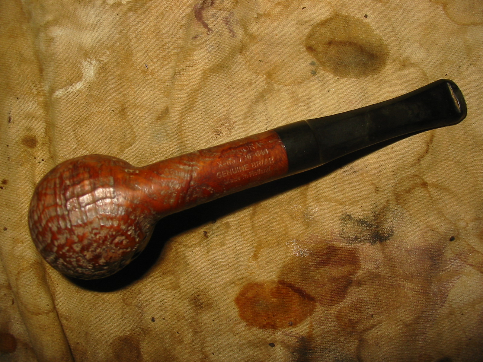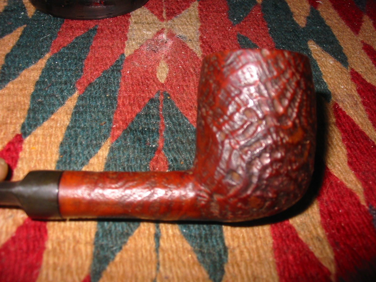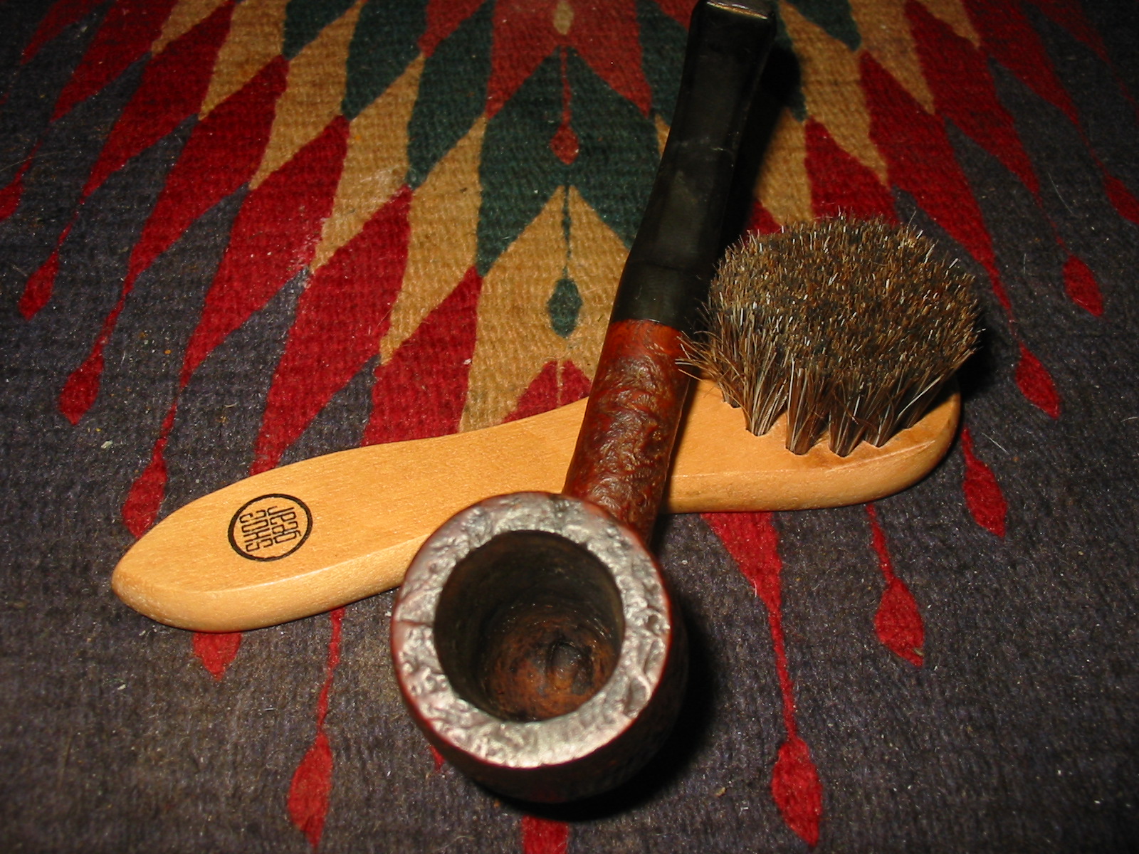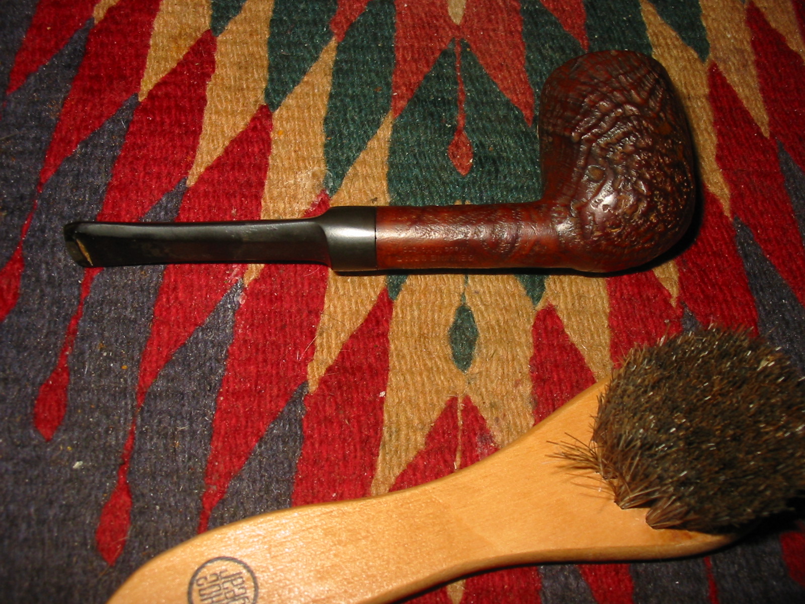 It has a deep craggy blast that attracted me to the pipe in the first place. The briar was dirty and the finish was gone. The remaining stain was very spotty and dirty. The grime of many dirty hands had ground into the blast leaving dark spots all around the bowl and shank. The state of the finish can be seen in the photo below. The bowl was dirty and had a slight cake with dottle still in the bowl. The rim had some darkening from the lighter and there was lava on the surface hiding most of the blast. The beauty was that the bowl did not have any damage from tapping it out or burning on the edges. It would clean up very nicely. The stem was slightly oxidized and had a calcified buildup in several spots. It also had a few faint tooth marks about a ¼ inch back from the button. The button itself had several dents in it as well. The slot in the button was too tight to even take a thin pipe cleaner. The inside of the shank was thick with a tarry buildup and the stem was clogged with buildup as well. I am pretty sure the stem had never been cleaned out as a pipe cleaner would not pass through the slot.