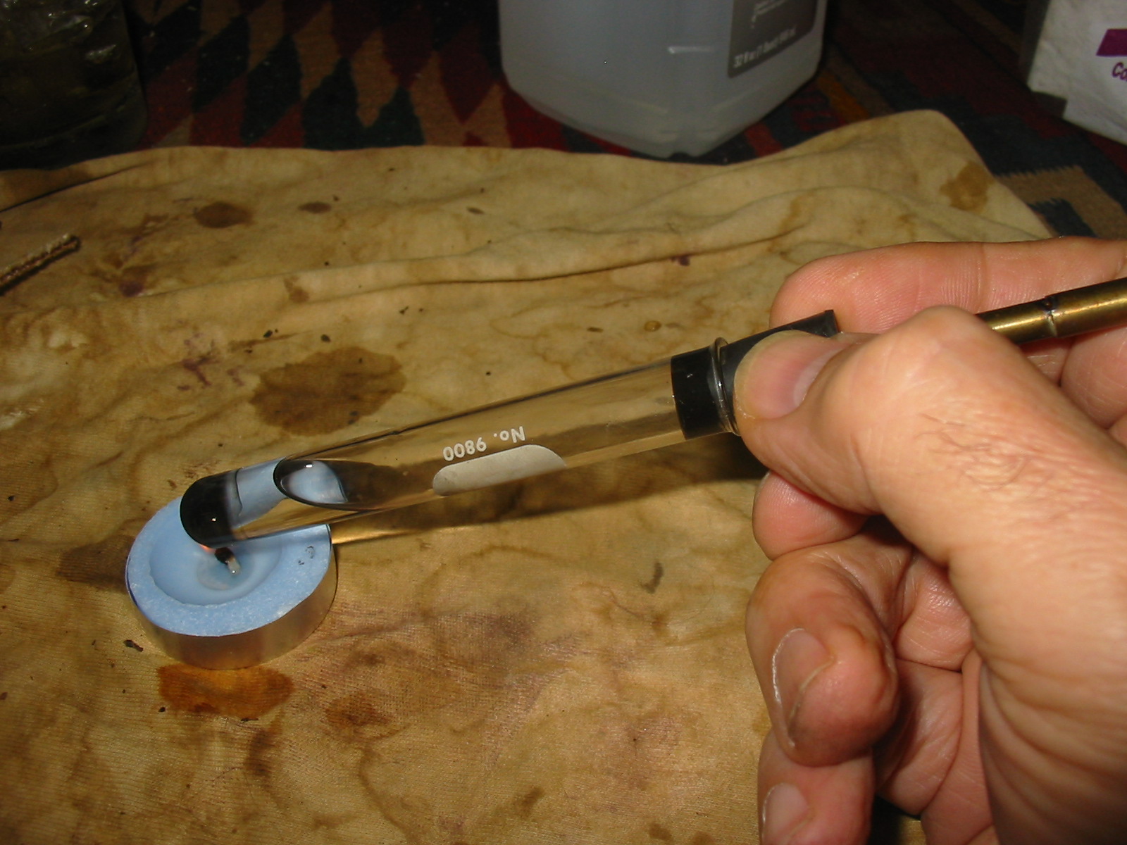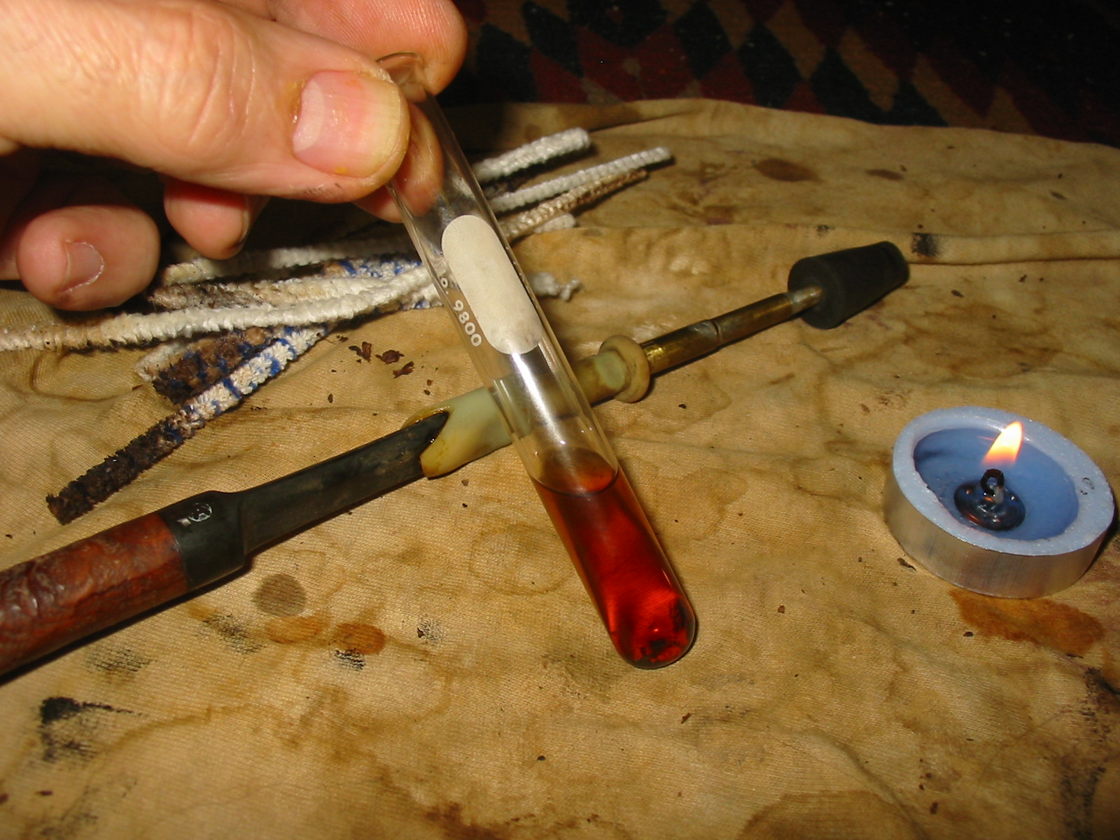 With the slot opened and the interior surface cleaned it was time to set up the retort. I placed a cotton boll in the bowl to keep the boiling alcohol from coming out the top of the bowl. I slid the rubber surgical tubing over the end of the stem and slid it on about ½ an inch. I want a good tight seal at this point because as the alcohol boils it can bubble out the sides of the stem and give a good burn while you are holding the stem. I put about 1 inch of 99% isopropyl in the test tube and put the rubber stopper in place in the mouth of the tube. I lit a small tea light and held the bottom of the test tube over the flame. The alcohol has a low boiling point so it does not take long for it to boil and the gaseous alcohol migrates up the surgical tubing and into the stem, shank and bowl. It is great to feel the shank warm up as the alcohol moves into the shank. I remove it from the flame after several minutes and let it cool off. As the alcohol cools it runs back into the test tube and cools. The next series of three photos show the heating and boiling process.