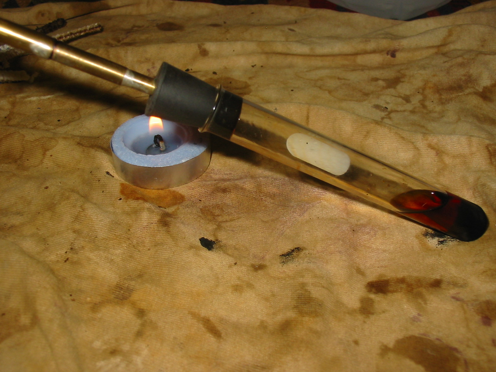 As it cools the alcohol migrates back into the tube. It is generally a very dark amber colour – like nice amber ale! In the first photo below show the tube removed from the flame and the alcohol beginning to refill the tube. The flame is actually behind the stopper not under it – lest anyone wonder about that. I blew out the candle at this point and continued to let the alcohol cool and drain. I then poured out the dirty alcohol, rinsed the tube with warm water, dried it out and refilled it. I reattached the apparatus and used the retort a second and third time until the alcohol came out as clean as when I started using it.