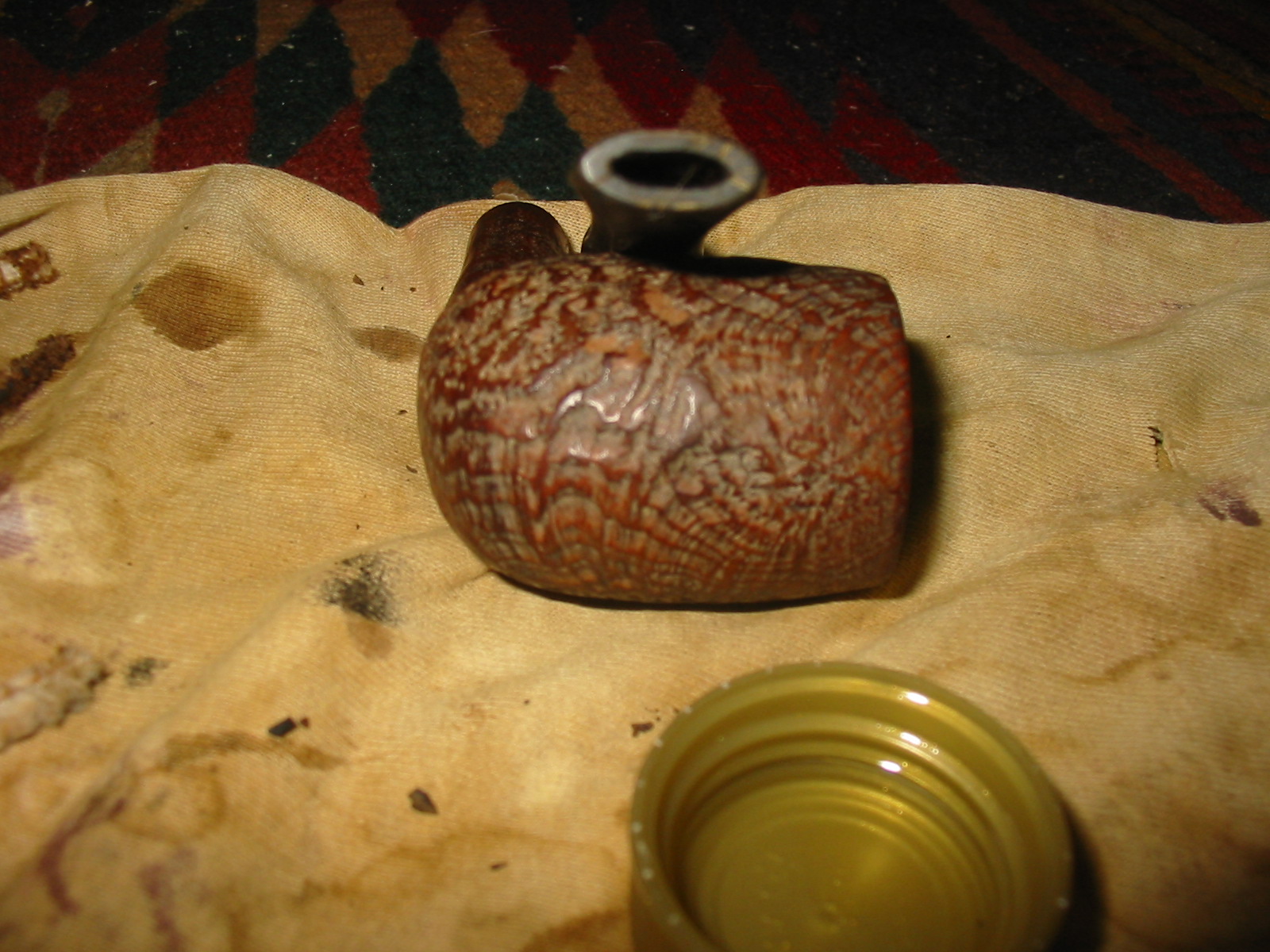 I removed the stem from the bowl and dipped the bowl in an alcohol bath and scrubbed it with a brass tire brush to remove the grit and grime in the blast. I then dropped it into the bath to soak overnight. In the morning I removed it from the bath and gave it another quick scrub with the tire brush. I flamed the alcohol in the bowl to dry it before I cleaned it. This is a simple process of lighting the alcohol on fire with a lighter. It burns blue and burns fast. No harm is done to the briar. I then cleaned the bowl and shank with pipe cleaners to remove as much of the tars and oils as I could before I used the retort to give it a final cleaning.