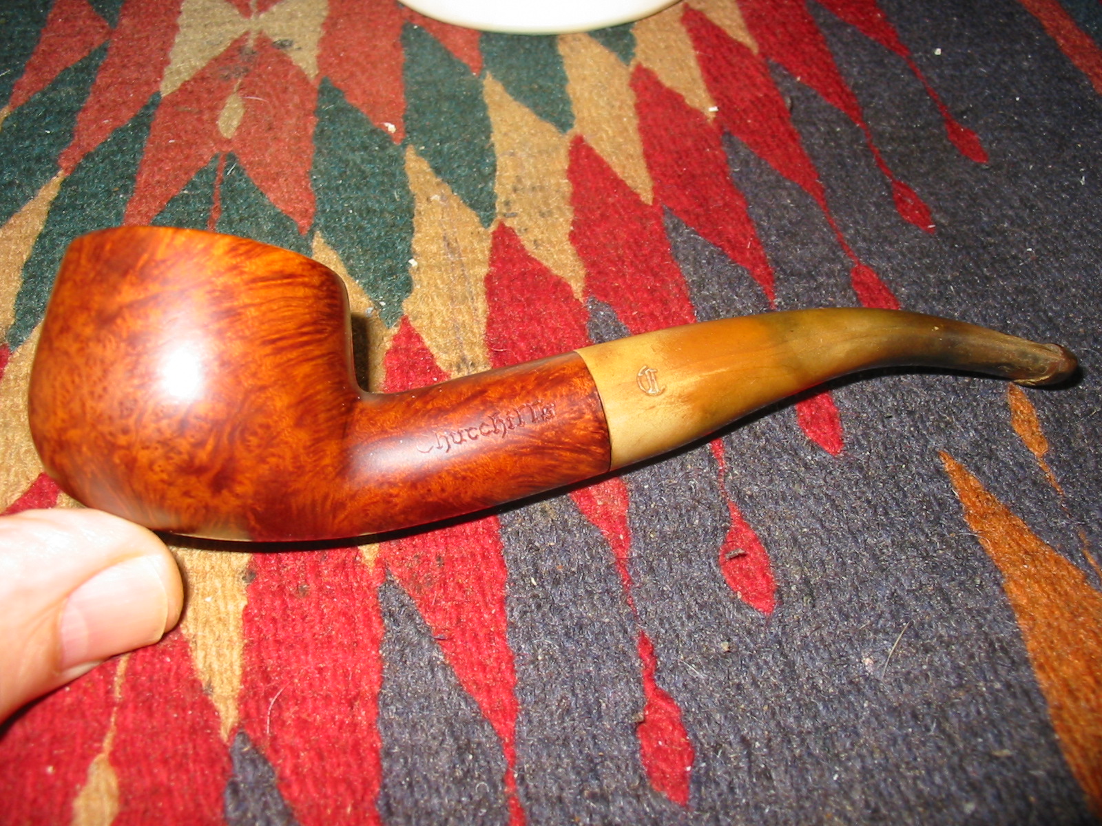 I am fairly certain that the pipe came from Churchill’s Tobacco Shop in Norwich, England. I found the following information on the Pipes and Logos website http://pipephil.eu/logos/en/logo-c4.html On the site there is a small paragraph which I have copied as follows: “Churchill’s Tobacco shop is situated in St Andrew’s Street at the corner of Bridewell Alley in Norwich, England. The shop was next to a church and at the bottom of two hills, and that’s how it became “Churchill’s”. Former manager: John Elvin (retired on May, 31 2008). Current owner (2008): Keith Garrard.” I have included these pictures from that website as they show the stamping on both the shank and stem that is identical to the pipe that I have just refurbished.