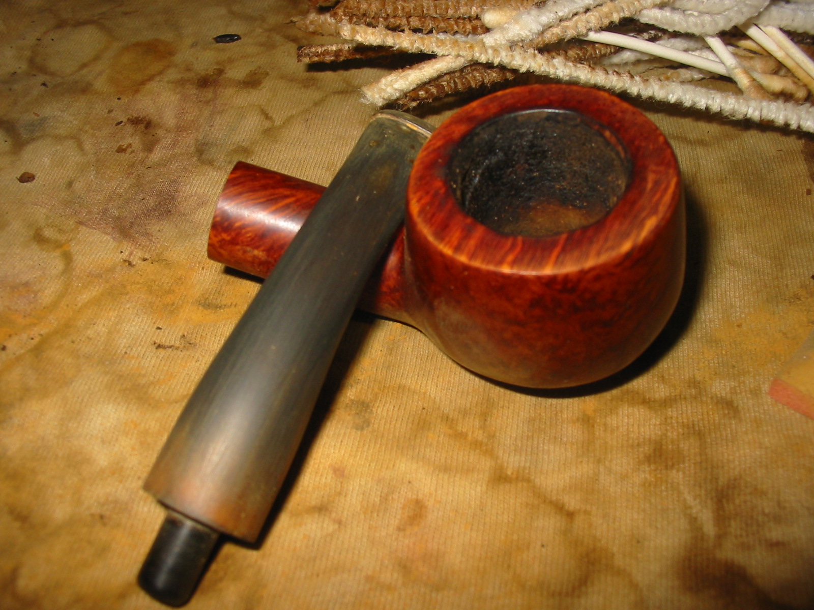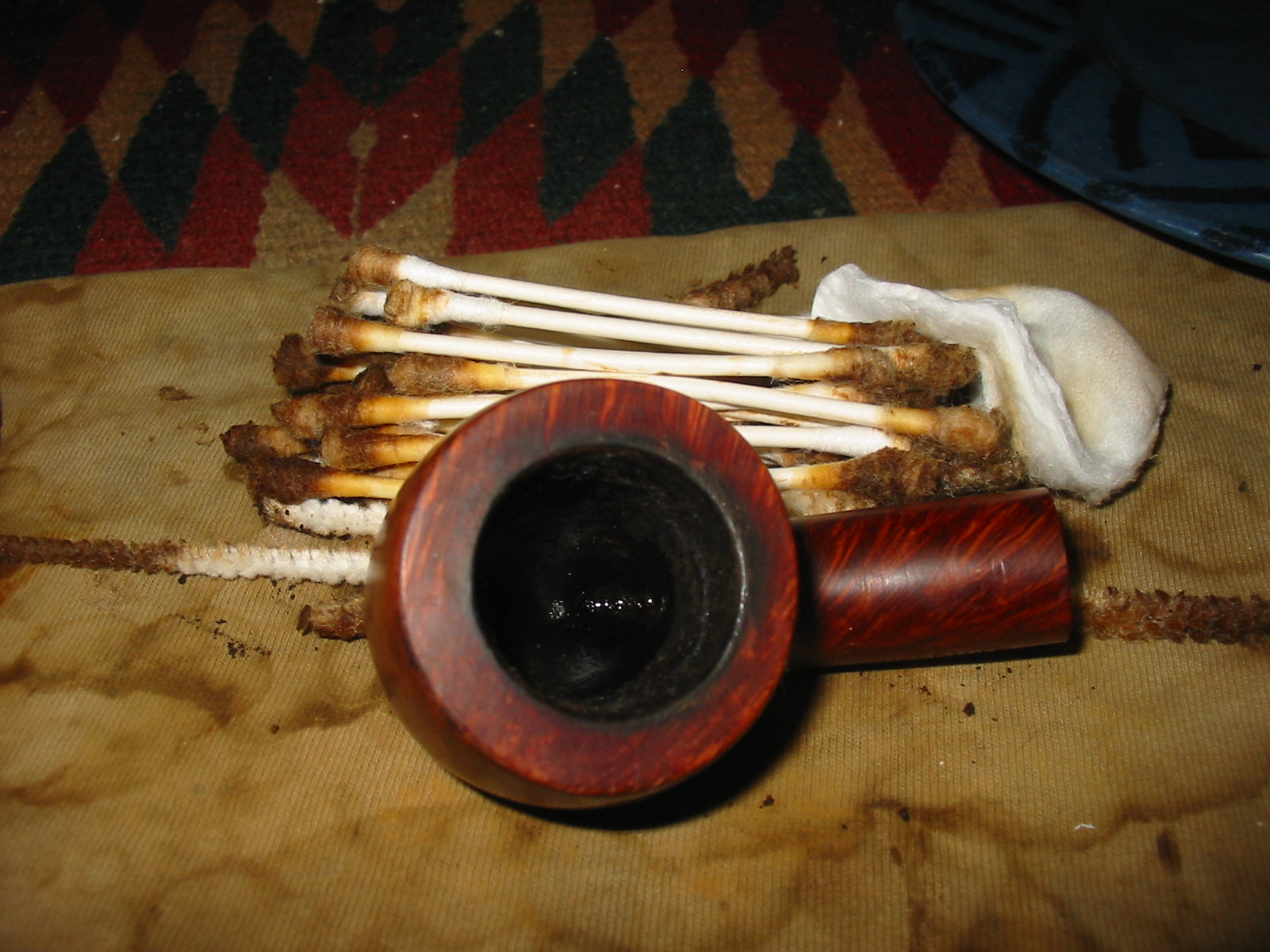 I scrubbed the inside of the shank with Everclear and cotton swabs. I cleaned the airway with bristle pipe cleaners and then fluffy pipe cleaners. I continued to scrub it until the pipe cleaners and cotton swabs came out clean. I cleaned the rim of the bowl with saliva and a cotton pad until the grime was gone. It took a bit more than a cotton pad and saliva so I also used a very fine grit sanding block to knock off the remaining tar, being careful to not break the finish.