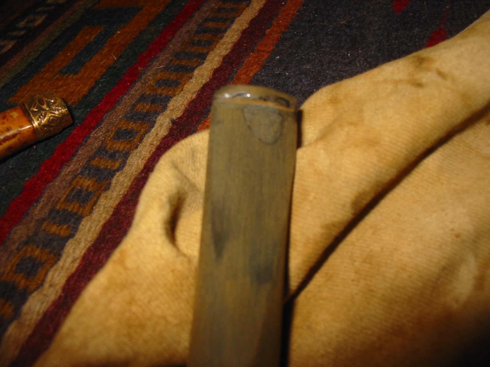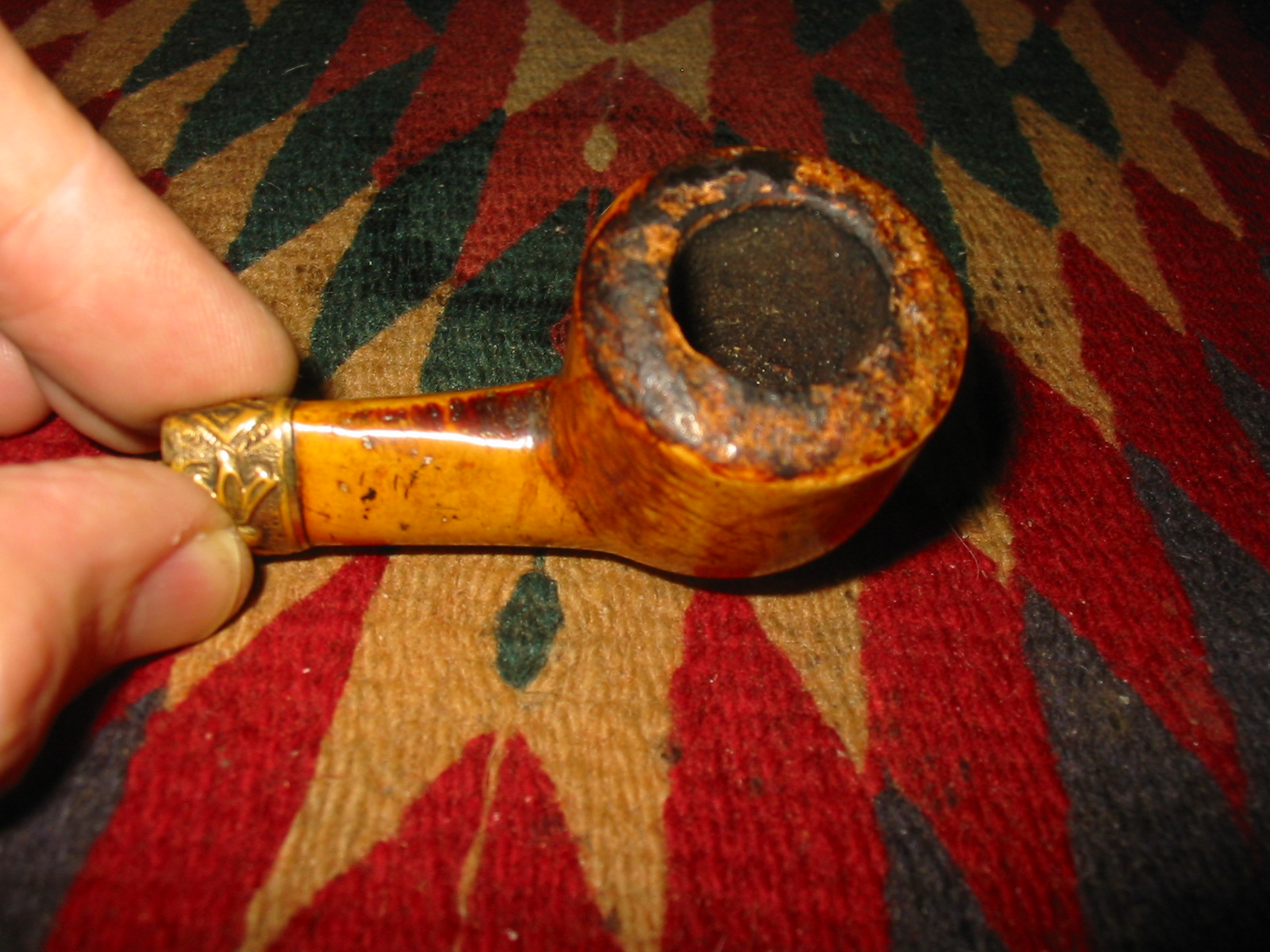From the photos it looked to be in rough shape. The pipe case said it was a WDC but I have no way of knowing if that is true. The gold filigree on the band looks like the old WDC pipes of the late 1890s but I am still uncertain as to the maker. It was in rough shape as can be seen from the photos. There were many scratches and gouges around the outside of the bowl. The shank had marks on the top that looked like someone had taken a file to it. The rim was probably the worst. With the rough edges on the back right side of the bowl the rim/top appeared to be angled to the right side and worn down. The tar build up was heavy in the bowl and on the rim. The tenon was broken off in the shank. It appeared to be an old bone tenon and a bone insert in the mortise that was threaded to take the screw in tenon. I am assuming the pipe probably had an amber stem in its first appearance in the shop but that was long since broken and lost. The WDC case was also very rough – the edges were worn away, the wood broken and a hinge dangling unused. The inside was badly stained.