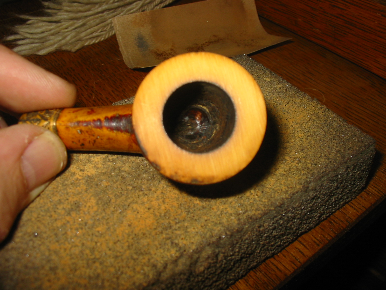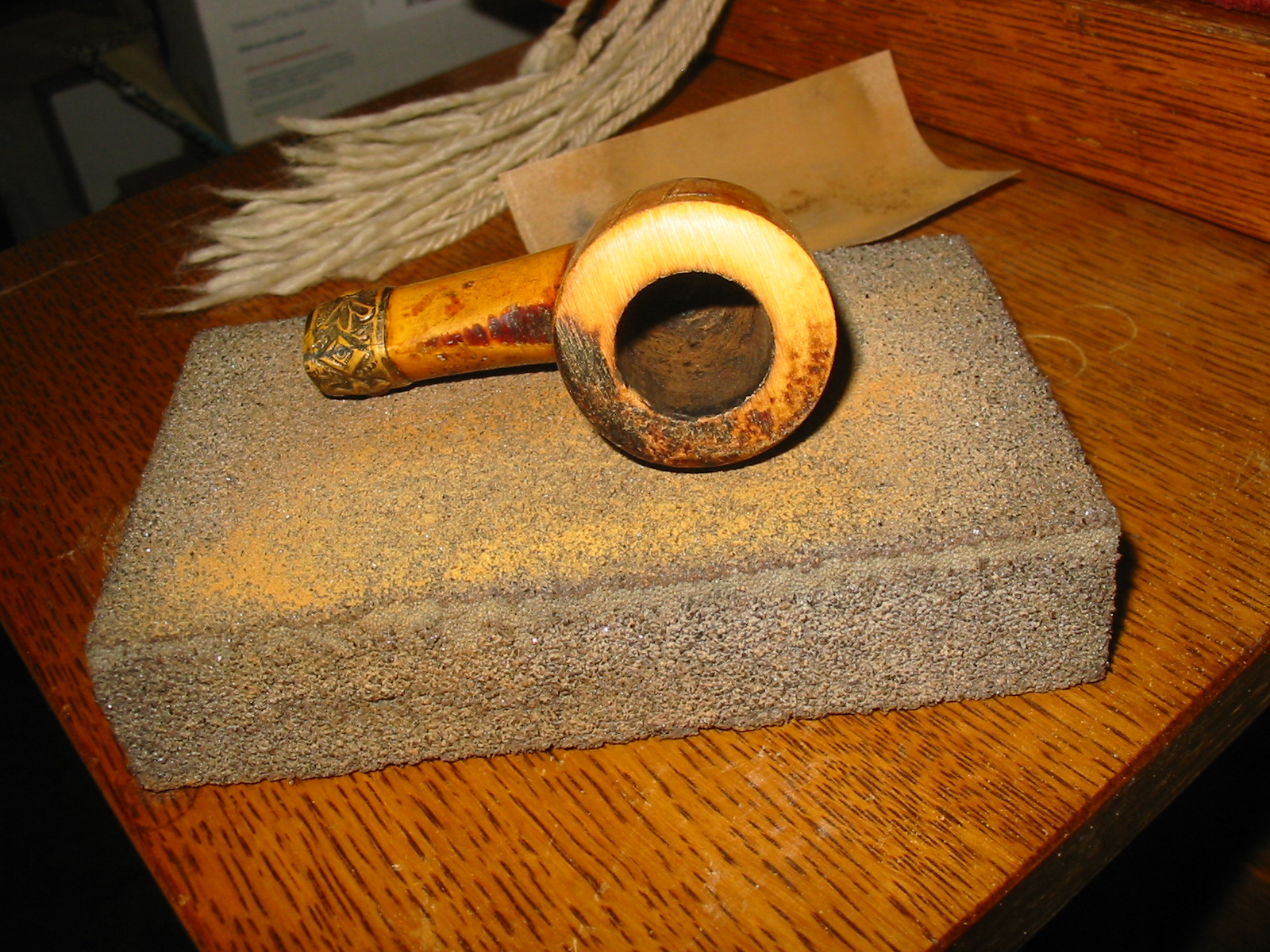 I took the pipe bowl back to the work table and set up a coarse sanding block on my worktable to top the bowl of the meer. I have used this block in the past with good success on the softer meerschaum material. I placed the bowl, rim down on the surface of the block and sanded it in a clockwise direction (no reason for that other than I am right-handed). I sanded it, checking often to see how the rim was cleaning up until the surface was clear and the top of the bowl once again level. Surprisingly I did not have to remove too much material from the rim to clean up the surface.