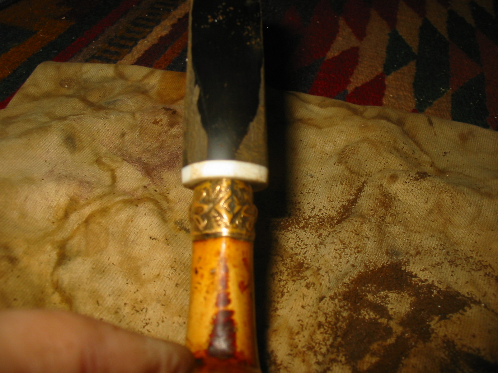 I buffed the stem with White Diamond and a blue plastic polishing compound to bring out the final shine on the stem. I hand waxed the meerschaum with beeswax and hand buffed it with a shoe brush. The next four photos show the finished pipe with the new stem. I like the marks and scratches in the meer as they seem to speak of the long journey the pipe took to get to me. The white Lucite band on the stem fits nicely in my thinking against the gold of the filigree band. The slight bend it the stem works nicely for me. From the last two photos you can see the oval shape of the stem now that it is completed. It has come a long way from the round stem I received as a gift from Ron.