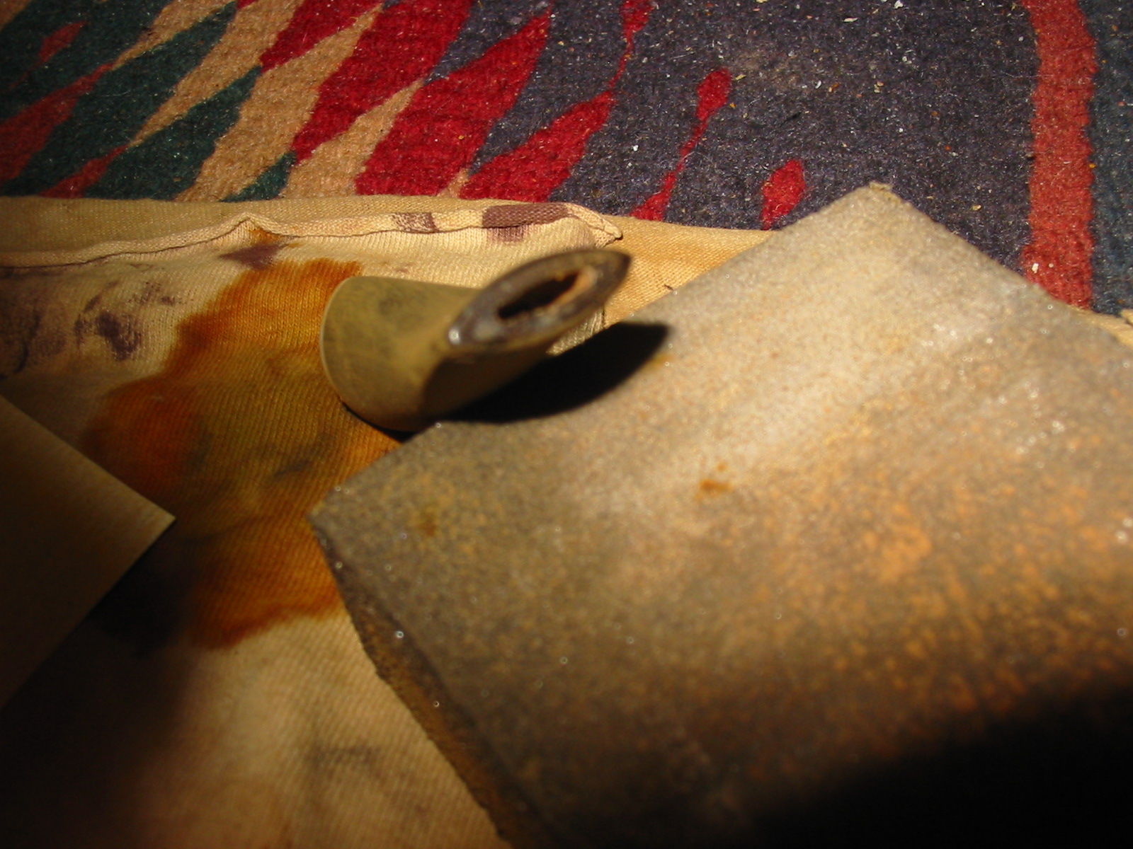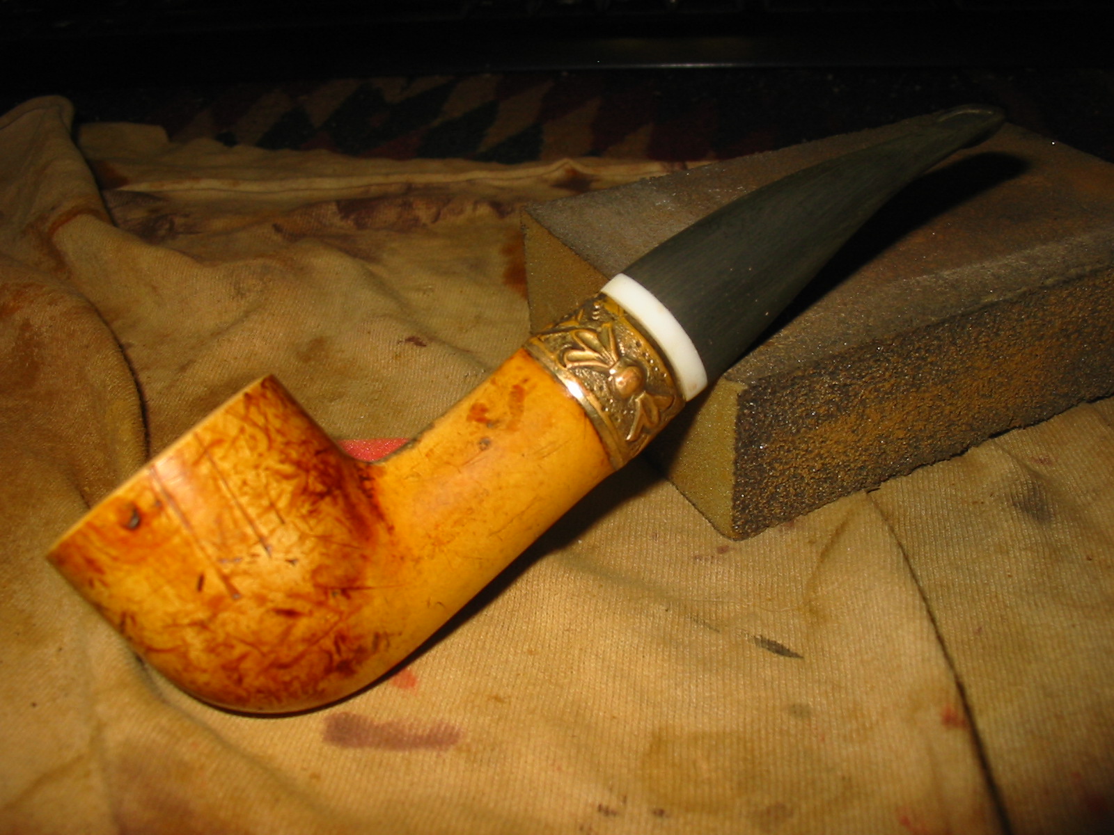 Yesterday afternoon I came home from work early and found a package awaiting me – I knew that the meer had arrived. I had to laugh when I cut open the box – it had a previous label a Funeral Home in Ohio. I don’t know if that was a commentary on the pipe bowl that resided inside the box or if a funny coincidence. I cut the tape and opened the box. The pipe inside was both in worse shape than I had imagined from the seller’s excellent pictures and in better shape. The meer under the band was cracked as can be seen in the photo above and that was as it was when it arrived. The scratches in the surface of the bowl were not as deep as they appeared in the photos and the pipe when place on the rim on a flat board was actually not slanted to the right – the damage to the outer edges of the right back side made it appear worse than it actually was in reality. The next photos show the pipe on the work table just out of the box.