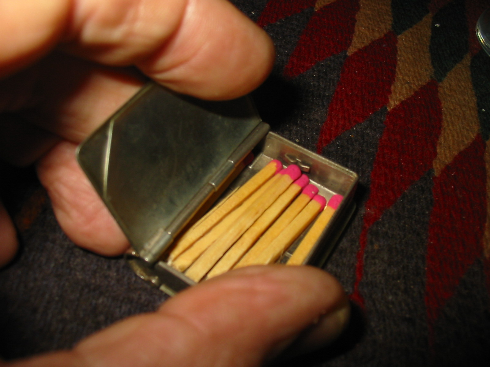 The match safe arrived and I examined it carefully. It was shaped like a book. The front and the back cover were originally painted with a red paint and remnants of that remained on the centre portion inside the corners. On the spine of the book the smooth portions also show remnants of red paint. The notched spine and the page area of the book were striker areas on the book. The book itself measures 1 7/8 inches tall by 1 3/8 inches wide. The closed book is ½ inches thick. The front and back covers are spring loaded. The front cover when opened contains the area to store the matches. I filled it with some wooden matches to enable you to have an idea of what it looked like. The back cover when opened contains two spots for stamps to be stored.