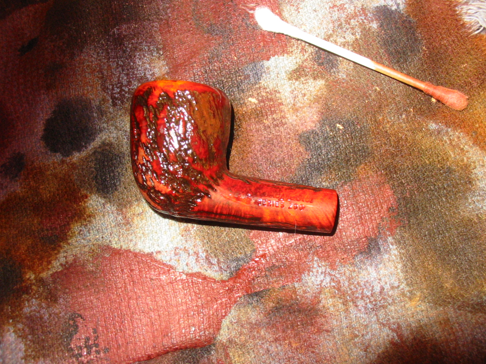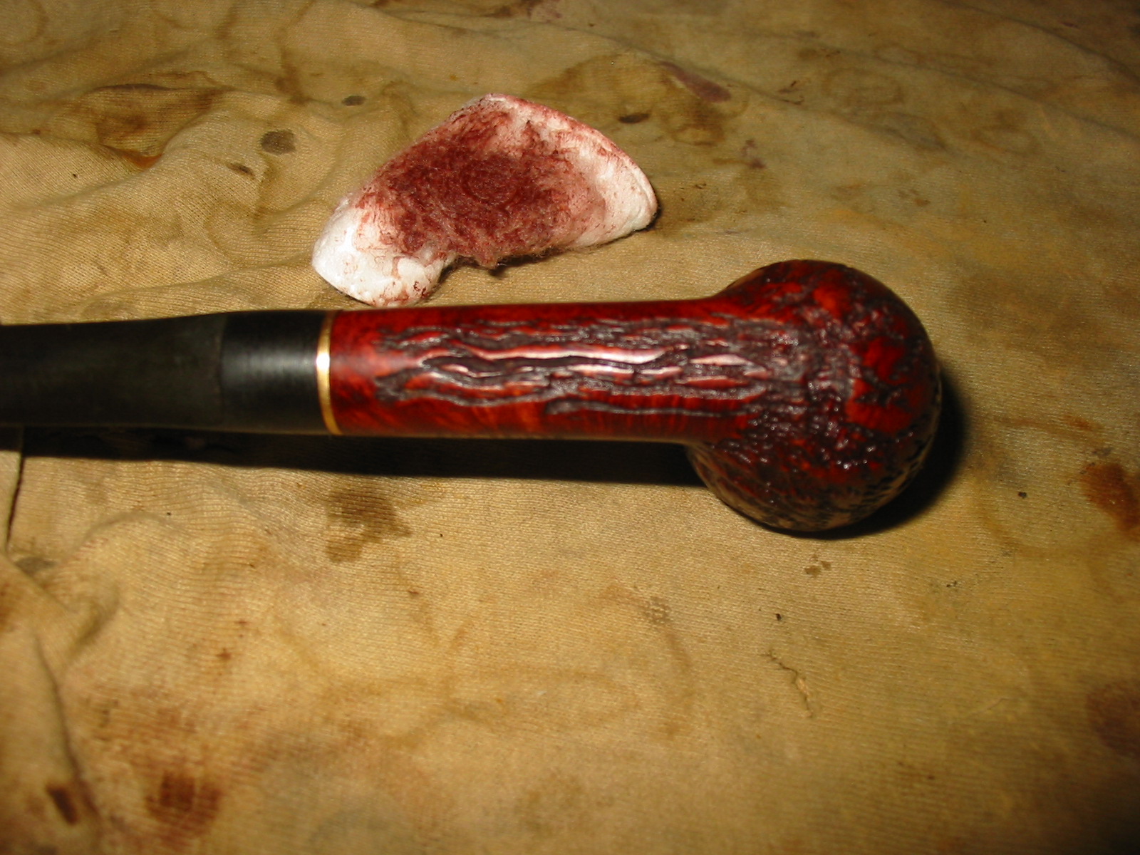 I restained the pipe with a Danish Oil Cherry stain applied with a cotton pad. I need to be able to work the stain into the deep rustication and also on to the smooth portions of the shank and rim. The rim took several applications to match the rest of the bowl.