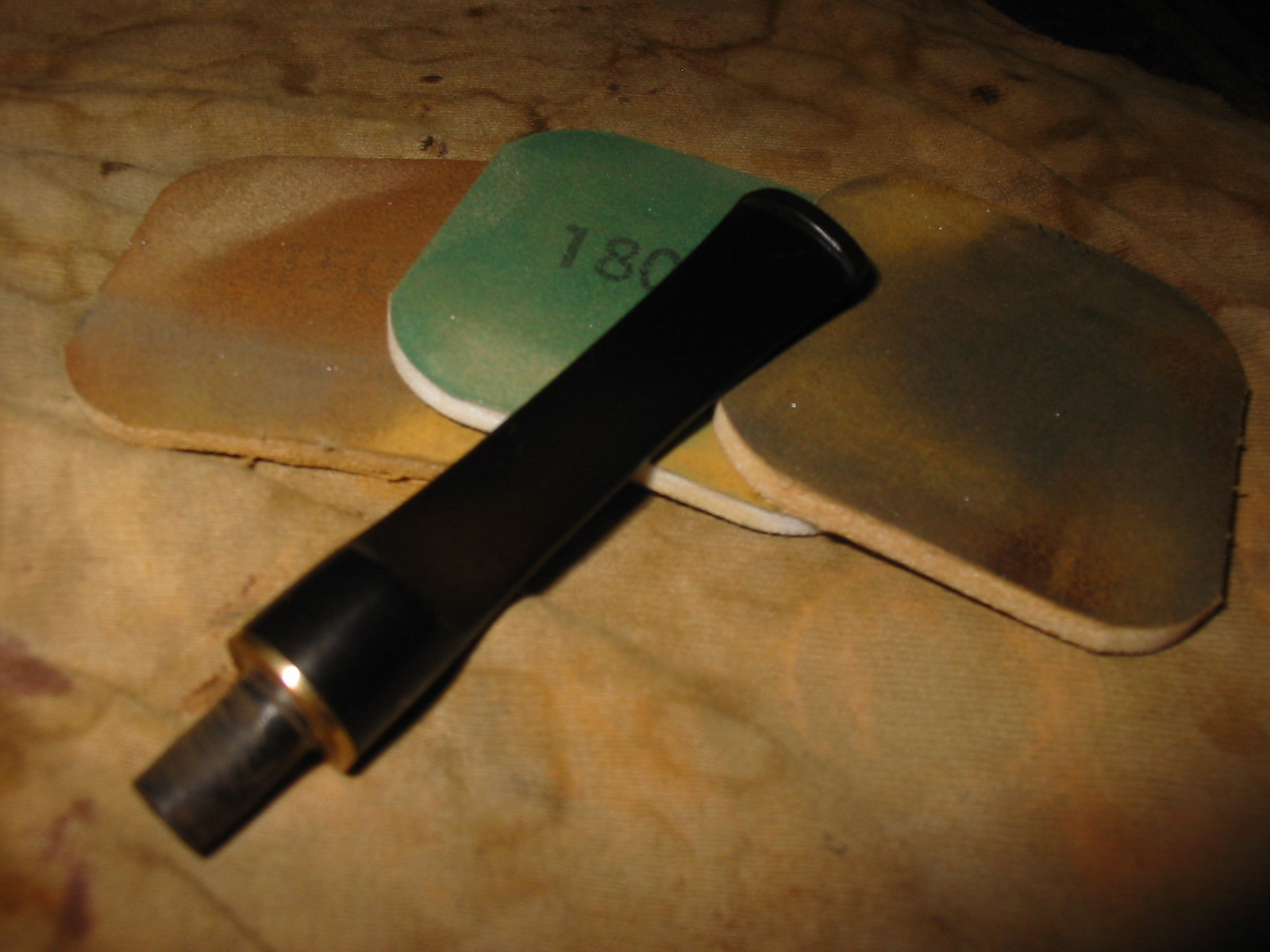 I used a sanding drum on a Dremel to shape the saddle diameter to meet that of the shank. The sanding drum worked well on the vulcanite and the brass. Due to the difference in hardness of the two materials I had to be careful to not cut the vulcanite deeper than the brass. The idea was to make a smooth transition between the two materials on the stem.