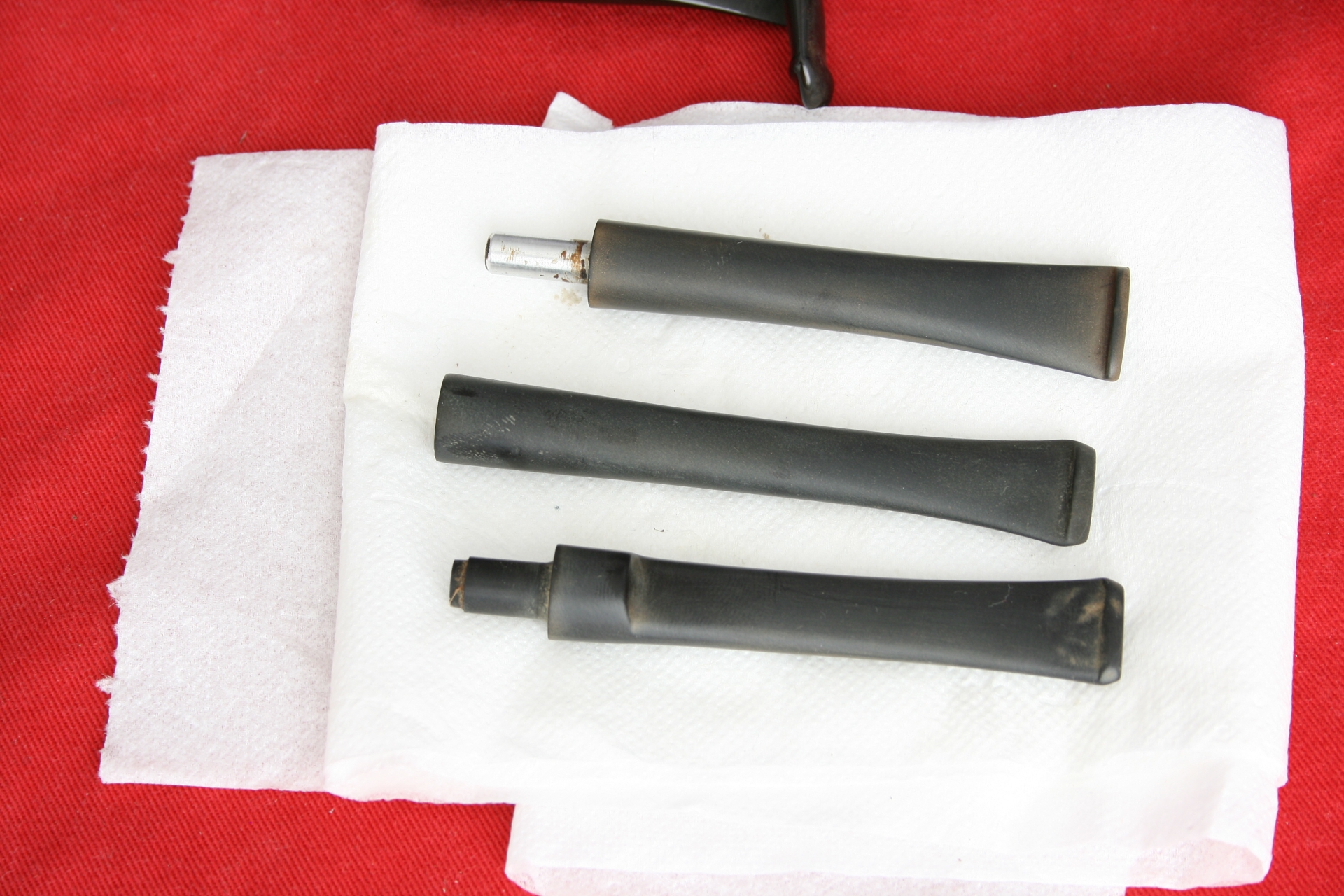 I put the stems to the grind wheel and the oxidation came off way faster than if I would not have soaked them. Also the liquid that came off the wheel and stems was way darker as I mentioned before. At this time I also sanded the hard to get edges with 600 grit paper wrapped around a modelling file.