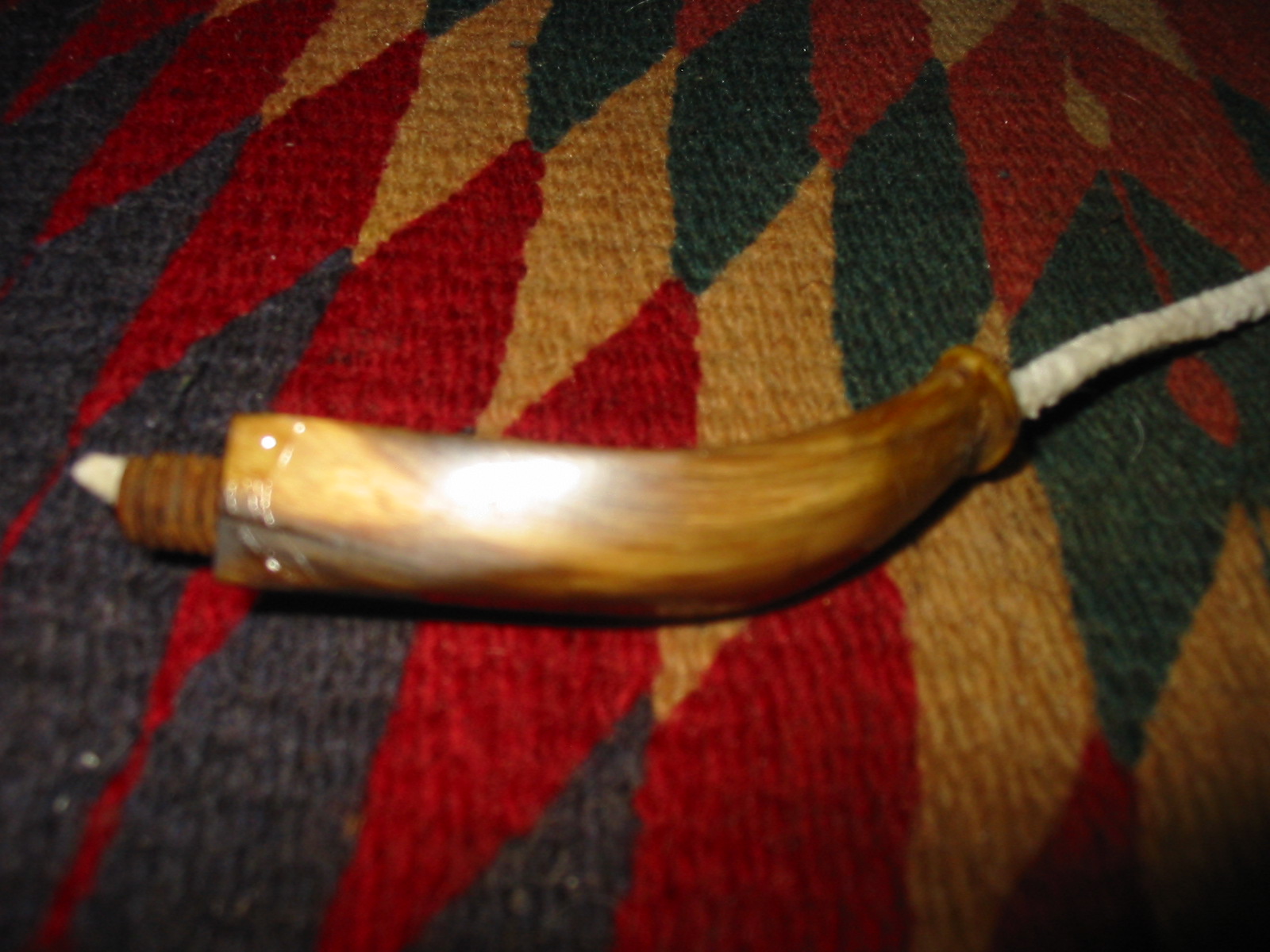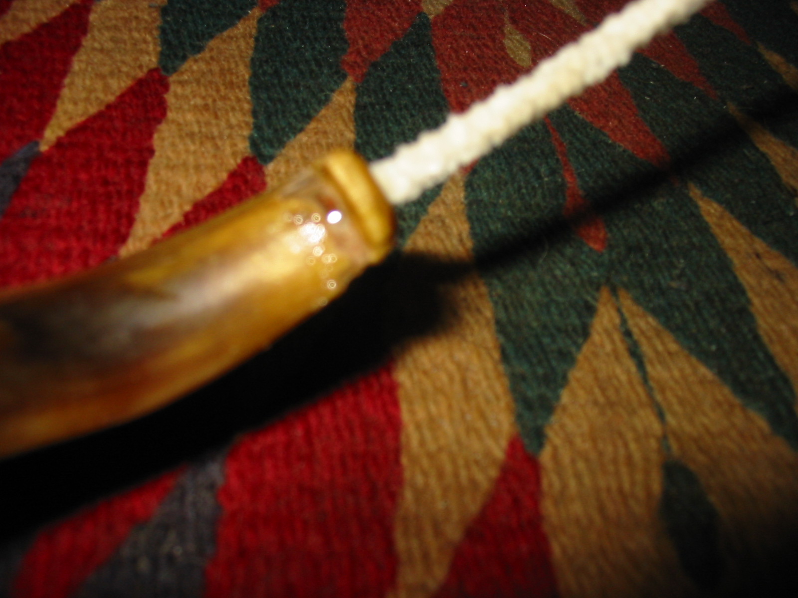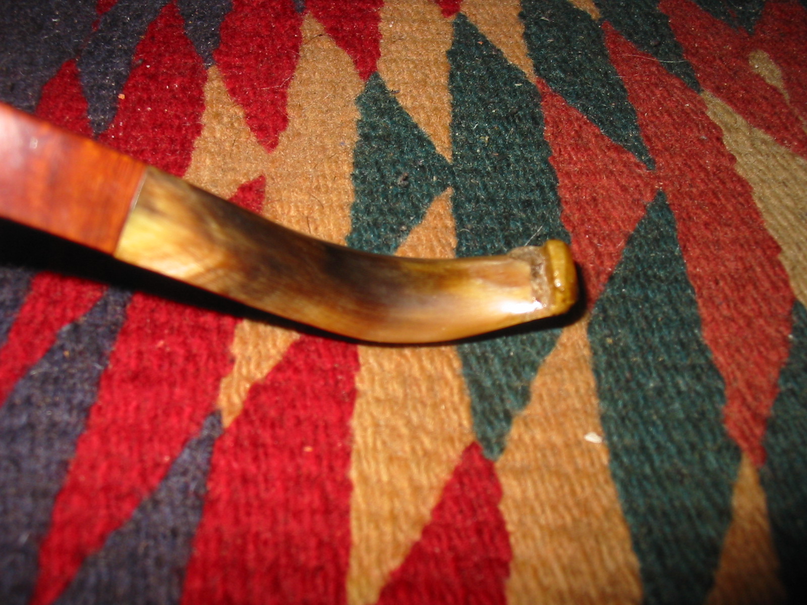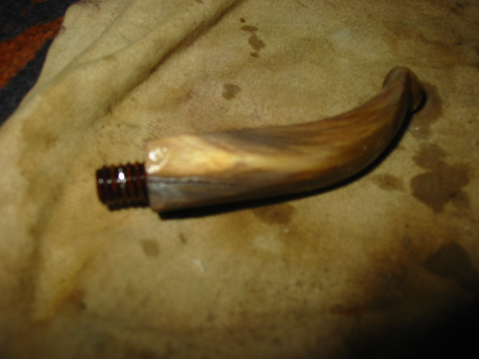The next two photos show the stem after the patches had hardened. Though the photos are a bit blurry, the shininess of the spots where the superglue patches were applied is very clearly visible. Those areas would need to be sanded smooth to match the surface of the surrounding horn.
