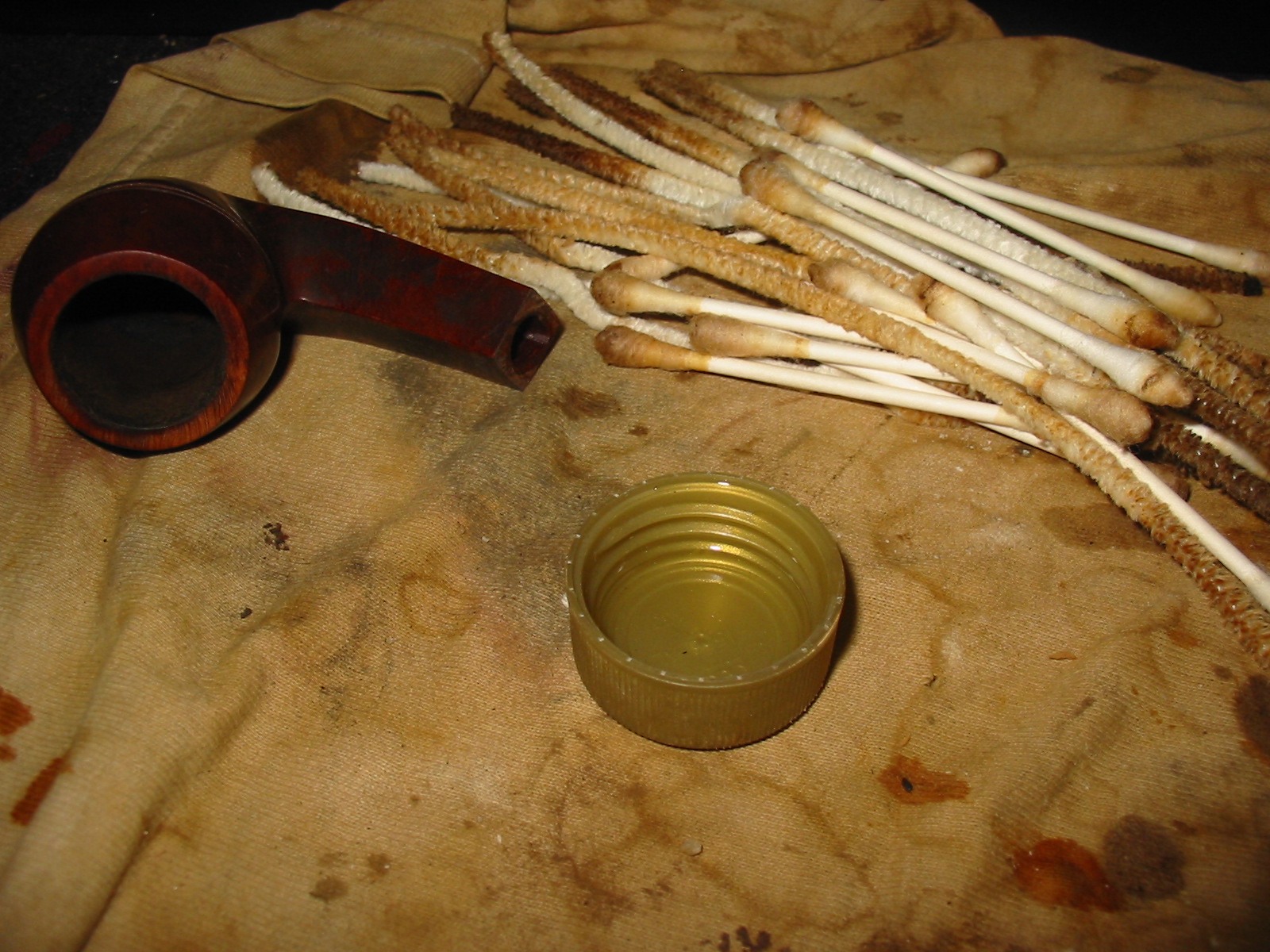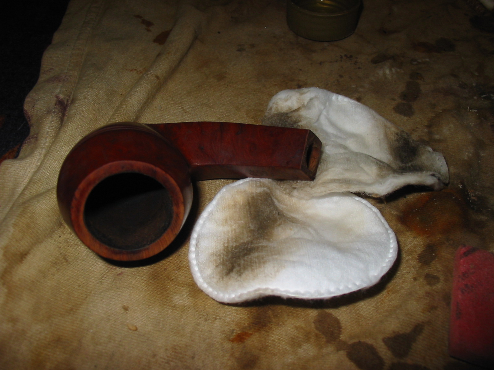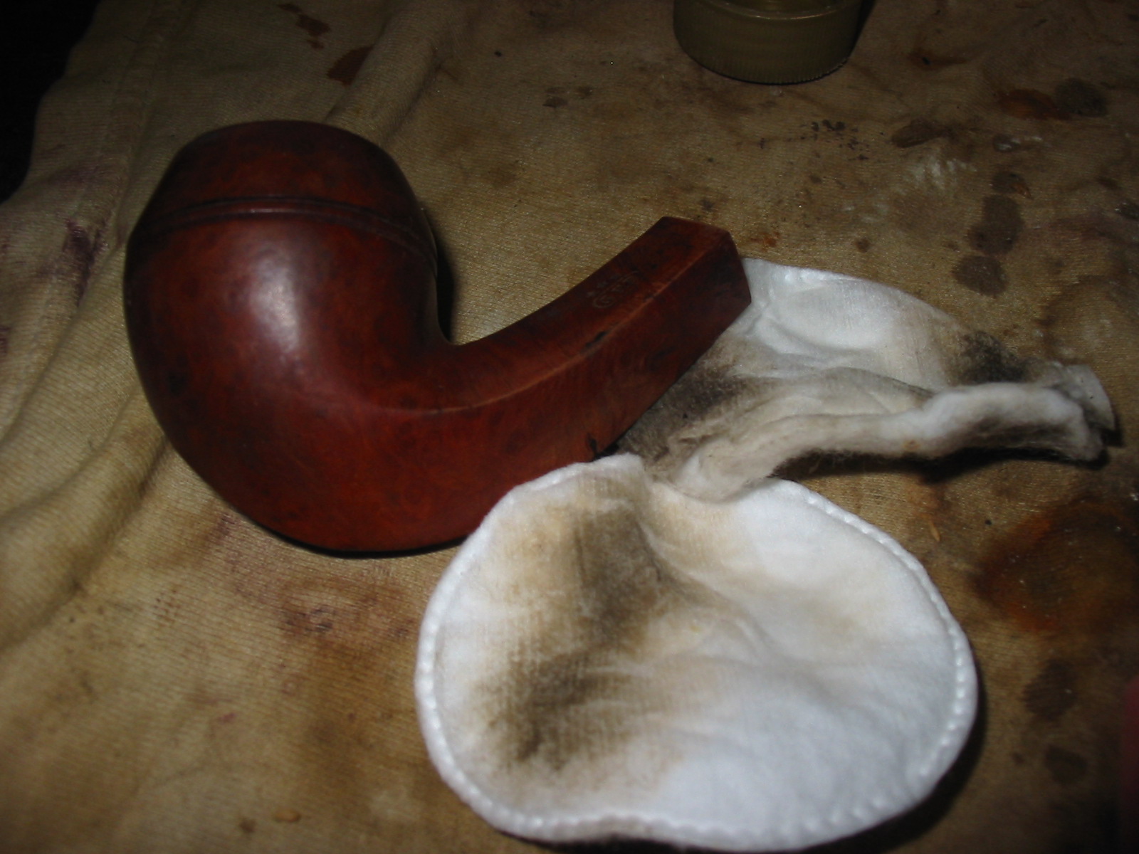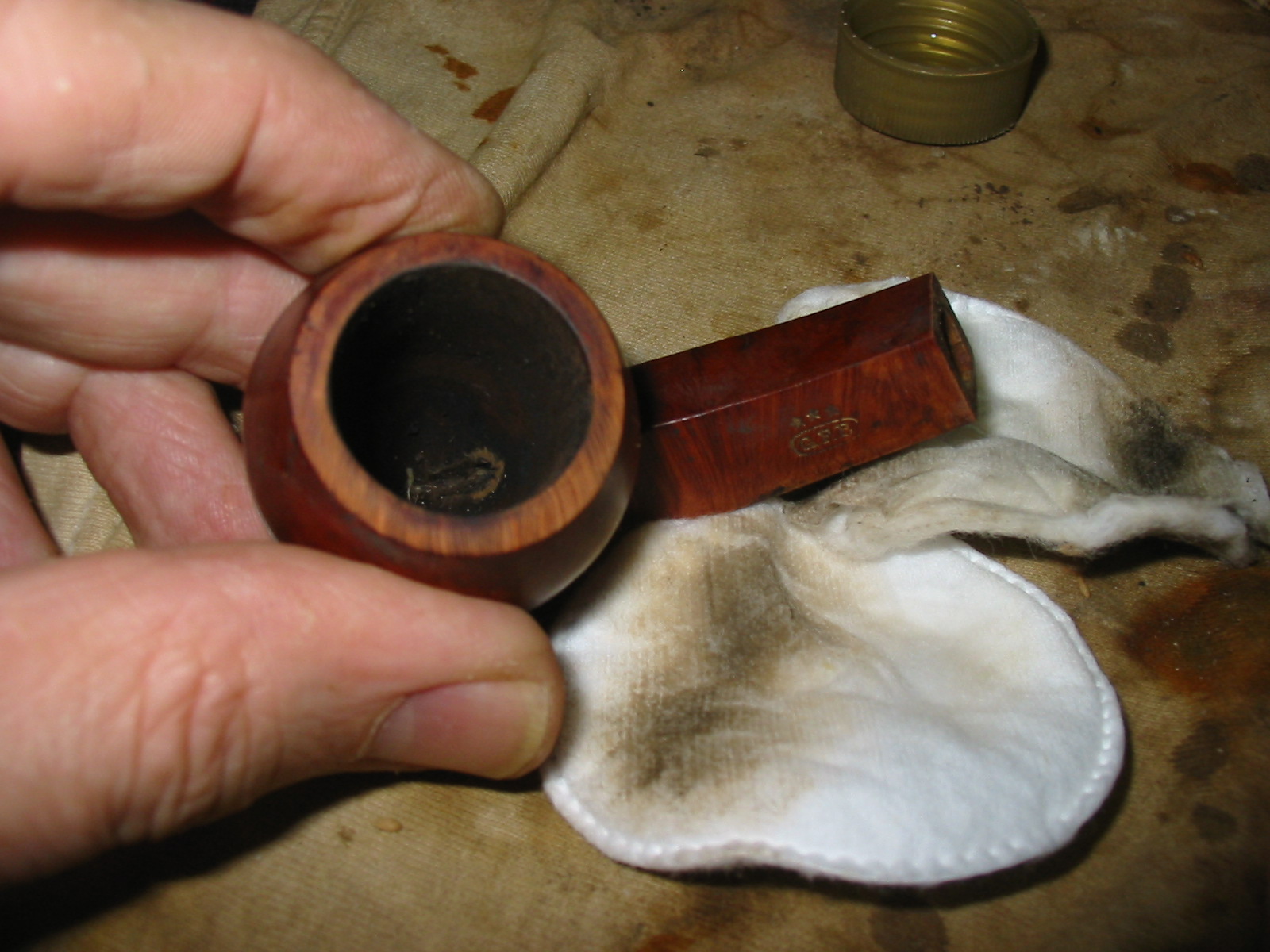 I sanded the patch on the shank of the pipe with 220 grit sandpaper and also medium grit sanding sponge to remove the excess glue from the patch. Then I wiped the bowl down with Everclear on a cotton pad. I decided not to use acetone as the stamping on the shank was filled with a gold paint and was still visible. I did not want to damage that stamping. I carefully worked the Everclear around the stamping so as not to get any in the grooves of the stars and GFB stamp.