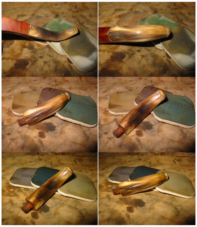 When I returned the glue was hard and the patch a solid bubble on the surface of the stem. I sanded it with the medium grit emery paper and then 220 grit sandpaper to remove the over fill. I always over fill the spots as the glue shrinks as it dries. I have learned that it is easier to remove the excess than to continue to fill and sand repeatedly. I sanded it with a medium grit sanding sponge and then went through the grits of micromesh sanding pads again from 1500-12,000 grit. When I had finished I rubbed the stem down with Obsidian Oil and set it aside to absorb. Once done I buffed it on the wheel with multiple coats of carnauba wax.