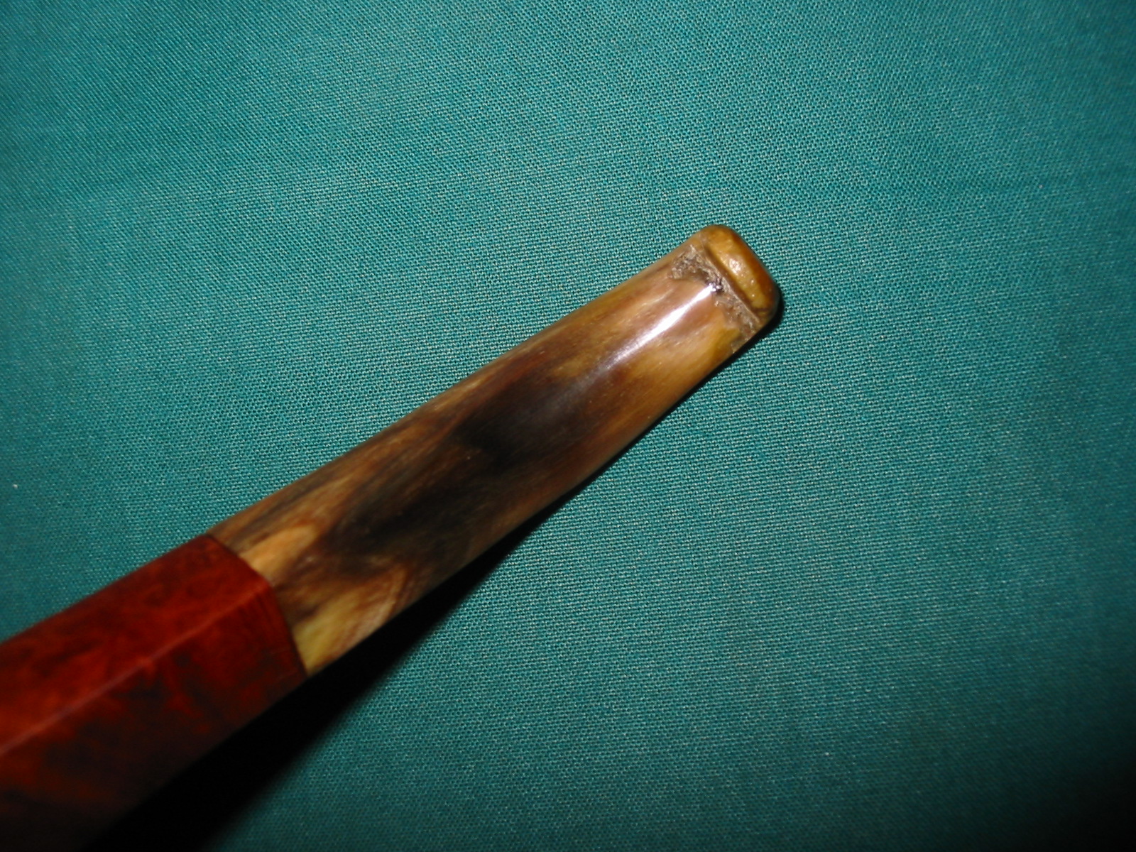 I find that photographing stem damage is difficult and my photos can be out of focus. But I now have a tripod to help with the clarity of the photos (did not get it until after I had started the repairs on this stem. Ah well sorry about the clarity of some of these). When the pipe arrived I took it apart and examined the holes on the end of the stem. Under the lens it was clear that it was not a worm hole at all. Rather it had been bitten and the stem had crumbled in that area. It did not go through into the airway so I think that the previous owner had scraped out the crumbled area of the horn stem for cleanliness and just kept smoking it. That was encouraging to me as it meant that I could repair and not worry about an old “worm” somewhere in the horn stem chewing his way out later! The next two photos show the extent of the damage to the area