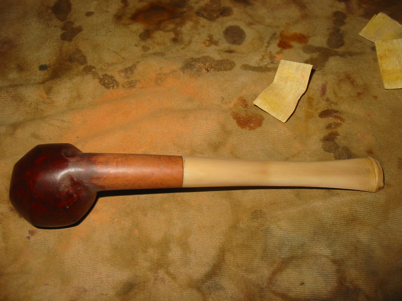 I wiped the bowl and shank down with acetone on a cotton pad to remove the varnish finish and some of the stain on the bowl in order to make it easier to match the stain on the newly sanded shank and the bowl. I also sanded the bowl, shank and stem with a fine grit sanding sponge to remove scratches left behind by the sandpaper and to prepare the stem for sanding with micromesh sanding pads.