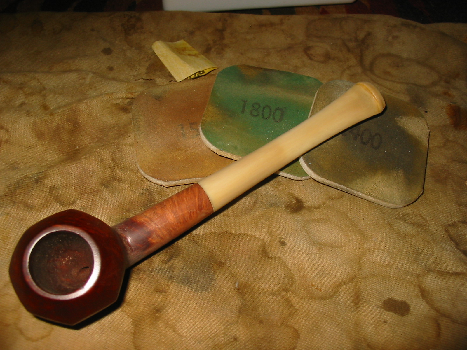 I sanded the entire pipe and stem with micromesh sanding pads. I wet sanded the stem and the bowl with 1500-2400 grit sanding pads and dry sanded the bowl alone with 3200-12,000 grit pads. I did not want to make the briar to smooth to take a good coat of the stain.