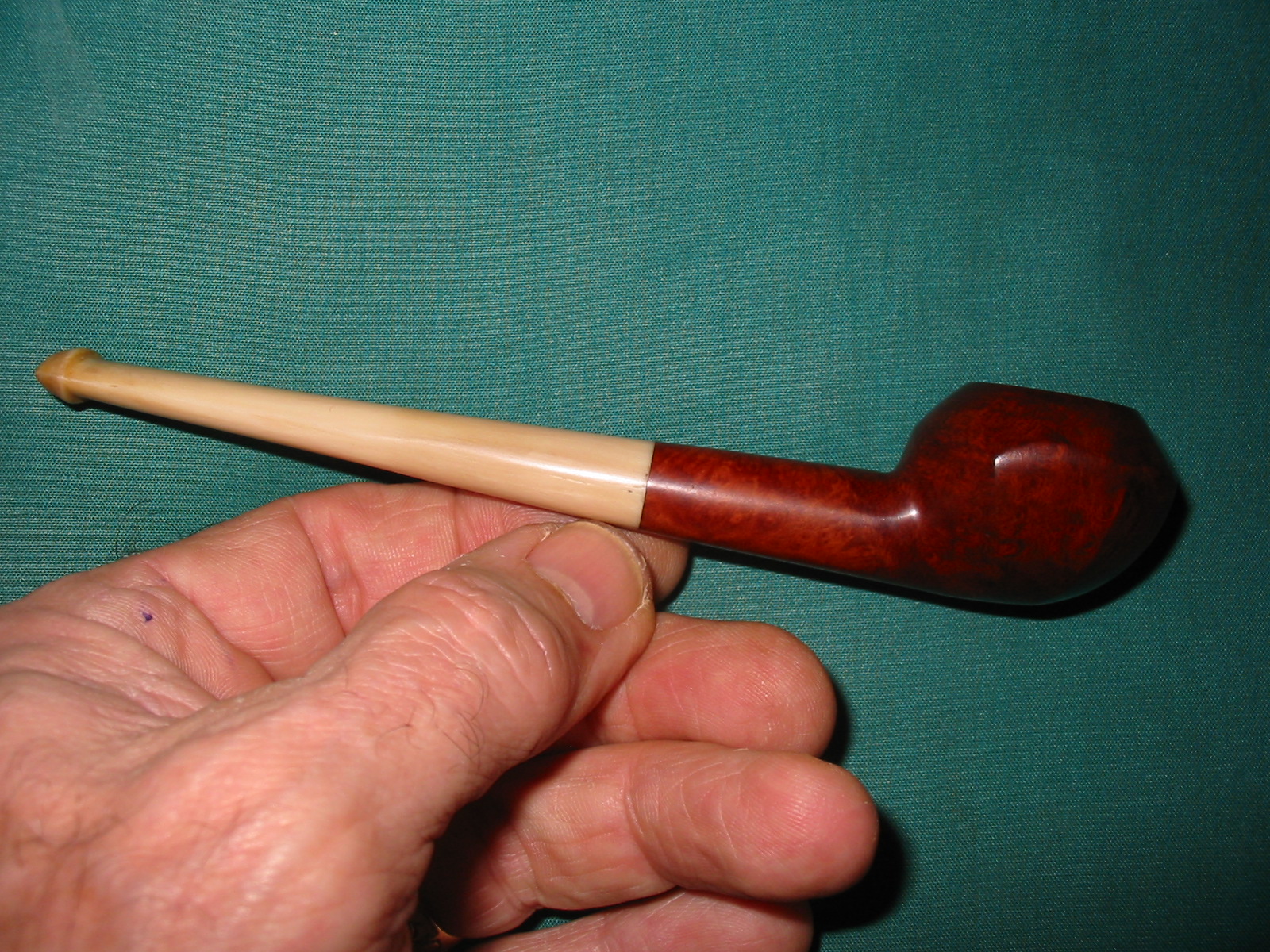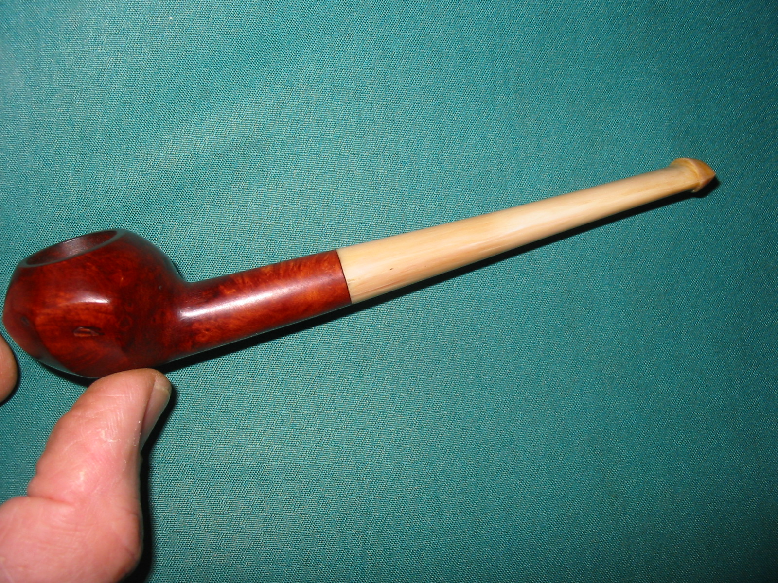 Once the stain was dry I buffed the bowl with White Diamond to give it a shine and then reinserted the stem and lightly buffed the stem with White Diamond as well. The nylon stems take a very soft touch or they are easily damaged. I gave the bowl and stem several coats of carnauba wax to protect them and then lightly buffed the pipe a soft flannel buffing pad. The finished pipe is pictured below. It is not a big pipe in any sense but should be a great flake pipe. The second photo below gives an idea of proportion by the inclusion of my hand with the pipe. The yellow nylon stem approximates the unique colour and look of the horn stem that must have originally graced this little bowl. The stem is thin and the new taper gives a very delicate look to the new pipe.