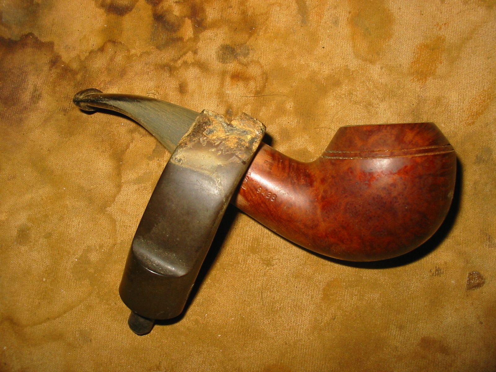 I am always on the lookout for Rhodesian shaped pipes and 9438s in particular. I have a few that I picked up before they became so sought after. So when I picked up this 9438 Rhodesian for $9.99 on Ebay recently I figured I had a deal. I am pretty sure that the reason for the low price was the condition of the stem and the look of the pipe in the photos on the sale. I was hoping that the bowl was actually in better shape than it looked. I knew that the stem was ruined and a real mess but the bowl looked like it had some life left in it. To me the price it was listed at made it worth bidding on and I won it. I had several possible solutions in mind for the pipe if the bowl was as salvageable as it looked. One possibility is that I have a terribly over reamed 9438 that I could salvage the stem from and utilize on this pipe. If that does not work, my second possibility is to make a new taper stem for it. At the moment I am leaning toward the taper stem. I have included the photos from the seller to give an idea of the pipe’s condition.