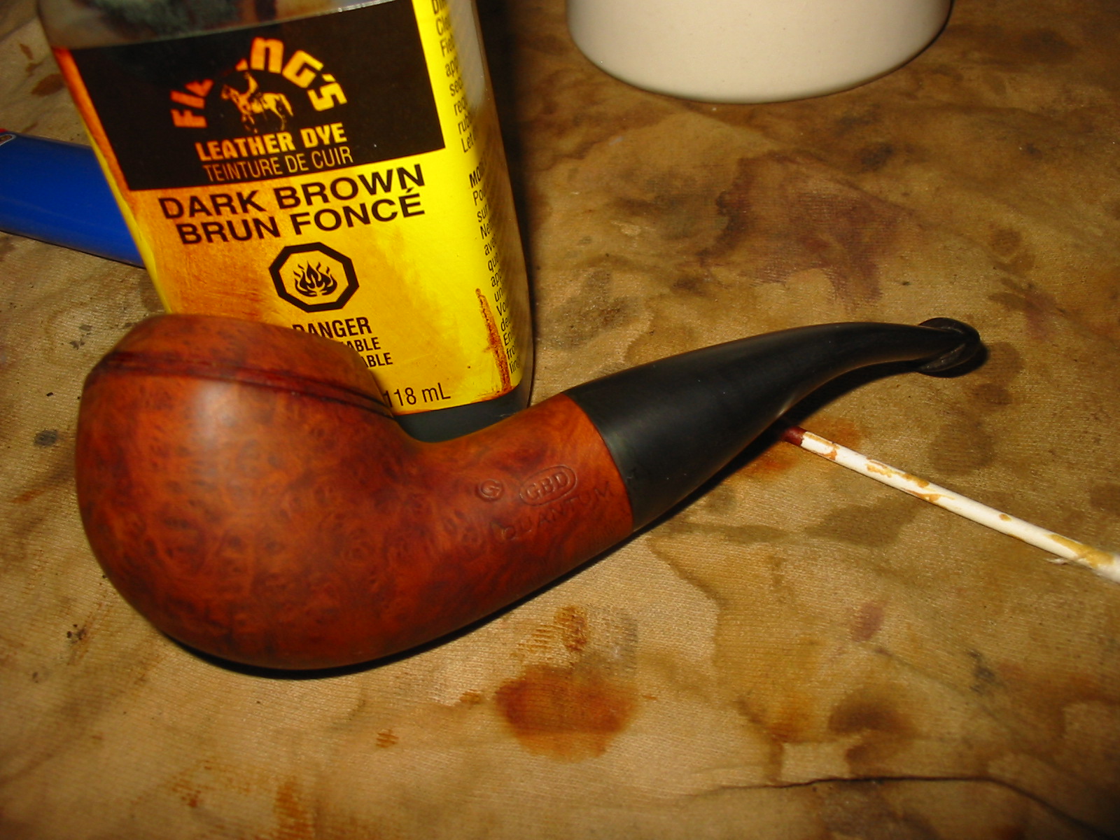 I warmed the briar with a heat gun and then stained it with a dark brown aniline stain. I flamed it and reapplied the stain and reflamed it until it had an even coat of the brown stain. I mixed the aniline stain with isopropyl alcohol – 2 parts stain to 1 part alcohol. I wanted the grain on the pipe to show through the stain and I also was using it as the undercoat before giving it a slightly darker topcoat.