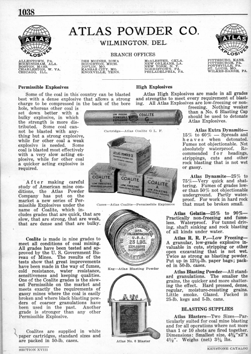 “… The Atlas Powder Company was incorporated in Delaware on October 18, 1912 as part of the court-ordered breakup of the explosives monopoly of E.I. du Pont de Nemours & Company. As part of the settlement, parts of DuPont’s black powder and dynamite business were spun off to two new companies, the Hercules Powder Company, capitalized at $13 million, and the Atlas Powder Company, capitalized at $6 million. Atlas functioned as an independent explosives and chemicals company until July 21, 1971, when it was purchased by Imperial Chemical Industries Limited (U.K.) and became its American affiliate under the name ICI Americas Inc.