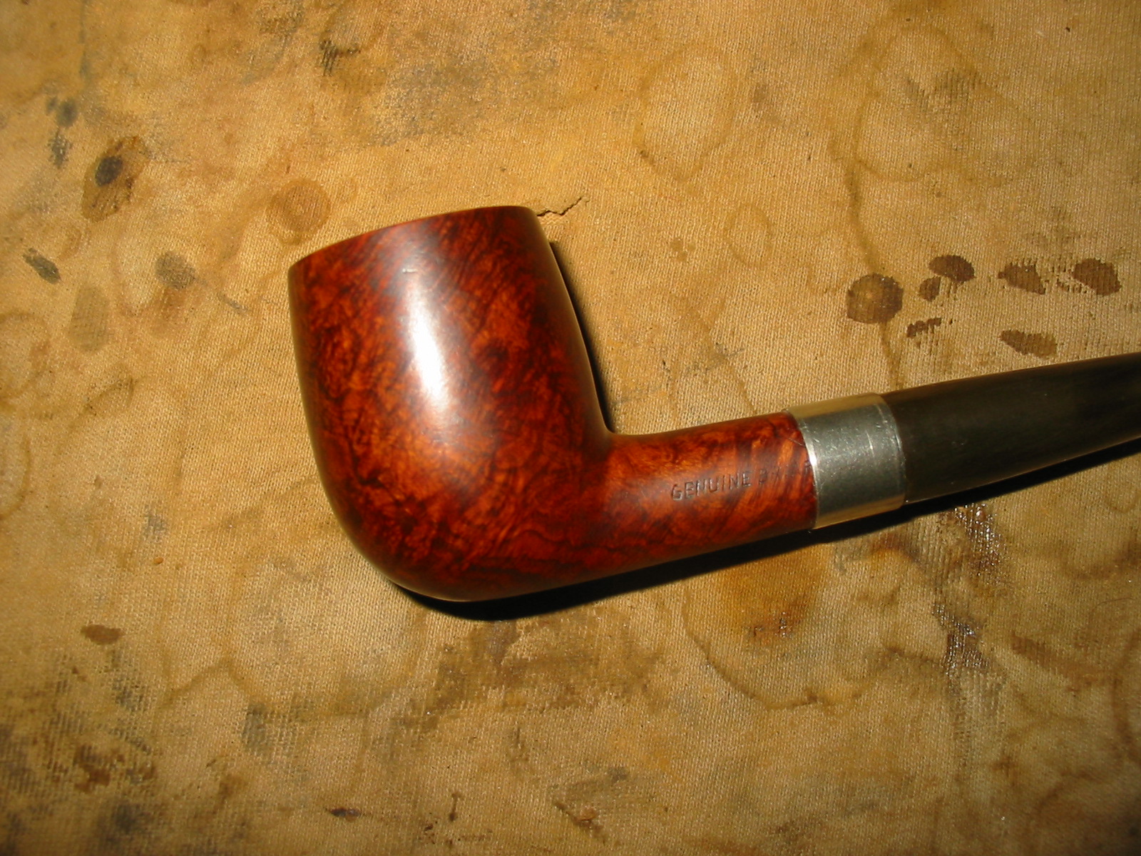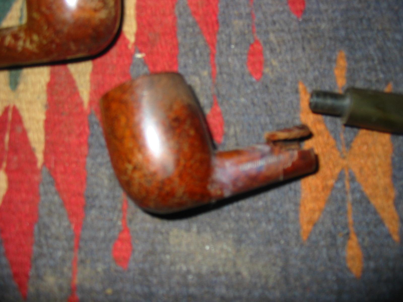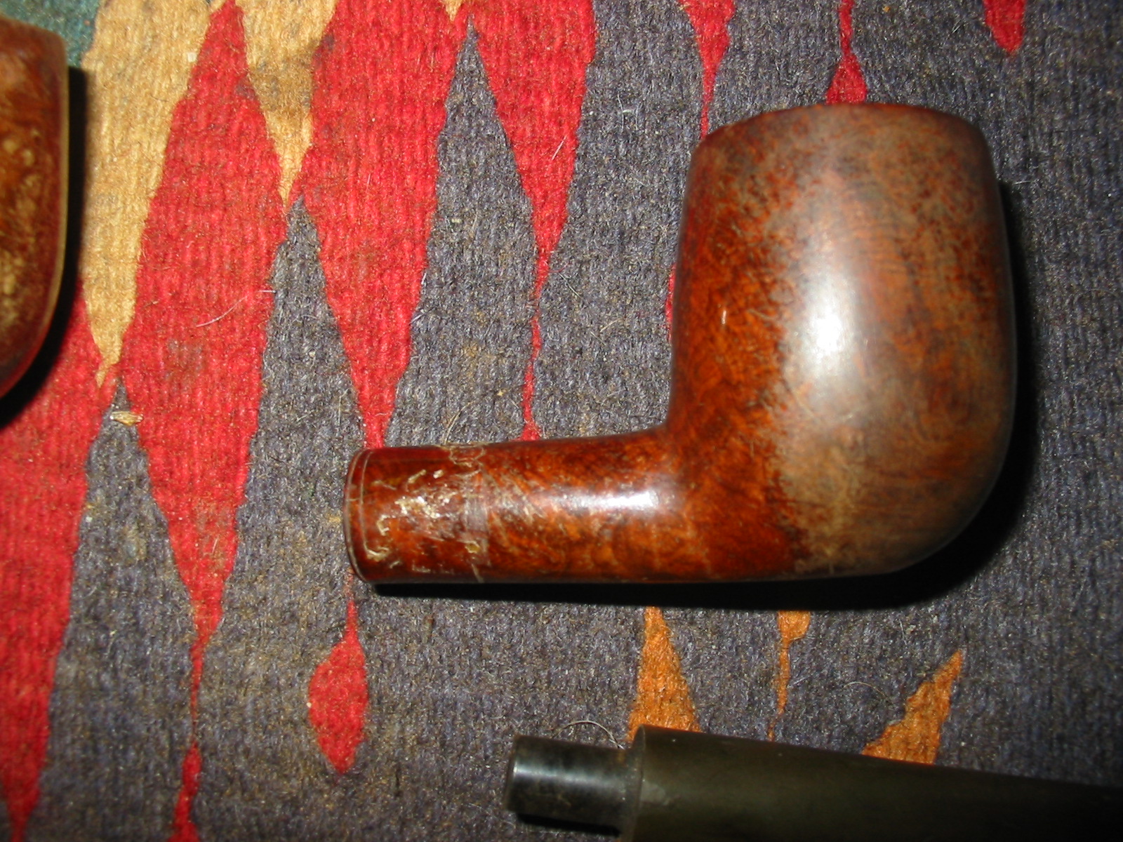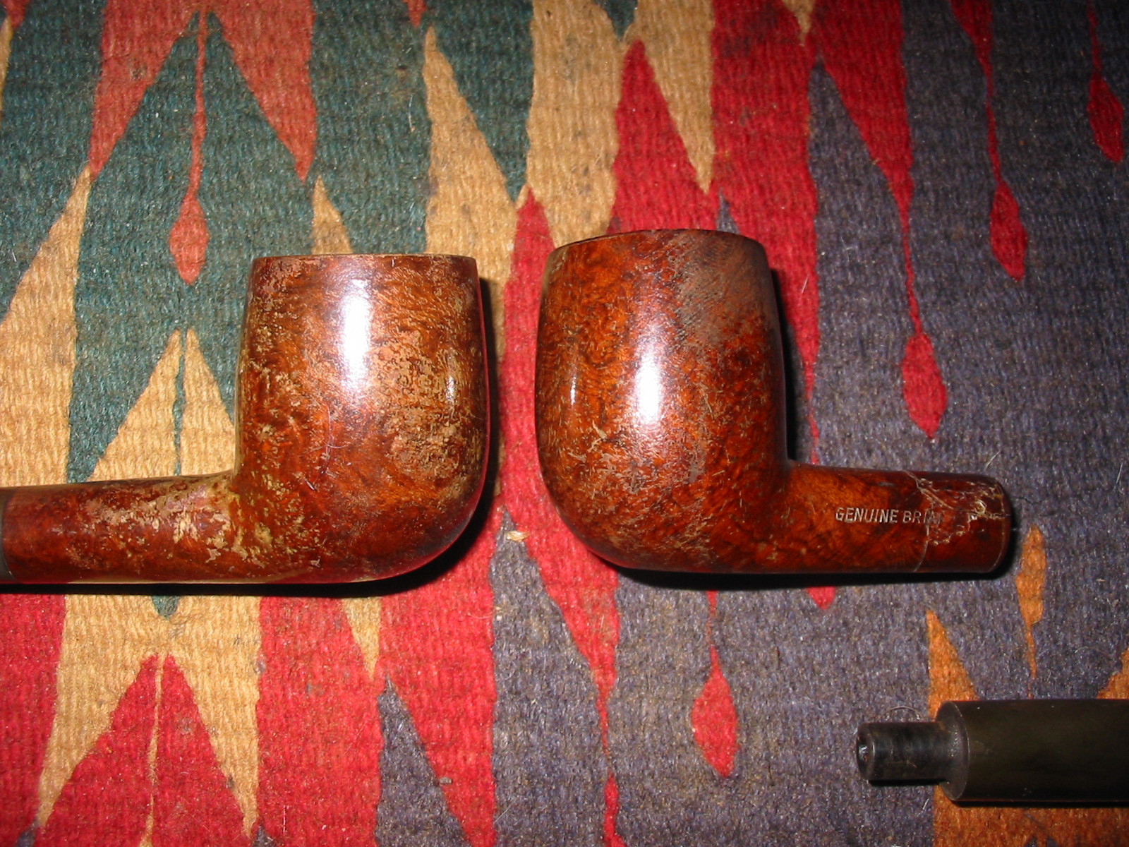 The next photo shows the pipe lying next to the other one. I wanted the stamping on the unrefurbished pipe to highlight the stamping on this pipe. The golden colour of the other stamp is very clear and the stamping on the newly stained one is still visible yet not golden. Before I finished this one, the golden stamping was missing and a black stamping was present in its place.