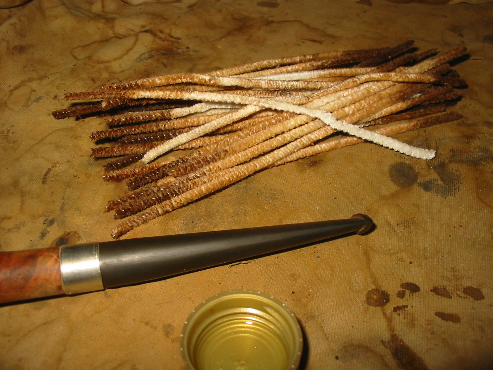 The airway in the stem was clogged and I was not able to blow air through it so I used a dental pick to reach into the airway at the tenon end and through the slot in the button. Fortunately the blockage was near both of these openings and I was able to remove the hardened tars and oils that were present. The tenon end also seemed to have some metallic pieces remaining from the stinger apparatus that was originally in the tenon (I know that it had a stinger as the other pipe still had one in place). It took many pipe cleaners and much Everclear to get the grime deposits removed from the airway of the stem. The photo below shows just a few of them toward the end of the process.
