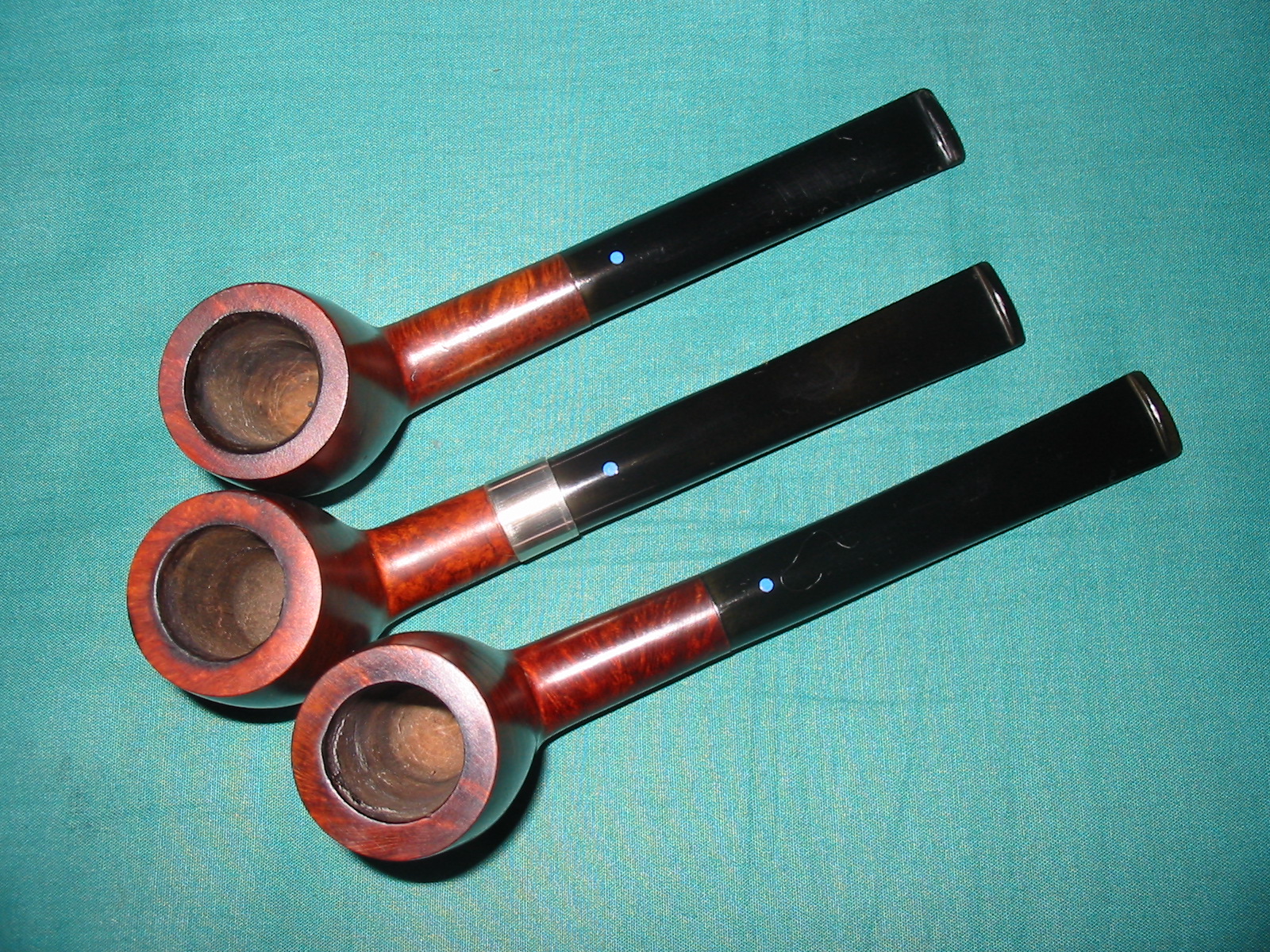 With both of the new additions finished I put them together with the previous ATLAS POWDER CO. pipe and took the following photos. The first pipe has a shorter stem because when I found it the stem had a large bite through. I shortened the length on it and reshaped the button. Other than that and the added band on the middle one the pipes are much the same. All bear the same stamping and the same blue dot. Who knows who the maker of these pipes was? I am still inclined to believe that they may have been made by Sasieni for the ATLAS POWDER CO. to be given to share holders or executives. Whatever the case may be they are smooth smoking pipes and will last another lifetime.