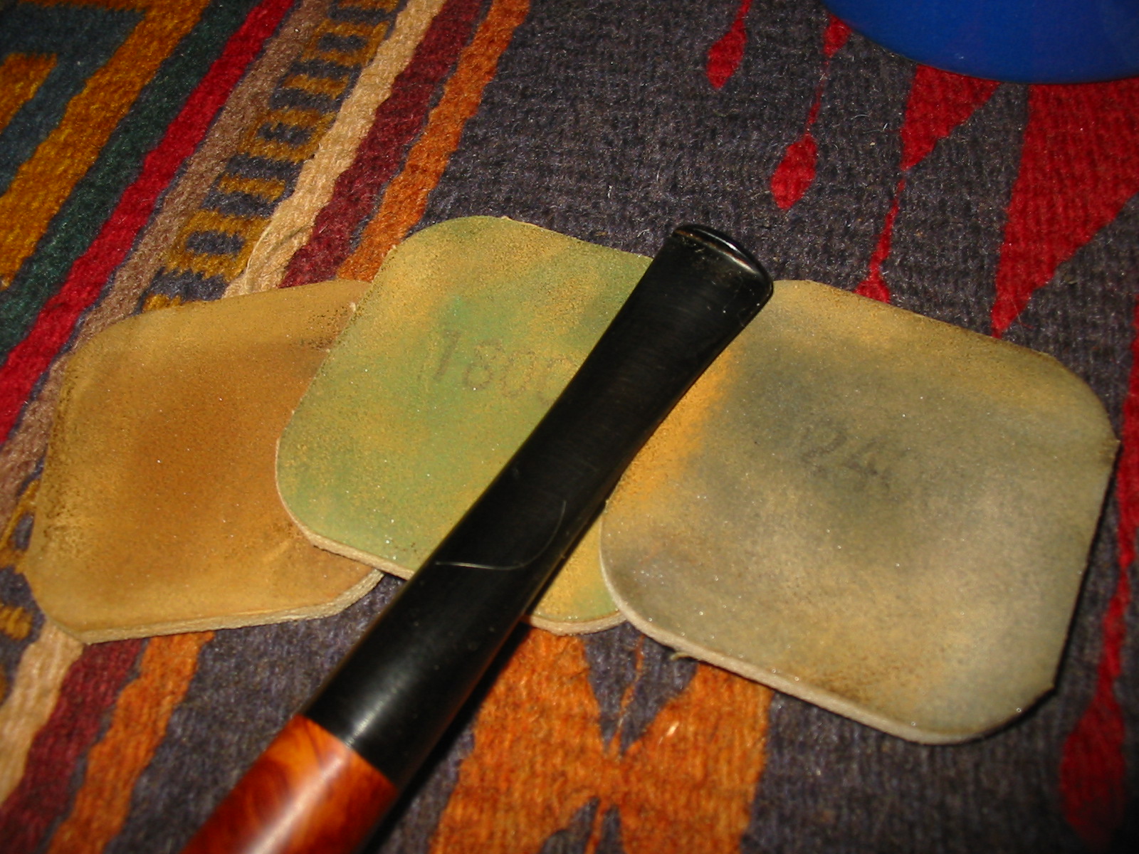 I sanded the top and bottom side of the stem with 20 grit sandpaper to smooth out the ripples in the vulcanite and remove the remainder of the tooth marks. Once I had them removed I worked on the bowl.
