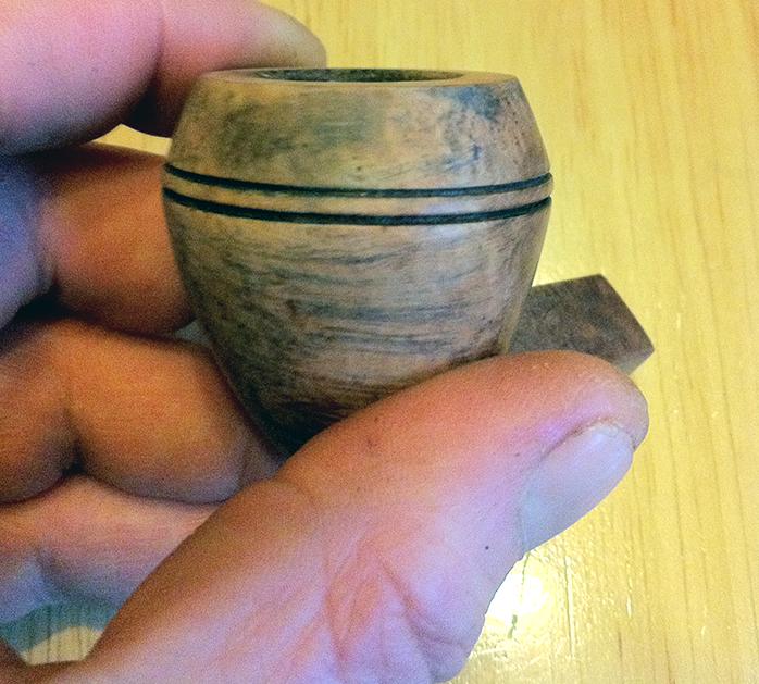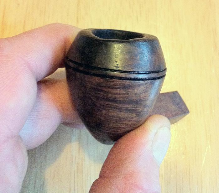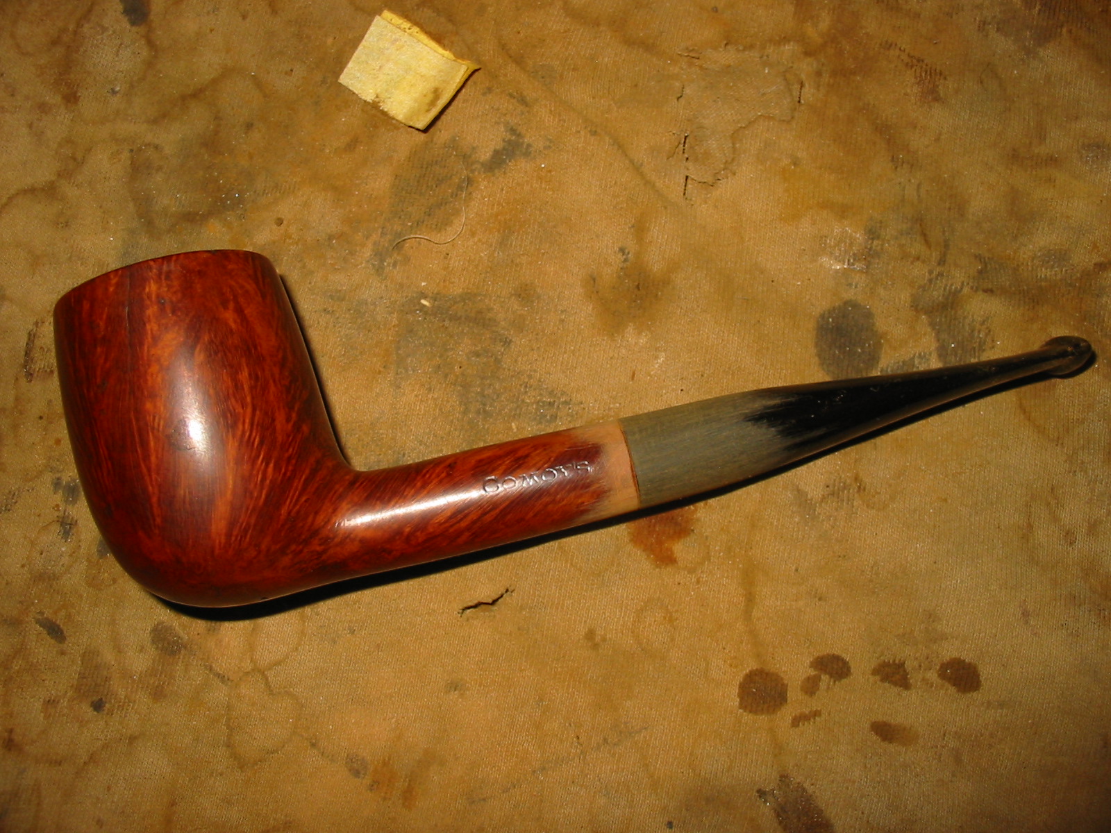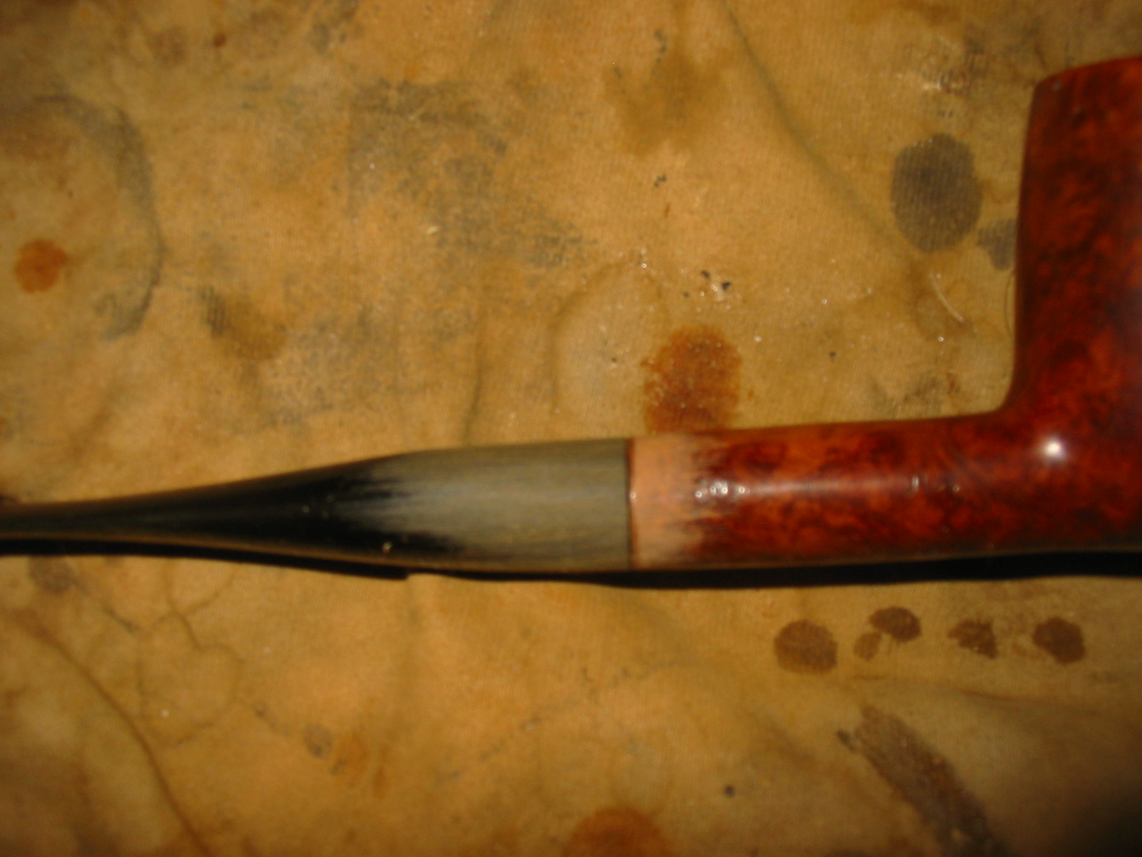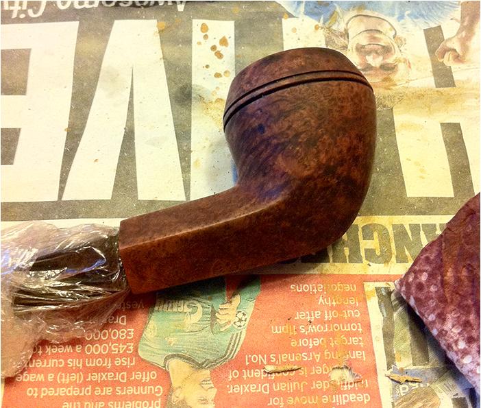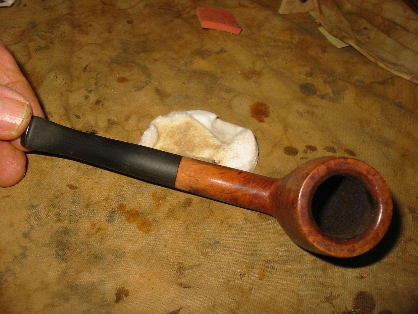 I stained the pipe with a dark brown aniline stain mixed 2:1 with isopropyl alcohol to approximate the colour on other Comoy’s I have. In the photos below it appears far redder in colour than it is in reality. I flamed the stain and repeated as necessary. The cracks were still visible so they would take a bit more work to repair.