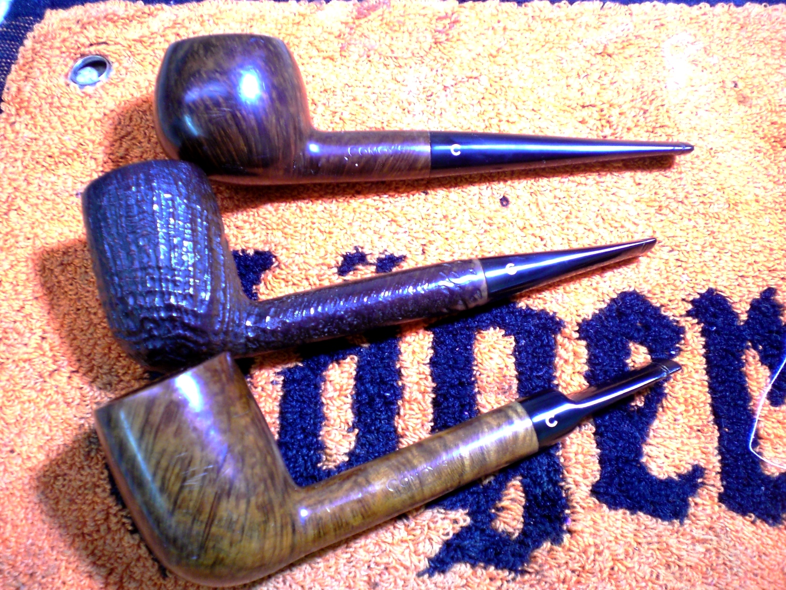 On the briar, I removed the top layer of tars build-up and gave the pipes a light buff with white diamond and then a few coats carnuba wax.