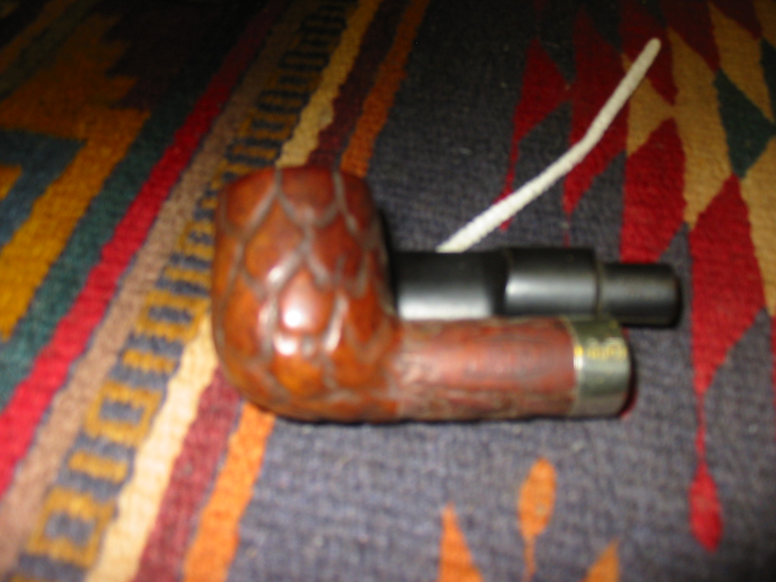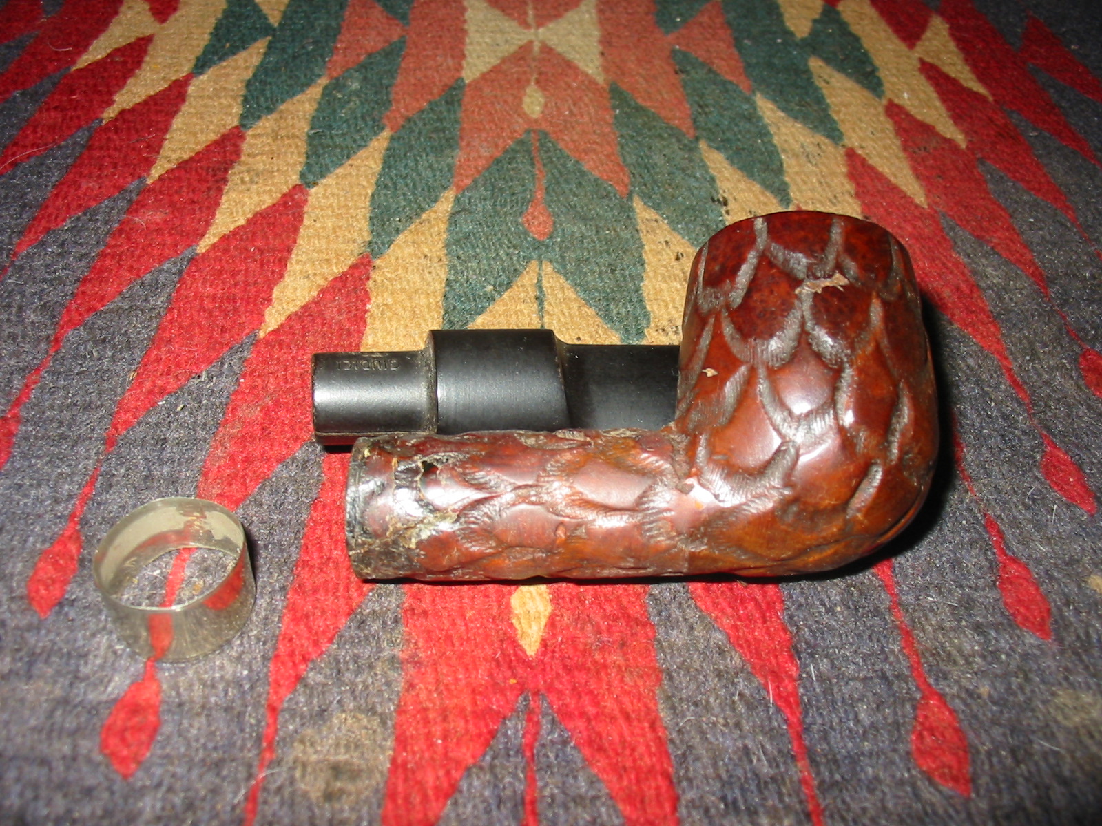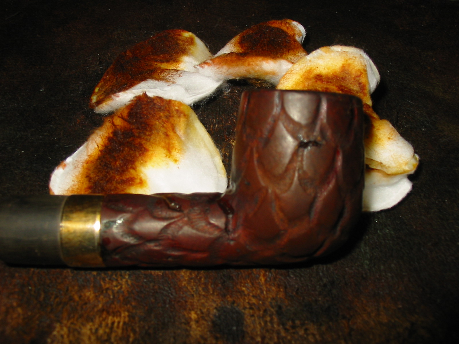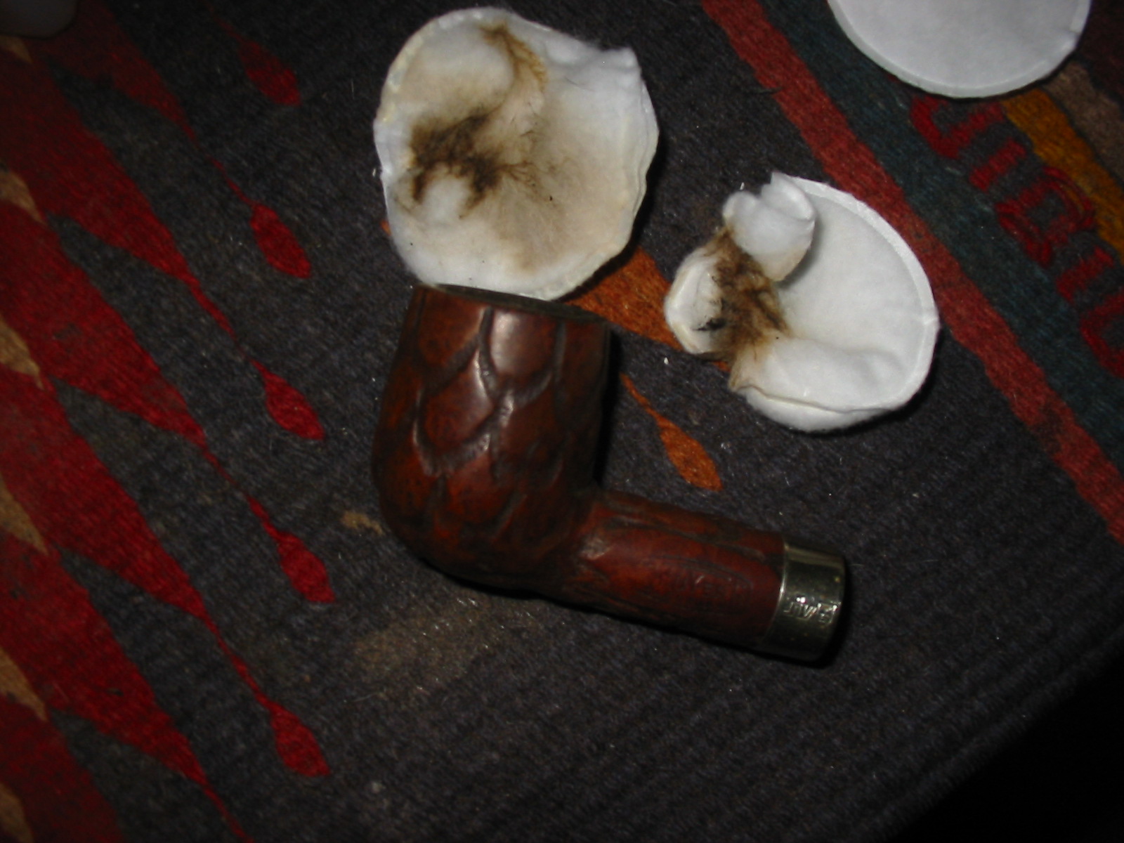 I cleaned out the inside of the bowl with cotton swabs and isopropyl alcohol. Once I had it clean I worked on the resin on the shank repair. I sanded it until it was flush with the surface of the rest of the shank so that it did not bulge. I continually checked to see if I was weakening the repair but the shank was solid. I used the dental pick and my modified Philips screwdriver rusticator to rusticate the area around the resin repair. I also found a band in my box that fit the shank perfectly and pressed it into place. The band was more for bling than as the shank was not cracked or damaged. I also went through my stem can and found a stem that fit the diameter of the shank, turned it with the PIMO tenon turning tool and fit is in place. It would need to be reduced slightly in diameter to fit well with the band. I wiped down the bowl and shank with isopropyl alcohol on a cotton pad. I did not want to chance acetone as I was worried about it dissolving the resin on the shank repair. As I did not know what was used in the repair I did not want to chance further damage.