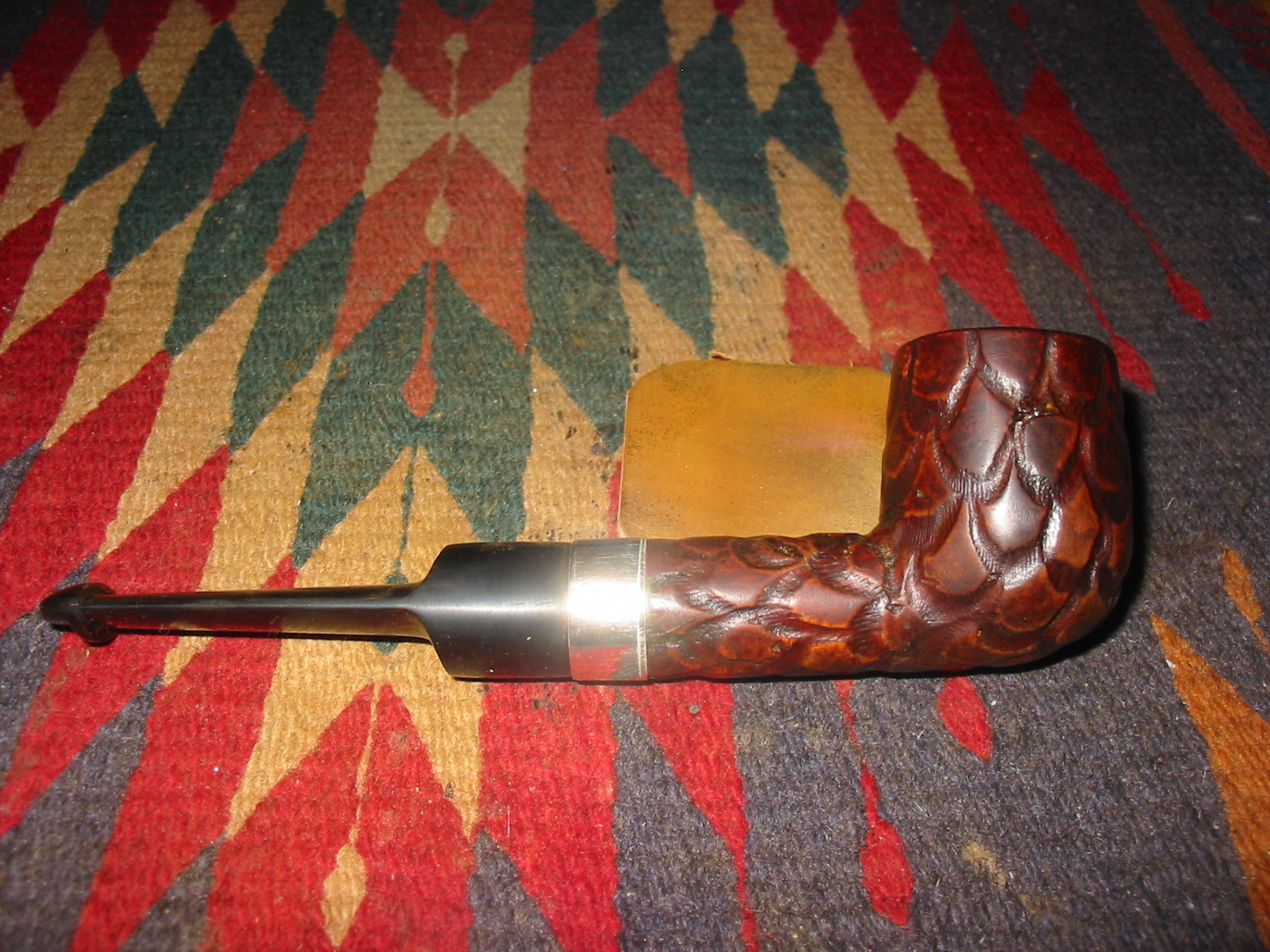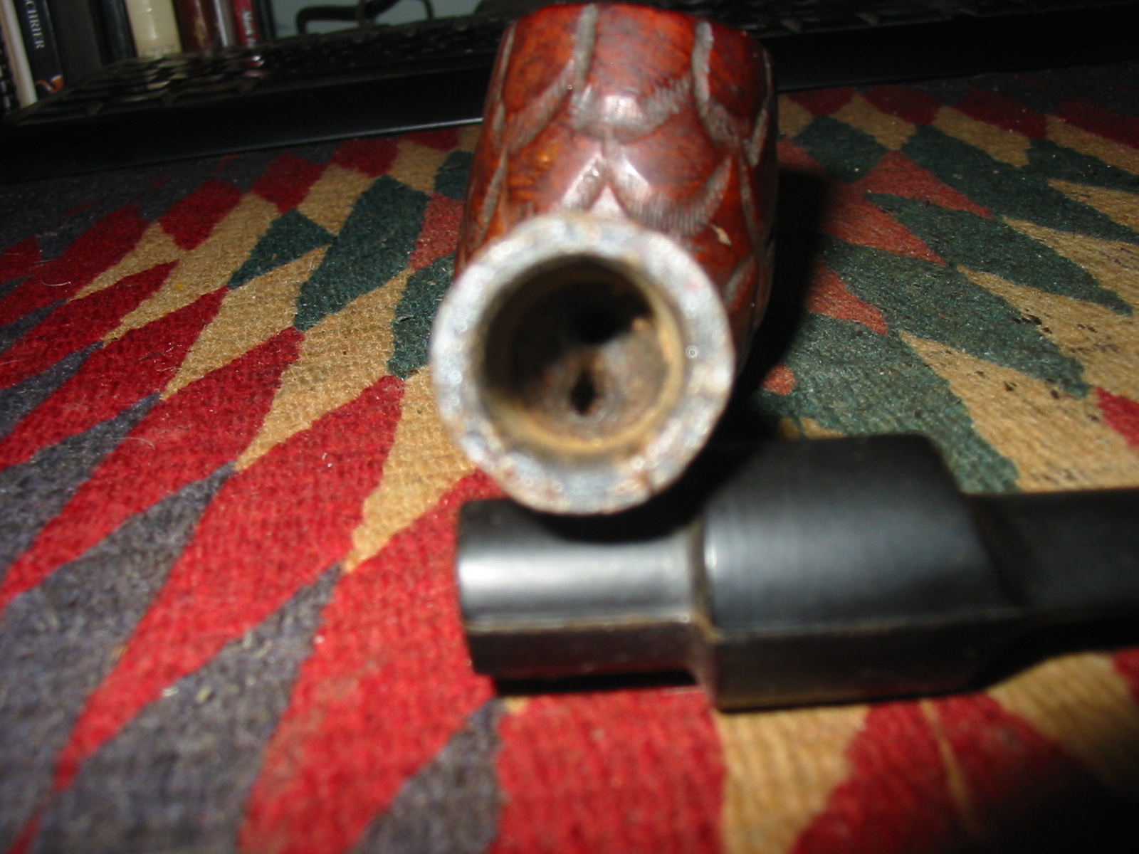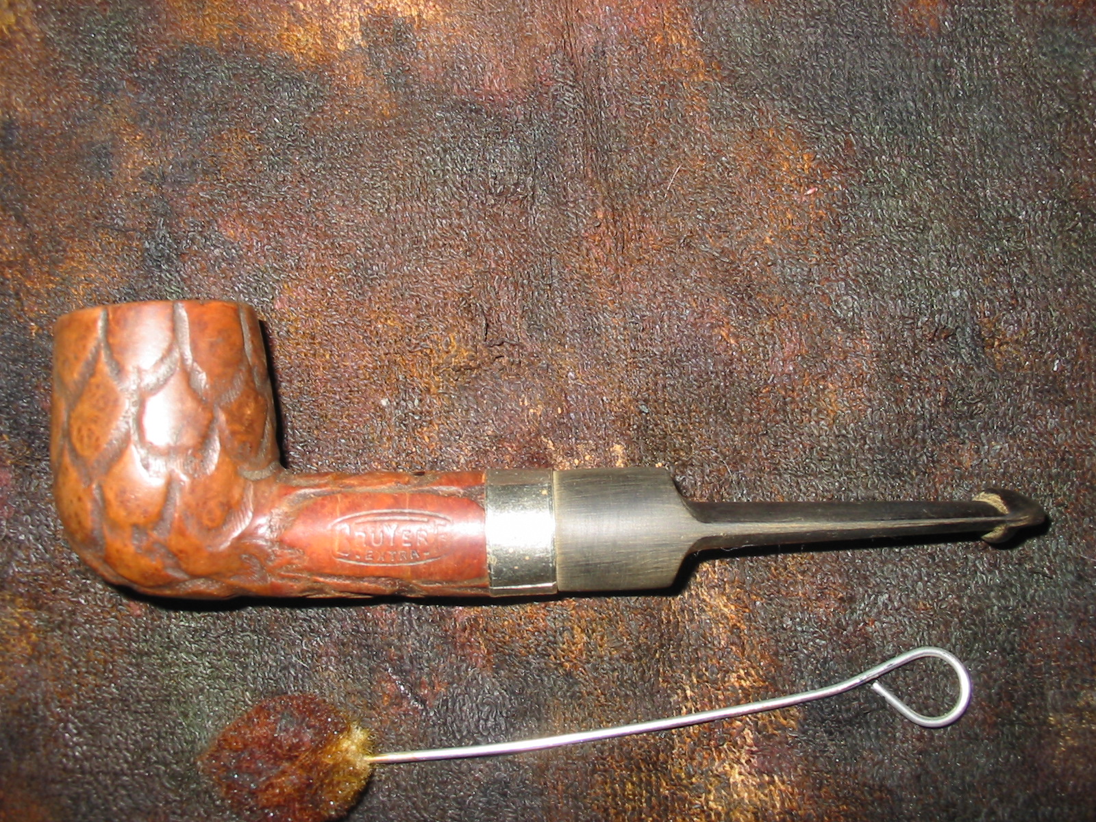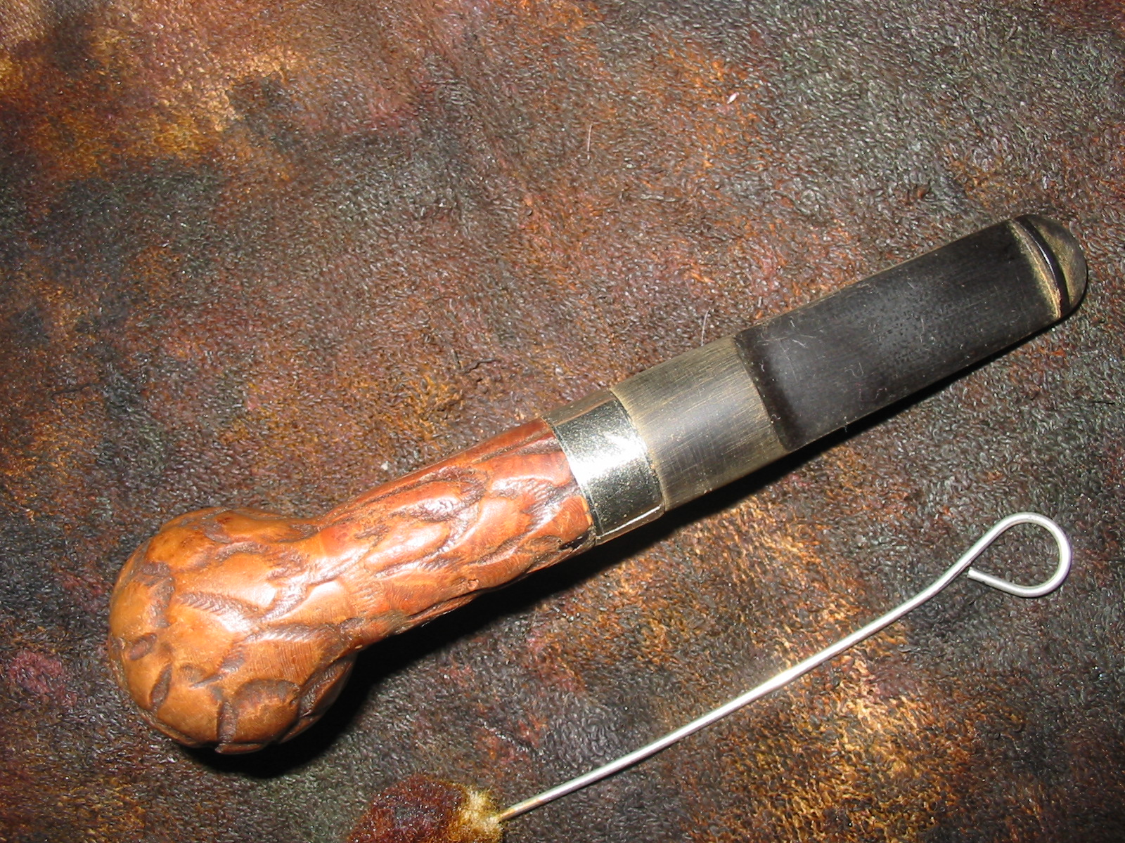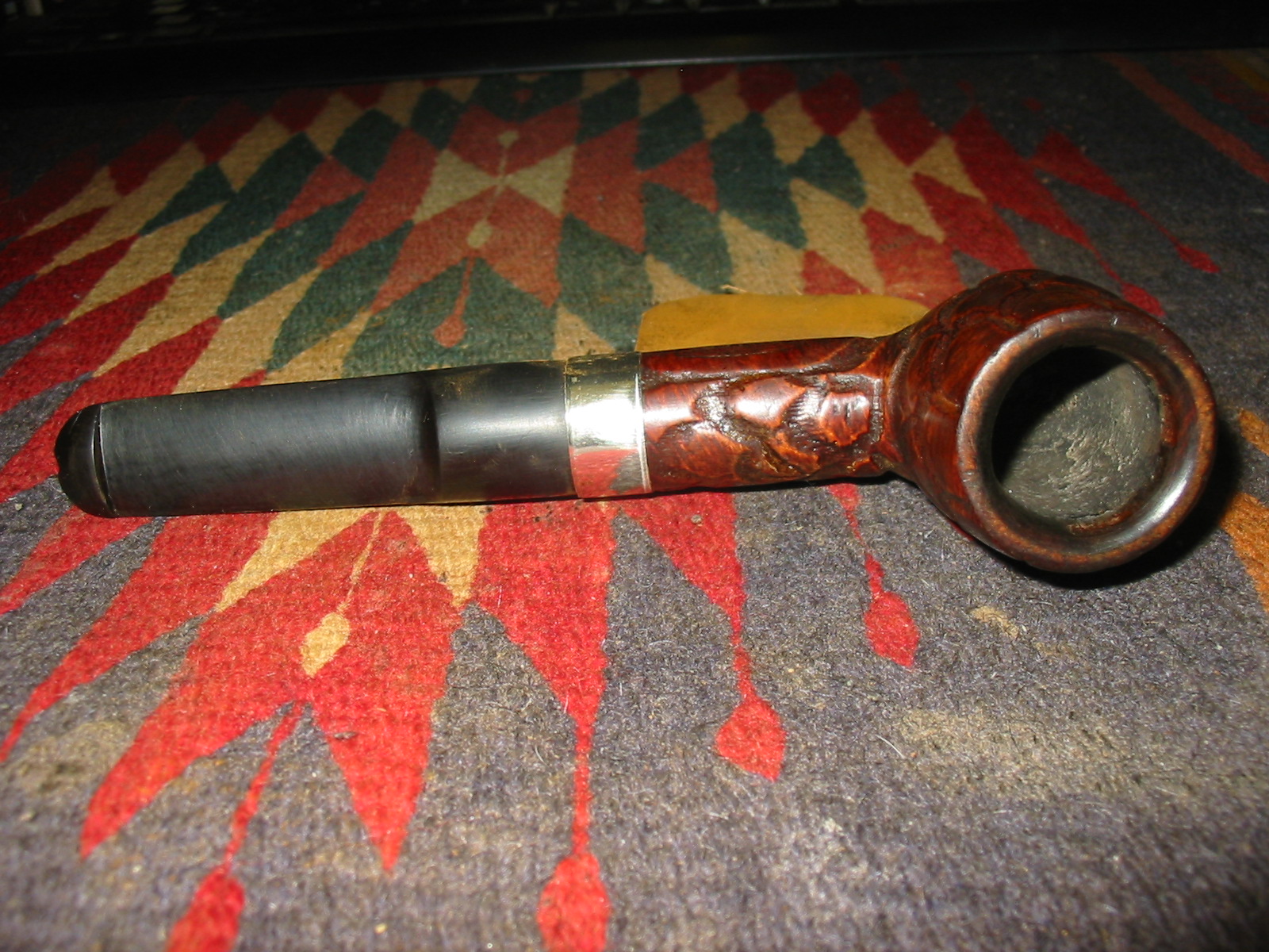 I cleaned out the inside of the bowl with cotton swabs and isopropyl alcohol. Once I had it clean I worked on the resin on the shank repair. I sanded it until it was flush with the surface of the rest of the shank so that it did not bulge. I continually checked to see if I was weakening the repair but the shank was solid. I used the dental pick and my modified Philips screwdriver rusticator to rusticate the area around the resin repair. I also found a band in my box that fit the shank perfectly and pressed it into place. The band was more for bling than as the shank was not cracked or damaged. I also went through my stem can and found a stem that fit the diameter of the shank, turned it with the PIMO tenon turning tool and fit is in place. It would need to be reduced slightly in diameter to fit well with the band. I wiped down the bowl and shank with isopropyl alcohol on a cotton pad. I did not want to chance acetone as I was worried about it dissolving the resin on the shank repair. As I did not know what was used in the repair I did not want to chance further damage.