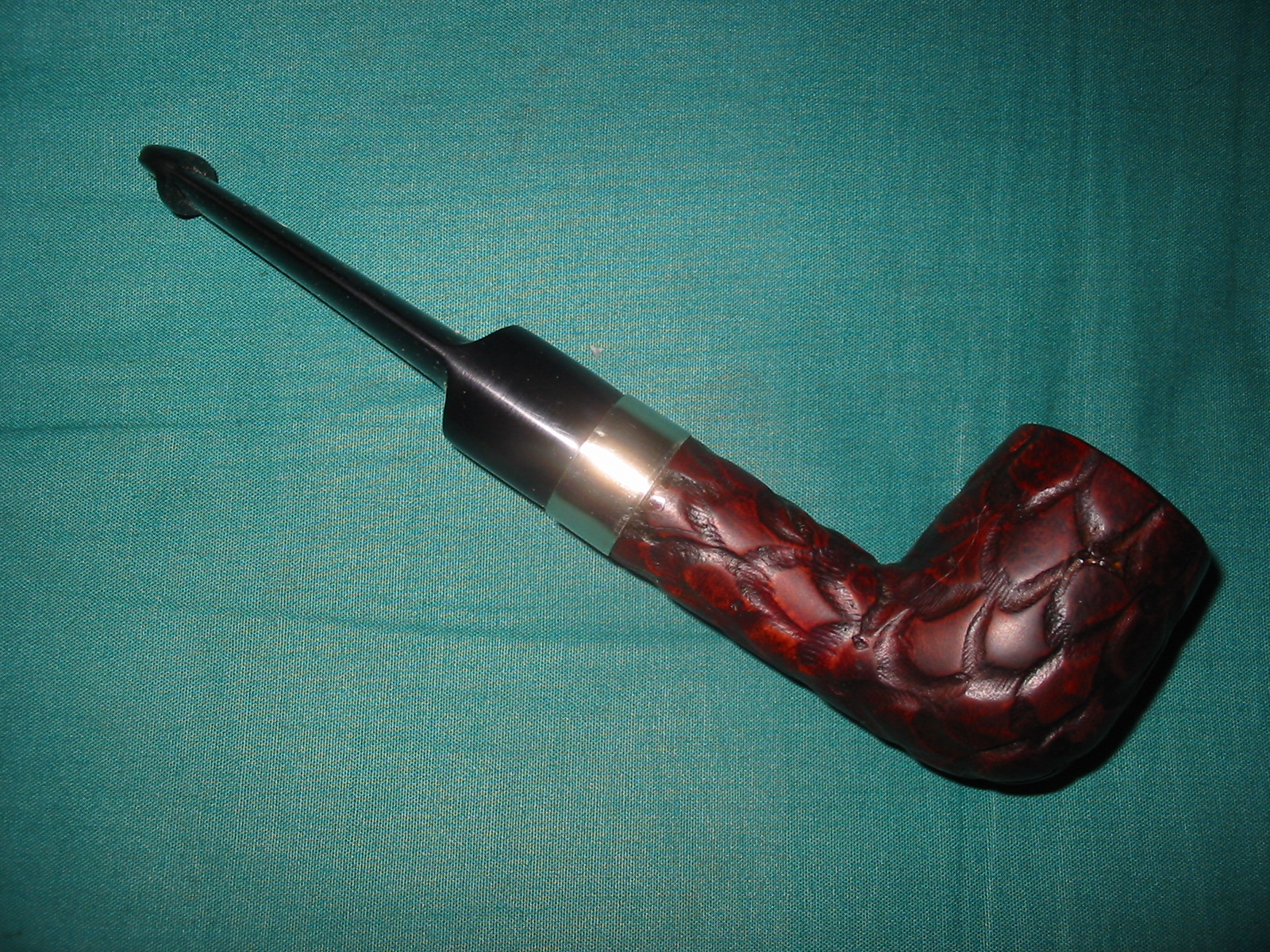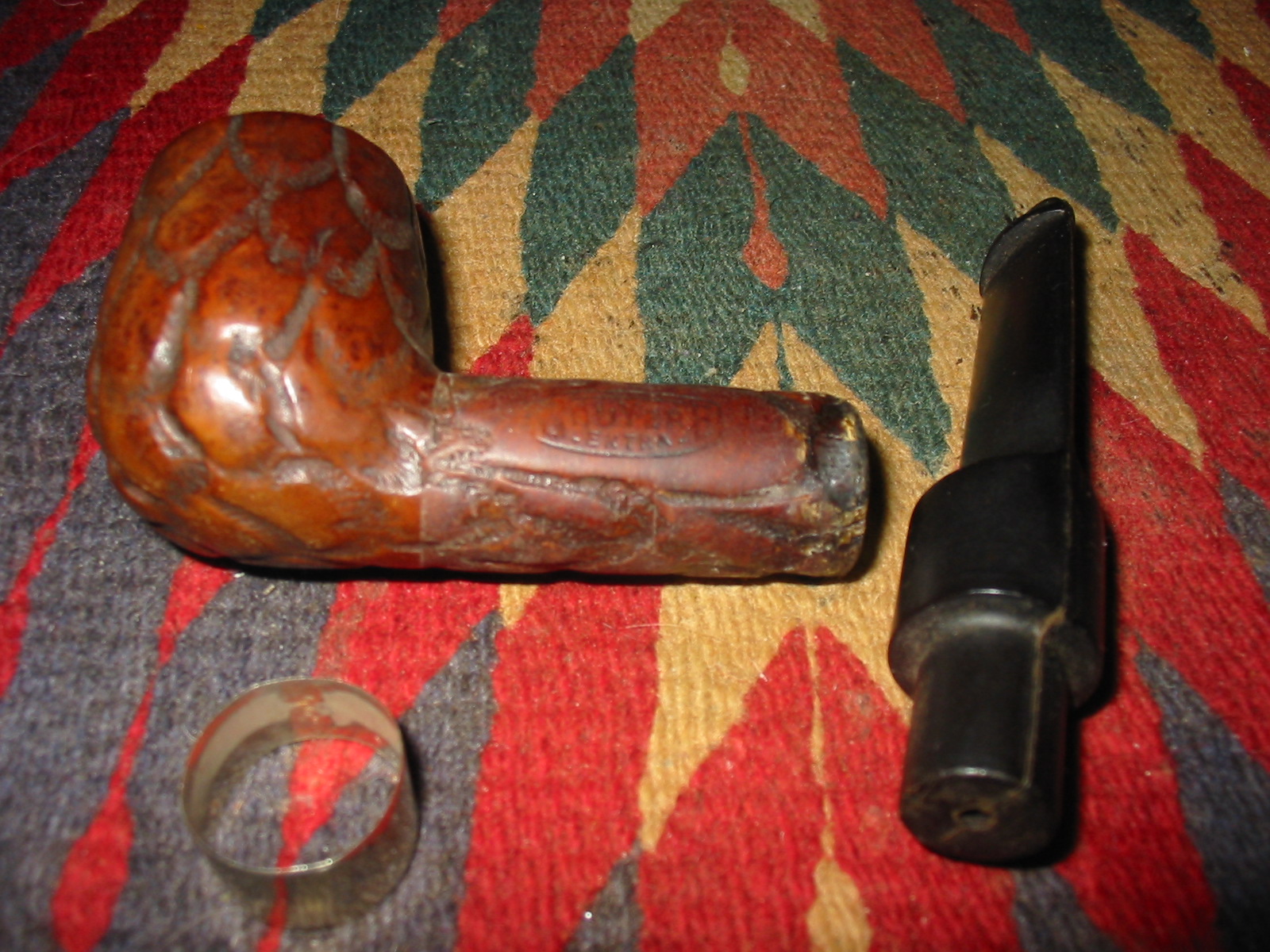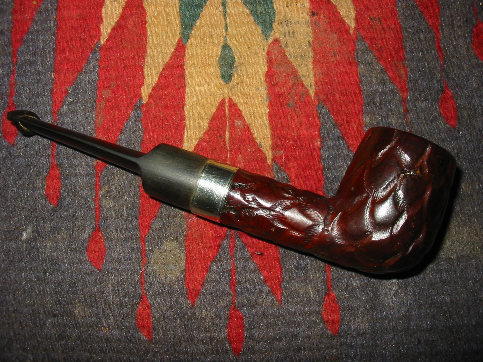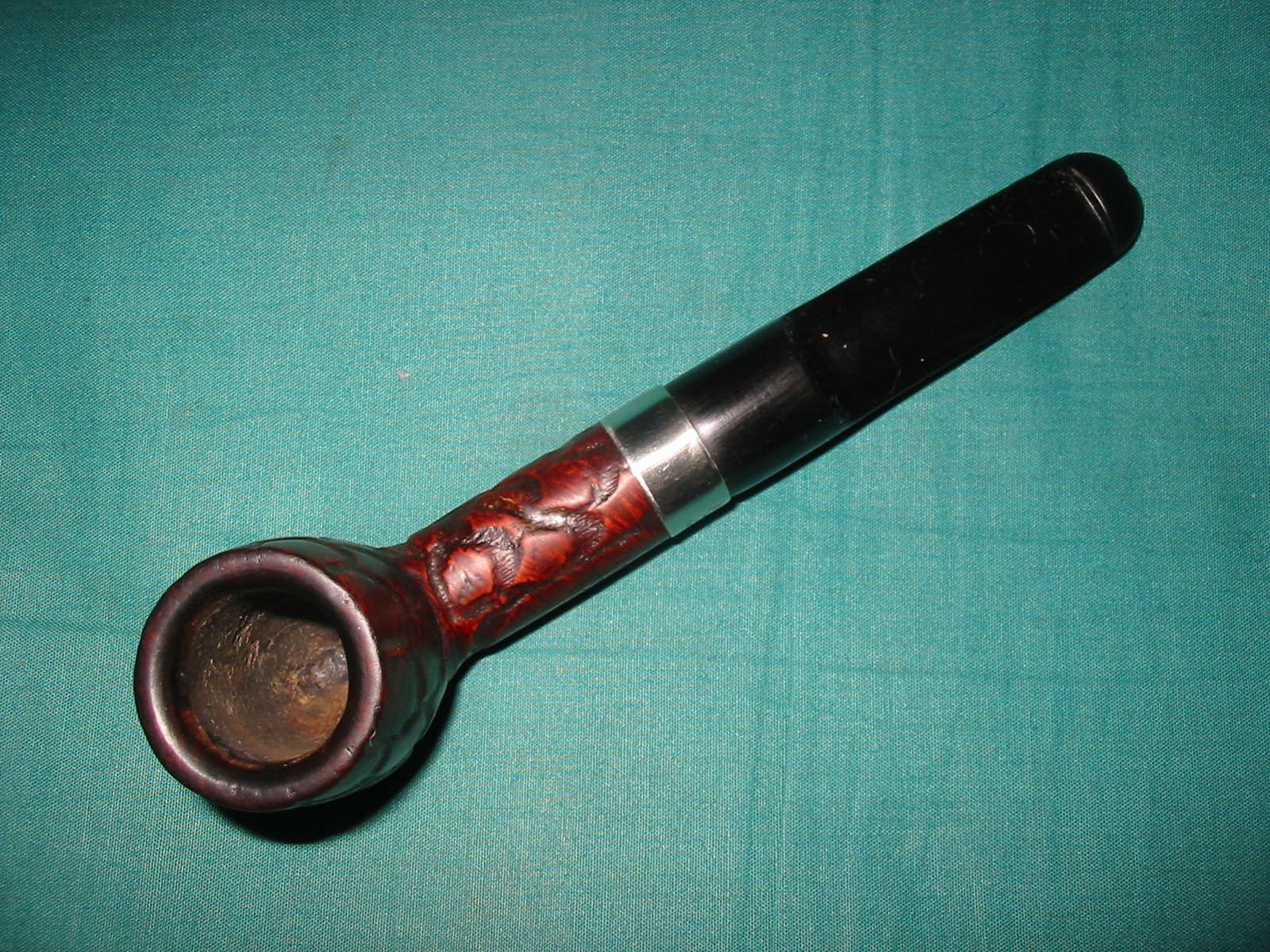 I cleaned out the inside of the bowl with cotton swabs and isopropyl alcohol. Once I had it clean I worked on the resin on the shank repair. I sanded it until it was flush with the surface of the rest of the shank so that it did not bulge. I continually checked to see if I was weakening the repair but the shank was solid. I used the dental pick and my modified Philips screwdriver rusticator to rusticate the area around the resin repair. I also found a band in my box that fit the shank perfectly and pressed it into place. The band was more for bling than as the shank was not cracked or damaged. I also went through my stem can and found a stem that fit the diameter of the shank, turned it with the PIMO tenon turning tool and fit is in place. It would need to be reduced slightly in diameter to fit well with the band. I wiped down the bowl and shank with isopropyl alcohol on a cotton pad. I did not want to chance acetone as I was worried about it dissolving the resin on the shank repair. As I did not know what was used in the repair I did not want to chance further damage.