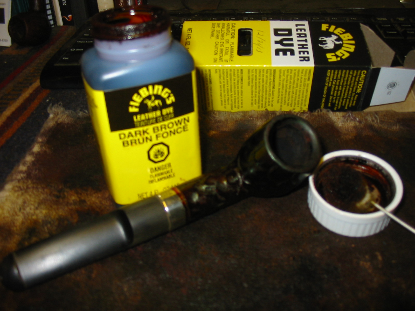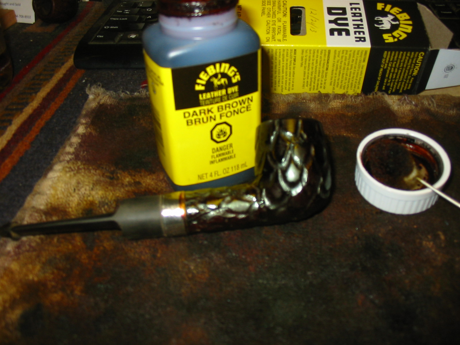 I stained the bowl with a dark brown aniline stain. I applied it, flamed it, applied it again and flamed it again. To get an even coverage on the sandblast finish it would take more than three applications and flamings to make the stain even. The photos below show the bowl after three coats of the stain. It would need to be repeated later in the process to get the rough places stained.
