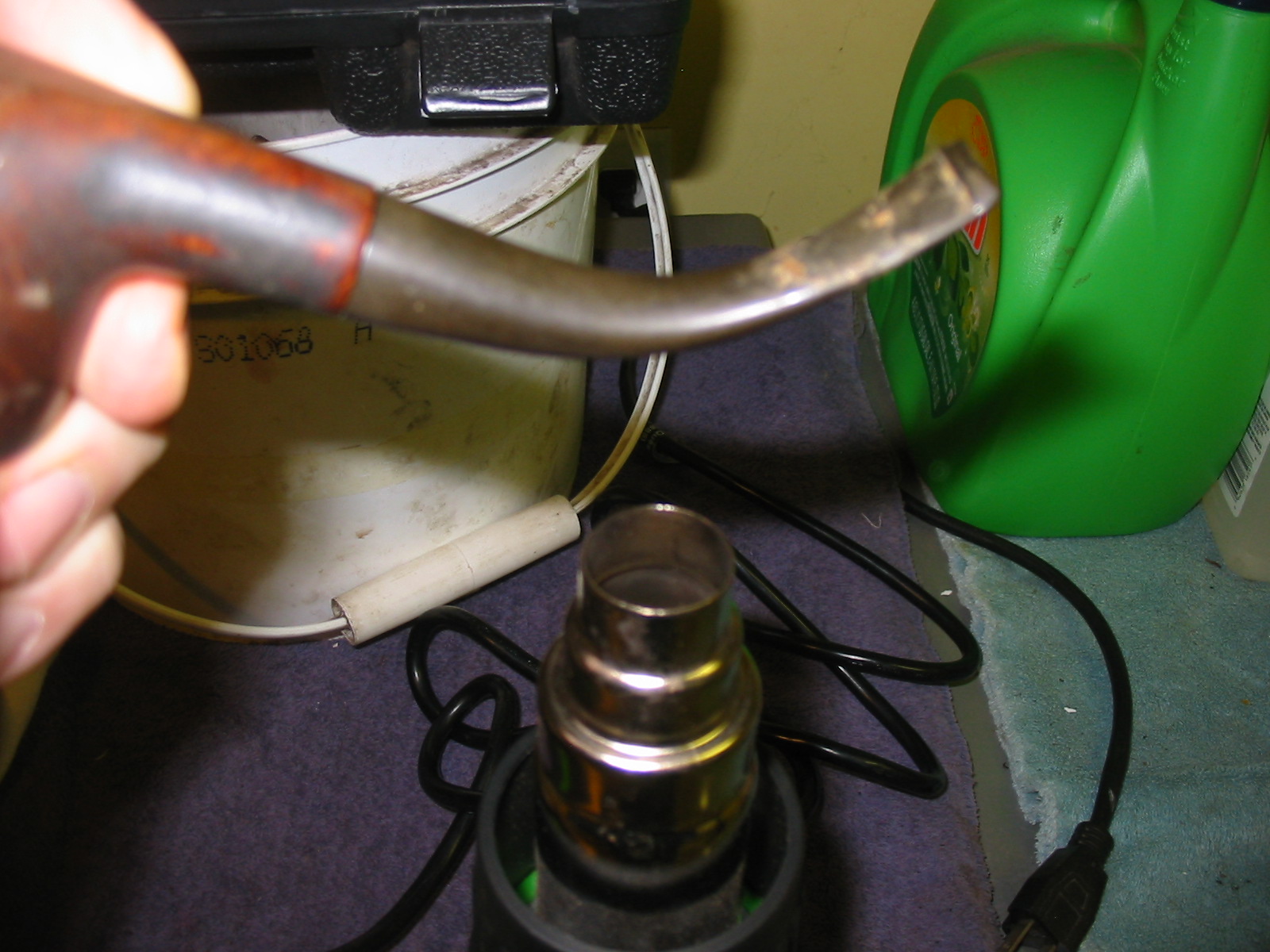 The stem was badly oxidized so I figured heating it to straighten it would actually soften the oxidation and bring it to the surface. I used a heat gun on the low setting to heat the stem. I generally hold it about 4 or more inches above the heat source and hold so it bends in the correct direction as it softens. In this case it did not take long for the vulcanite to heat and the stem to return to the original straight position. I decided to leave a slight bend in the stem as I like the look of on the pipe.