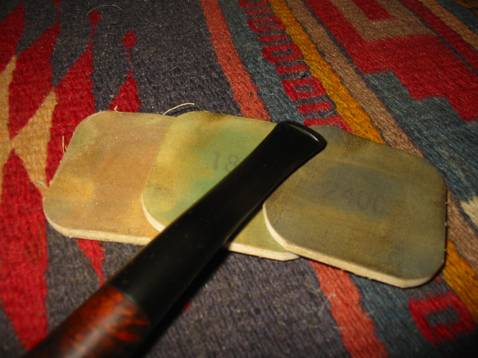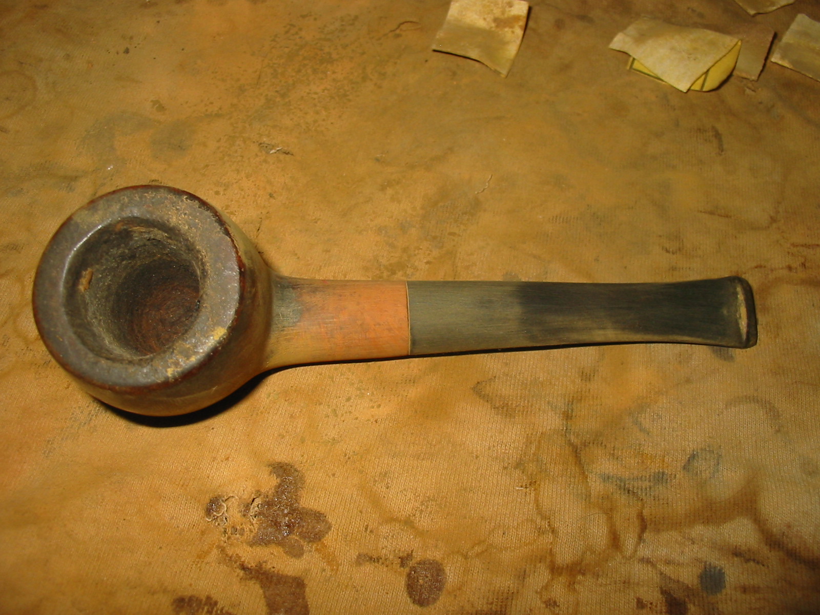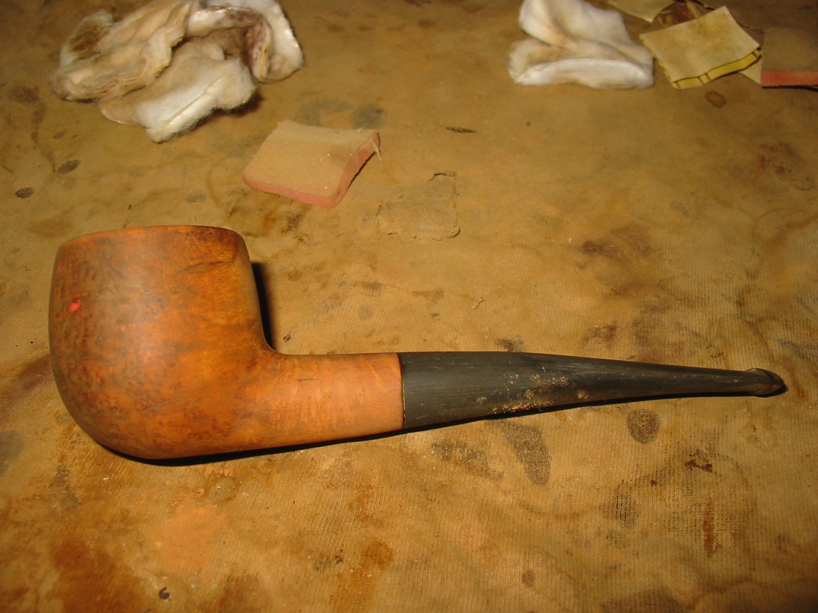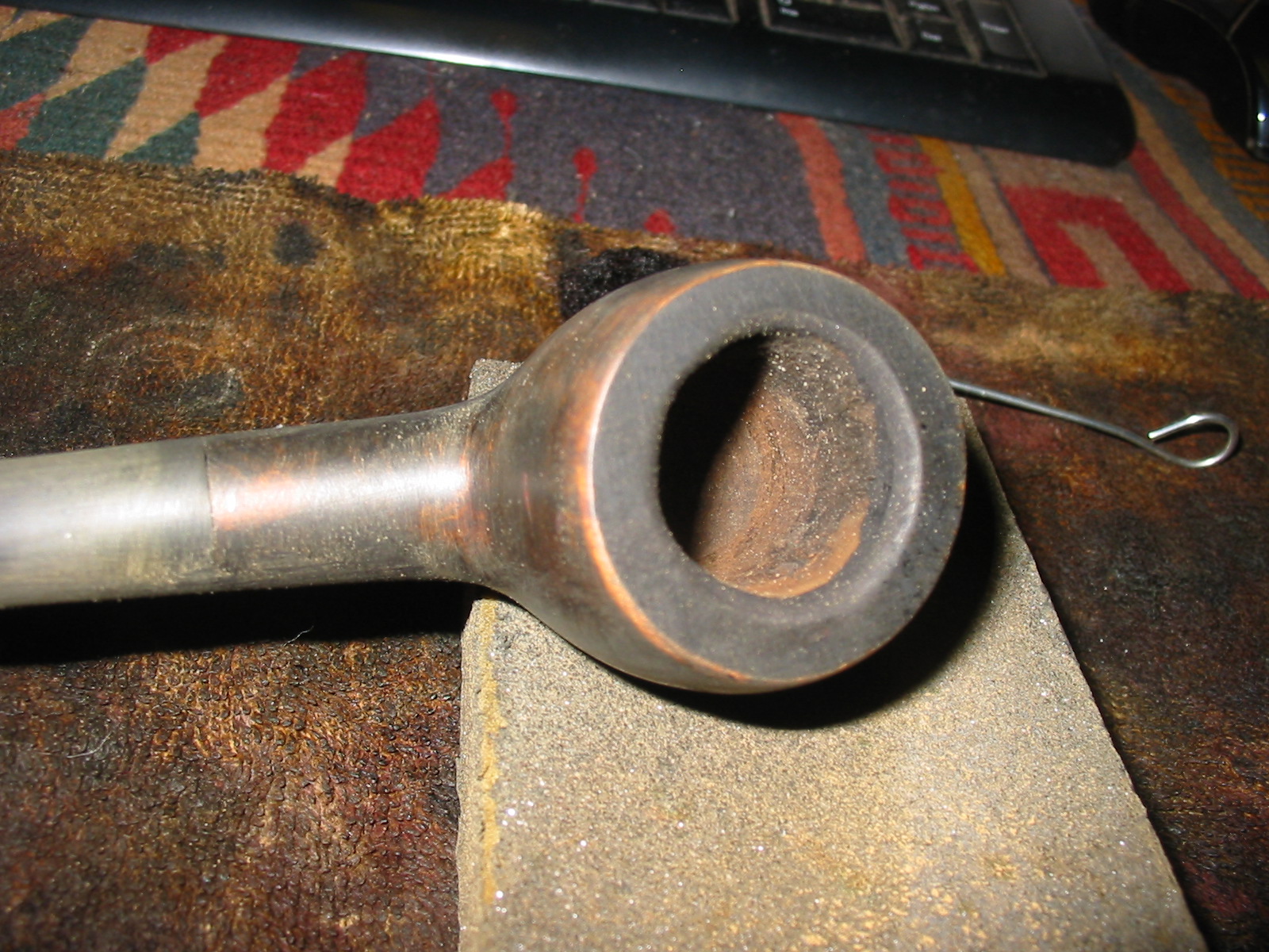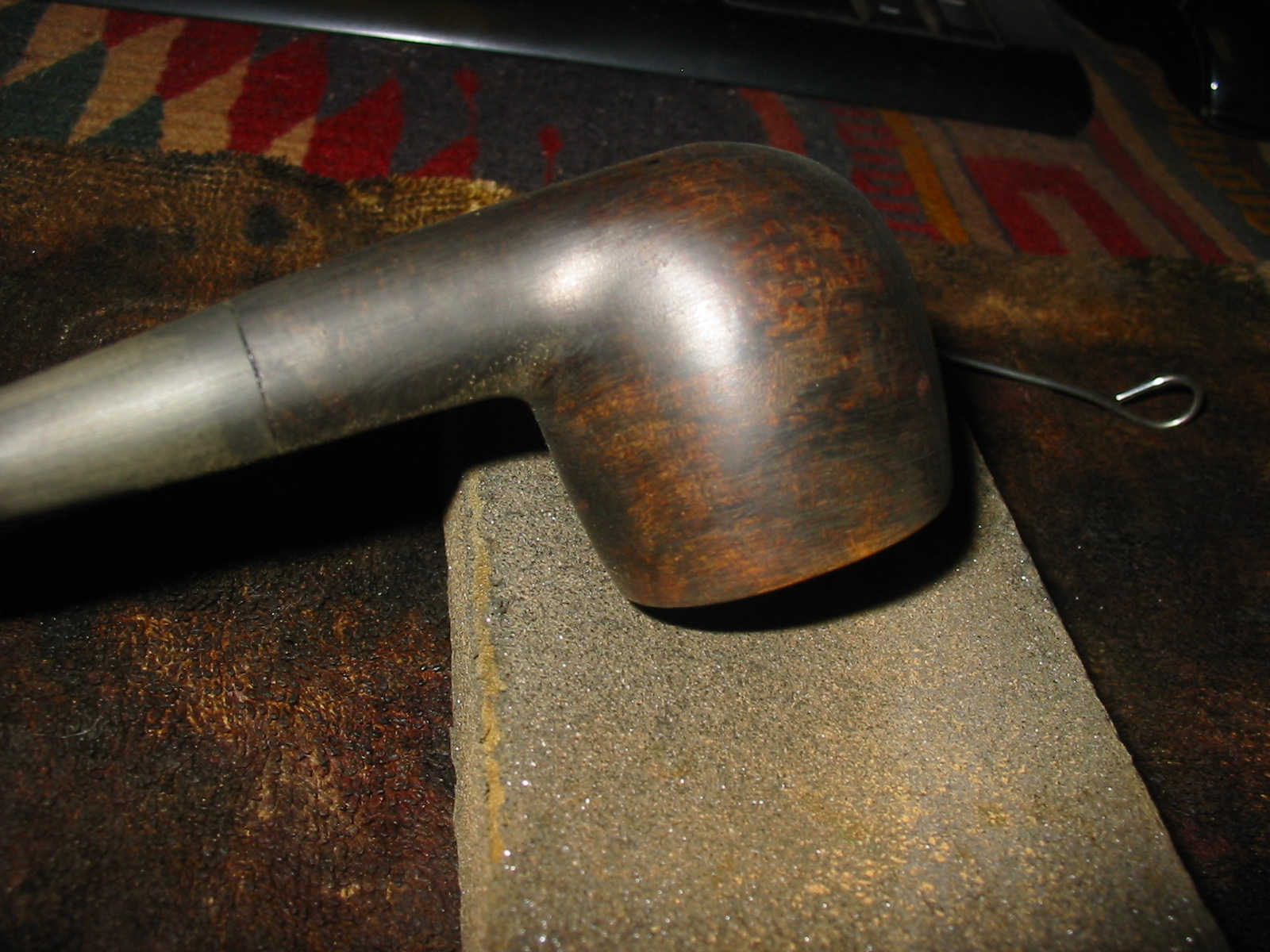 I set up a topping board and anchored a piece of 220 grit sandpaper on the surface to provide a flat straight surface to sand the top on. I twisted the top into the sandpaper in a clockwise motion to remove the tars and rim damage on the bowl.