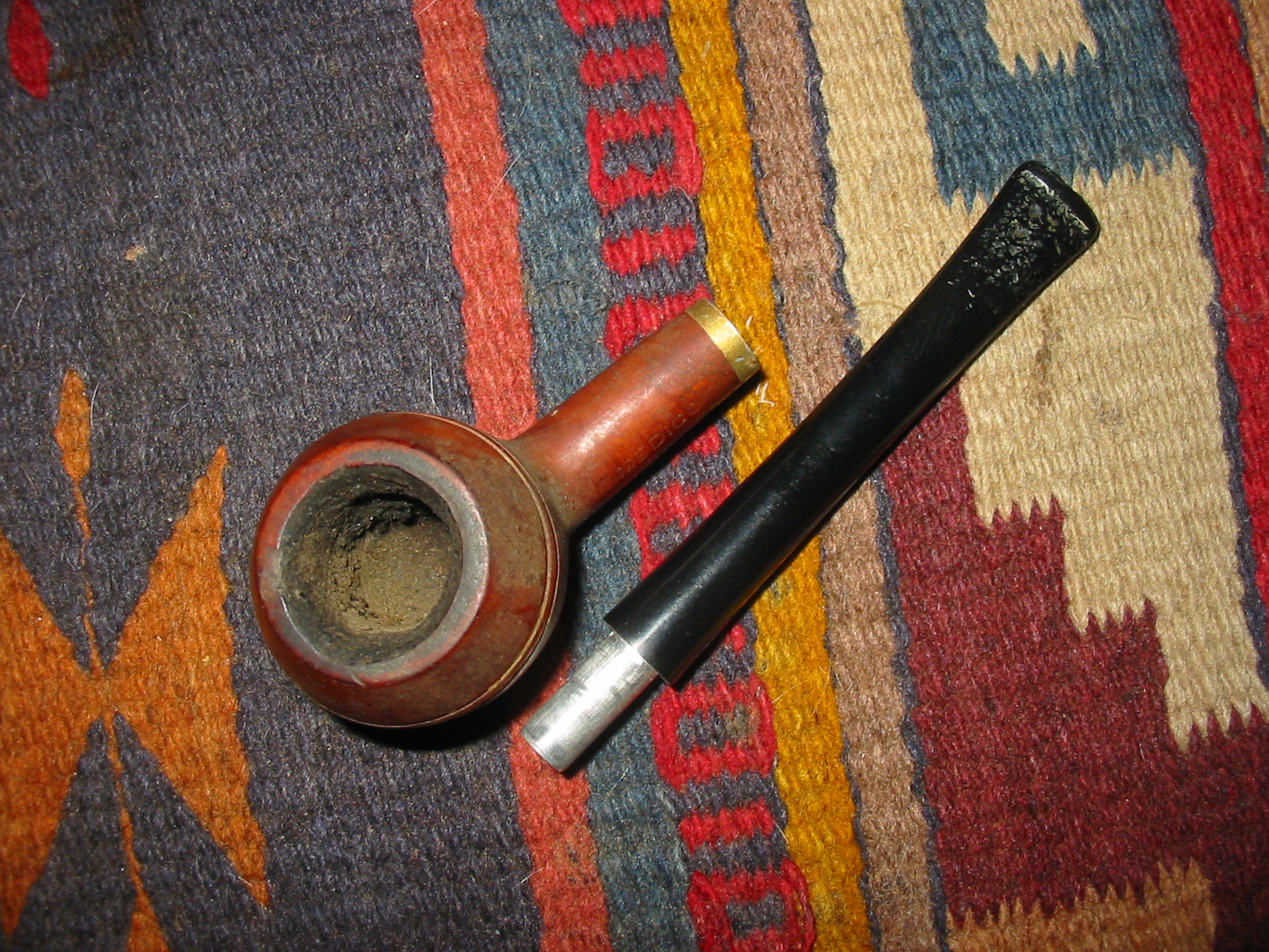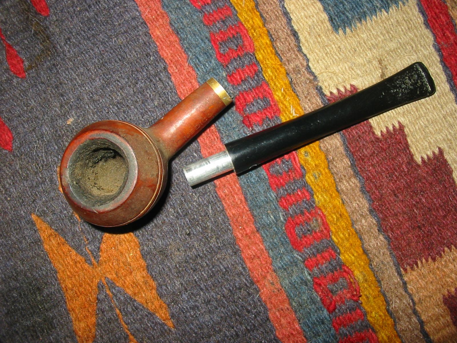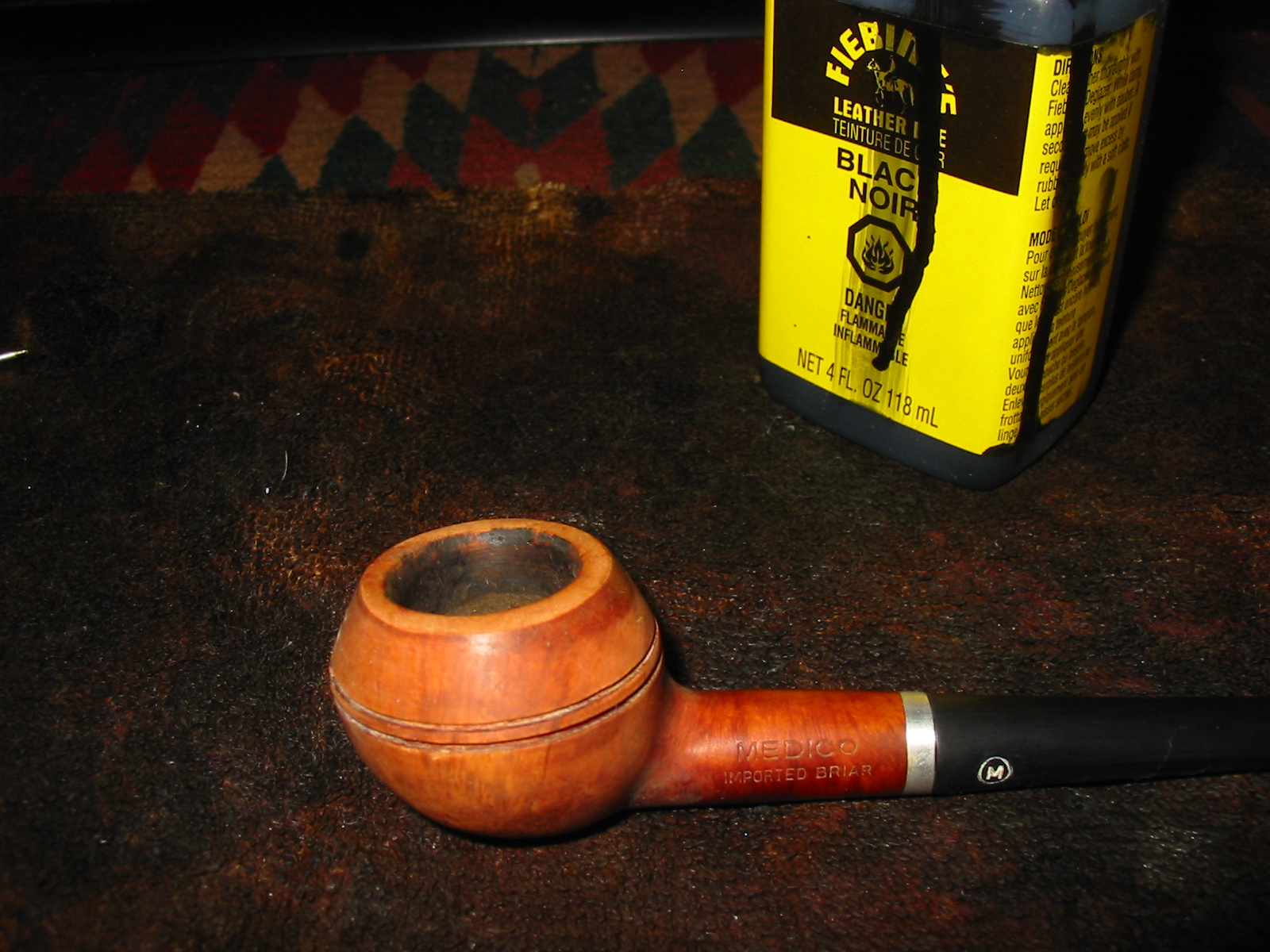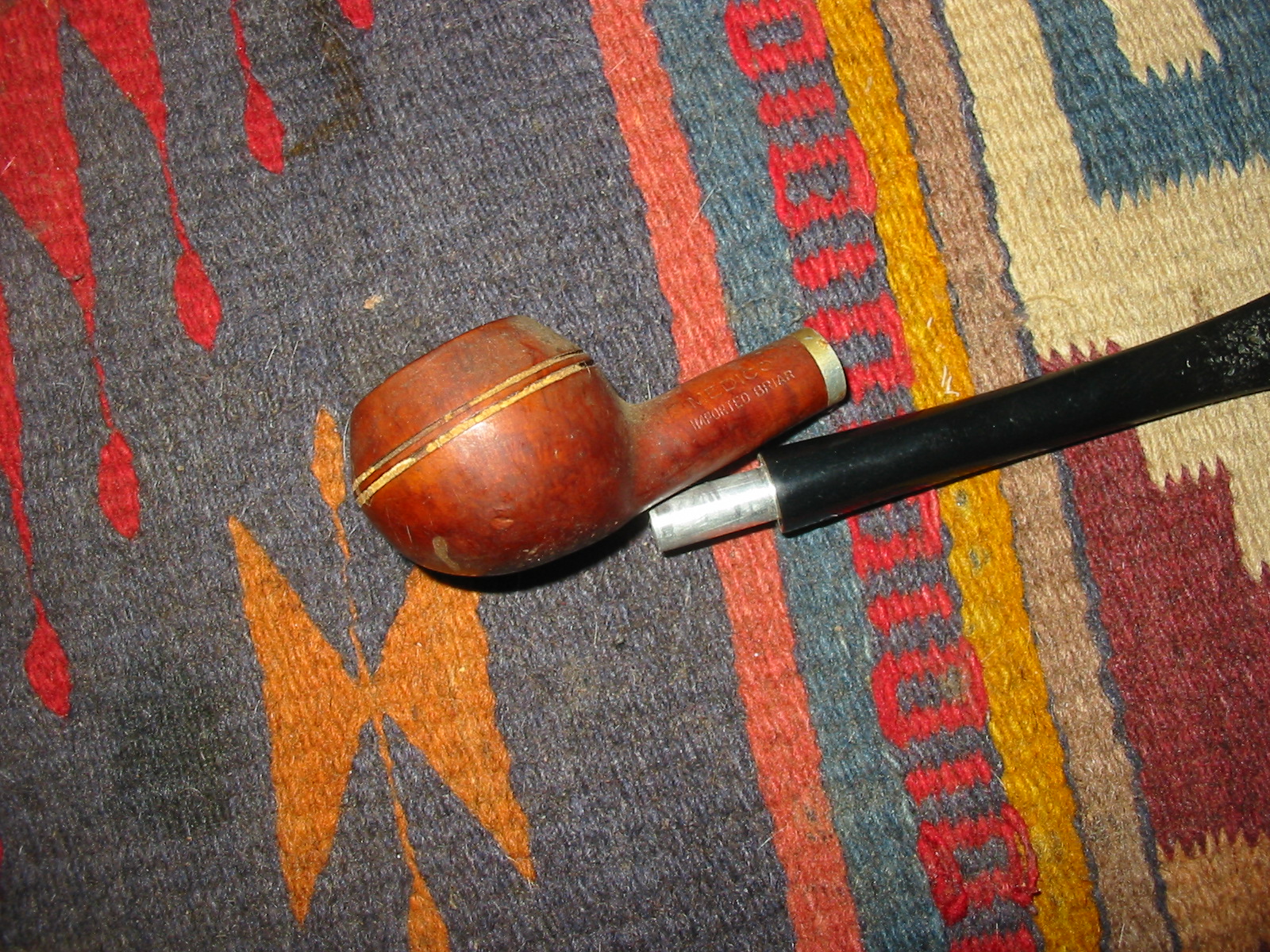 The second pipe I took out of the box of finds from the weekend antique mall score was a little Medico Prince. It is stamped Medico over Imported Briar on the left side of the shank. It had an aluminum band that was coated with a plastic coat that made it appear to be gold. This coating was peeling leaving the band looking unusable. The bowl also did not have a stem. The bowl itself had several fills on the sides and bottom, nicks around the double scored lines on the bowl and the lines themselves were filled in with hard white putty like substance. I am not sure what the purpose of the filling of the lines was but it gave the old pipe a despairing look. The rim was rough and slightly out of round. The cake was built up in the bowl and overflowing onto the rim. I looked through my stem can and found a Medico stem that had originally been on a pipe I made into a Churchwarden. It was from one of my first pipes when I came back to pipes in 1982. The stem was nylon and covered with tooth chatter and deep tooth marks. The metal tenon and the diameter of the stem were a perfect fit. I would only have to make a slight adjustment on the bottom side of the stem and the right side to make the transition smooth.