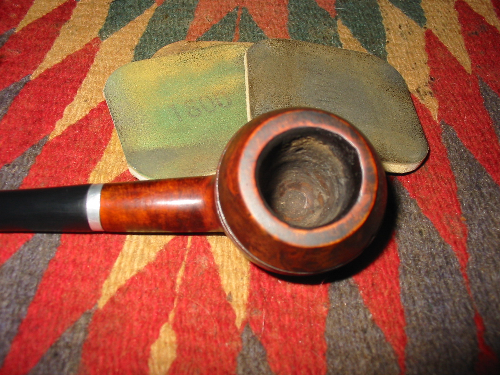 I lightly topped the rim to remove the surface damage and to remove some of the damage on the inner edge. I sanded the inner edge with a folded piece of 220 grit sandpaper to smooth out the rough edges and give it a more rounded appearance. I wiped down the bowl and rim with acetone on a cotton pad and then isopropyl on a cotton pad to remove the finish. I used a dental pick to remove the white putty like substance that filled the two parallel bands around the bowl and then wiped it down a final time with alcohol. I also removed the stem and wiped down the aluminum band to remove the plastic coating that was on it.