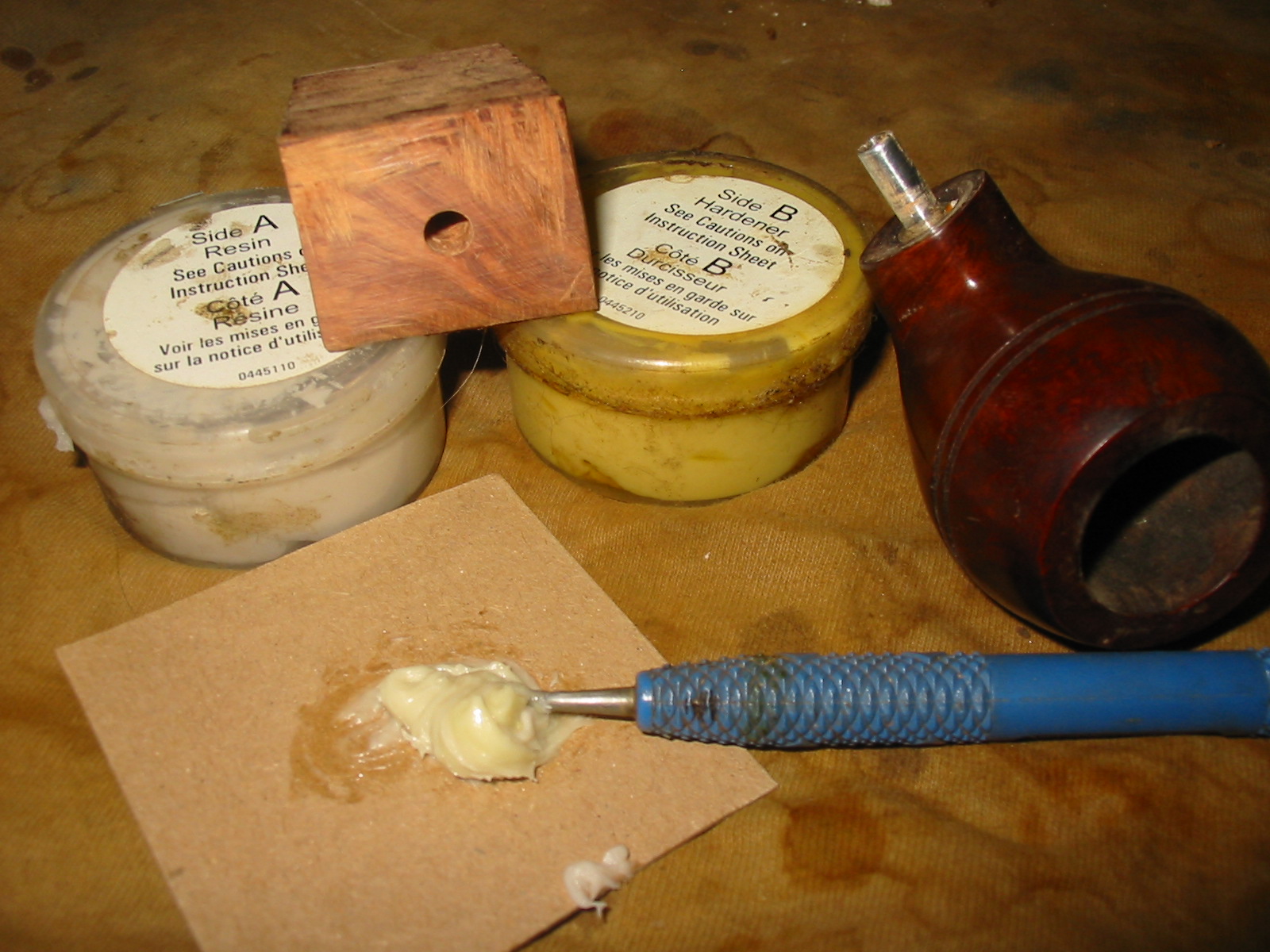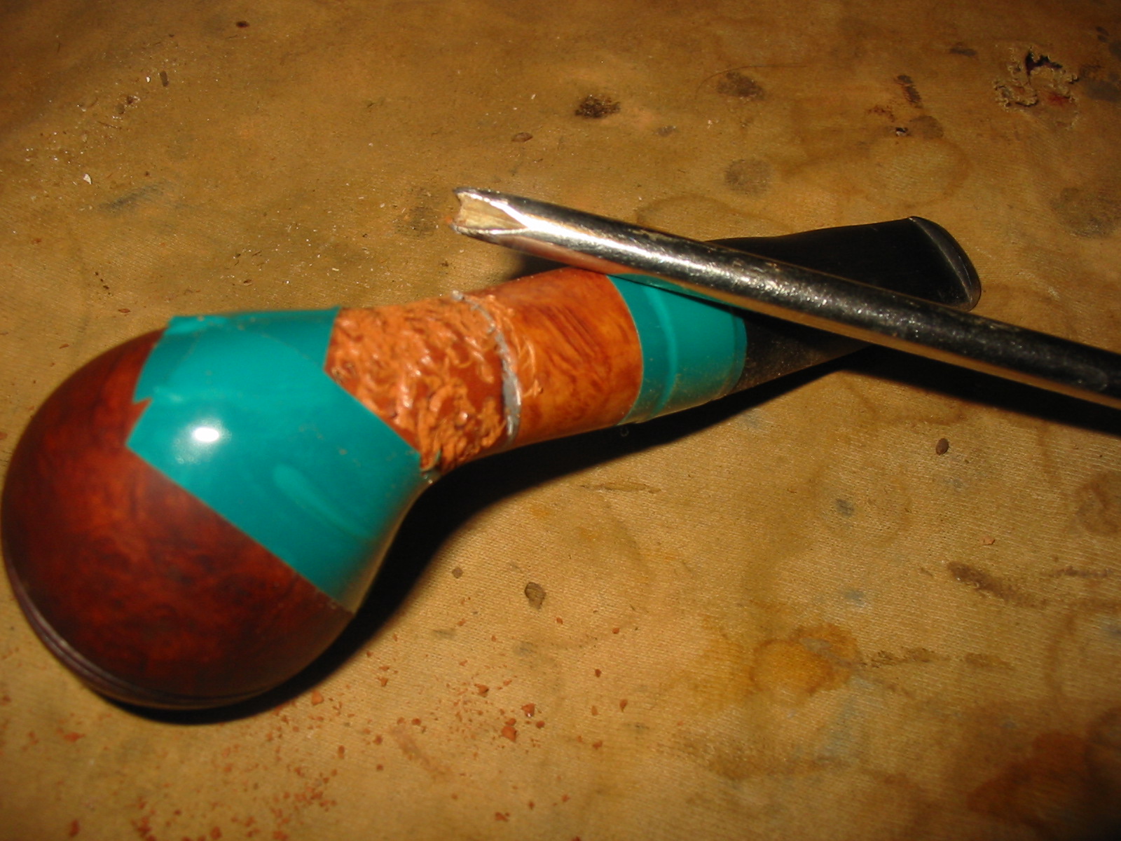 I used my topping board and sandpaper to try to face the short shank and the piece of briar to facilitate a flush fit when the two pieces were joined. The shank on the pipe had been cut at an angle so I took that into consideration when I was working on the briar extension. I mixed up a two-part epoxy and glued the block and the bowl. The photos show the epoxied joint before I cleaned it up. I clamped the pieces together overnight to let it cure.