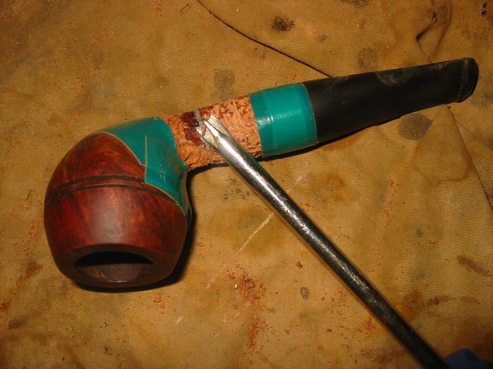 I stained the rustication with a black aniline stain, flamed it and then wire brushed it a second time. I restained and reflamed it and then sanded the high spots on the rustication with a fine grit sanding sponge. Once the rustication was the style I wanted I gave the bowl a top coat of oxblood stain. I wanted a contrast between the deep grooves of the rustication and the rest of the pipe. I always have liked that look on a pipe. This particular “Frankenpipe” was made for this kind of rustication pattern. At this point the major work on the bowl and shank is done other than polishing and waxing. I still had work to do on the stem and band but the pipe was taking definite shape. It had come a long way from the pieces that came together at the beginning.