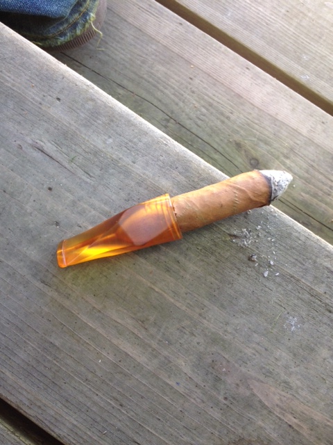 I had just finished the yard work for the weekend and set up a set of chairs on my front porch. I went out and sat down. I toasted the cigar with the lighter and drew the flame into the centre of the cigar. Once I had a good burn going I sat back to relax and enjoy the smoke. I find that a cigar that size can last me up to an hour so I was in for the duration. The tip certainly is older than me though today it may not look like it. It feels good in the mouth, a lot like a Bakelite pipe stem. It keeps the end of the cigar intact and the smoke that drifts into the mouth seems to be slightly cooler than that drawn directly through the stick. It is comfortable to hold and to clench. This one will be a keeper for me.