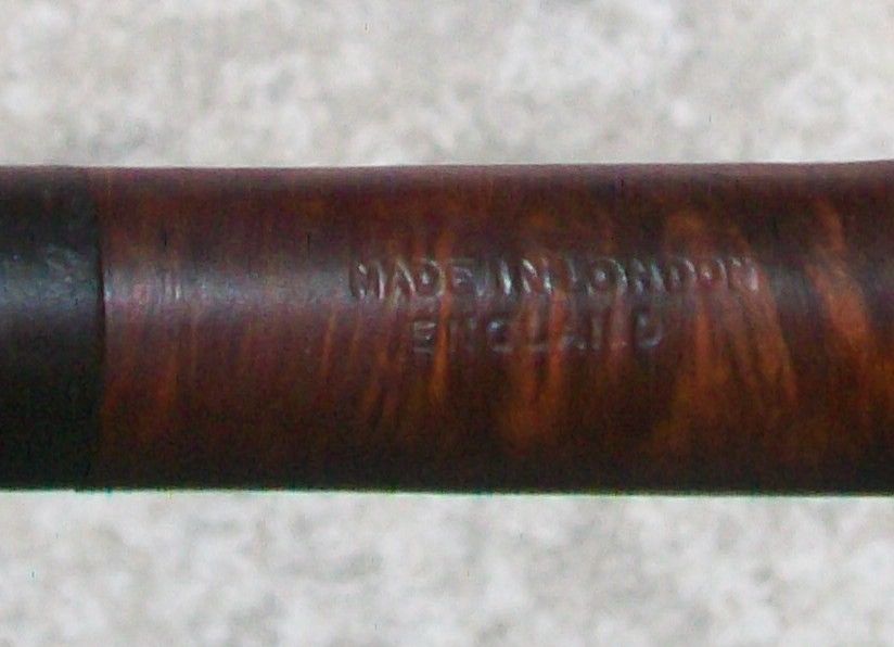 The pipes seemed to have been graded in a variety of ranges or lines. I am still trying to hunt down information on the various lines of pipes that they sold. I have found several pipes on EBay that bear different line stampings. All have the same style stamping and all have the MADE IN LONDON ENGLAND stamping. I have included the list below to show what I have found so far. I have arranged them in what appears to be in the order from highest to lowest grade as I can determine. I have also found two leather covered pipes that were stamped Marshall Field Smoke Shop and appear to have been made by Ropp. They were identical to the Ropp leather clad pipes that have seen.