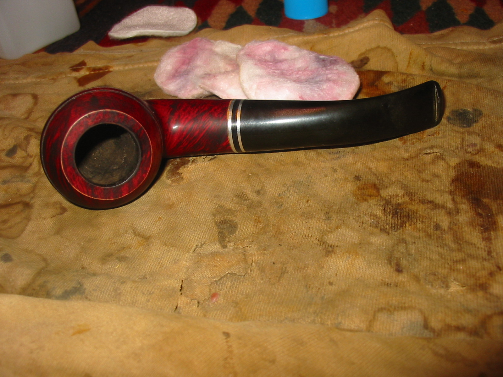 I like the way the grain was beginning to poke through the stain. I wiped it down several more time with the acetone and then buffed the pipe with Tripoli and White Diamond to polish and further remove some of the finish. The pipe was looking very good. I touched up the finish with a dark cherry stain to even out some of the light spots on the finish. I lightly buffed it with White Diamond when the stain was dry. I liked the look of things at this point.