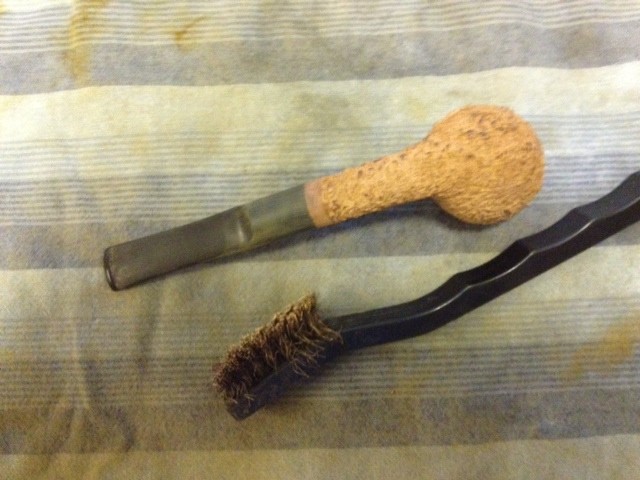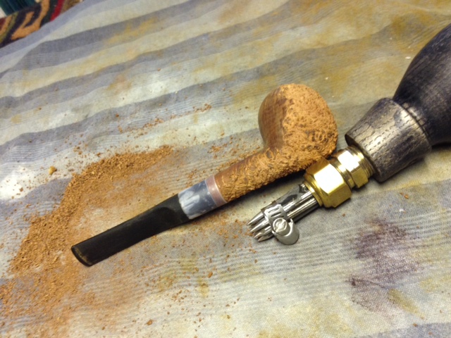When I finished rusticating the briar unwrapped the scotch tape from the shank. The line was fairly straight and provided a nice contrast of finishes between the stem and the rustication. Then I used a brass tire brush to knock off any loose pieces of briar on the bowl. I find that using the tire brush evens out the finish and cleans up the briar once I have finished with the hard work.