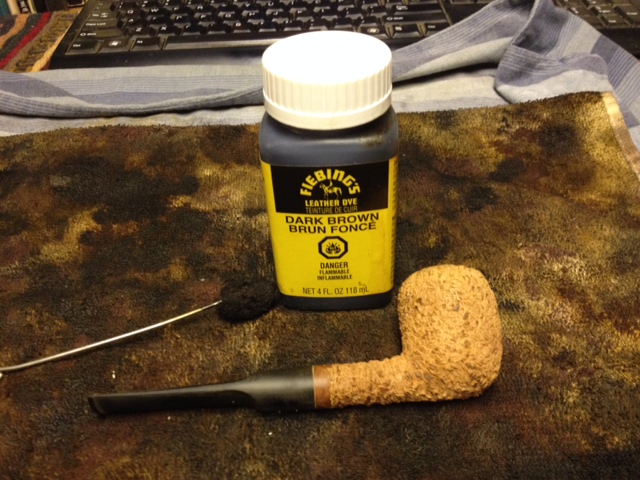 I sanded the band on the shank and the rim with a medium and a fine grit sanding sponge and a fine grit sanding sponge to prepare them for staining. I decided to use two different stains on the bowl to get some depth to the finish. I began with a dark brown aniline stain. I applied it with a wool dauber and let the stain permeate deep into the briar. I flamed it to set it. Reapplied the stain a second time and then flamed it again.