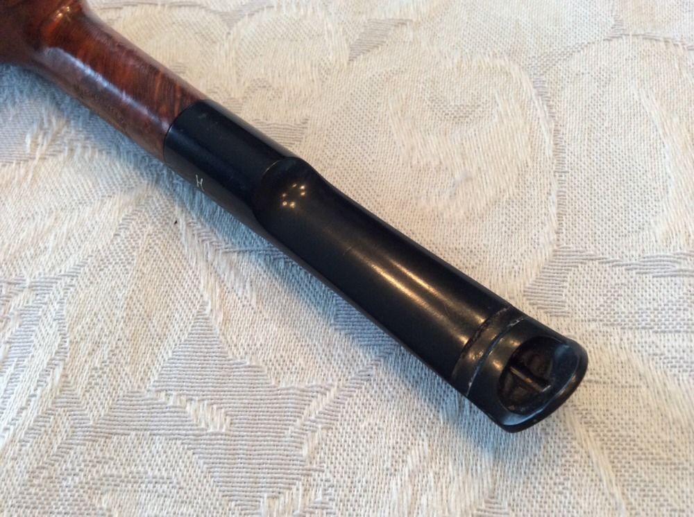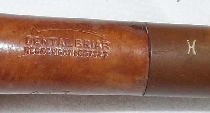 I can’t tell you how many times I took it out of the repair box to have a look. I would turn it over in my hands and think about the three ways to repair what appeared to be damage. I even sketched out a splice on paper at work on my lunch hour. Then last evening I was looking it over thinking the time had come for the work. As I looked it over I noticed that everything was just too evenly cut. The grooves on the top and bottom did not line up. The top one made allowances for the open area. The open area was also very clean and regular. There were no jagged edges on the area. It was clearly cut that way on purpose. So before I started doing anything with the stem I decided to do a bit of digging.I have included some photos of the stem taken from two different Ebay sales of a Dental Briar Pipe. The first two are a top view of the stem and the last two are of the underside. These show the design of the stem and what I commented on above. The pipe on my table has exactly the same stem and stamping at the ones pictured below.