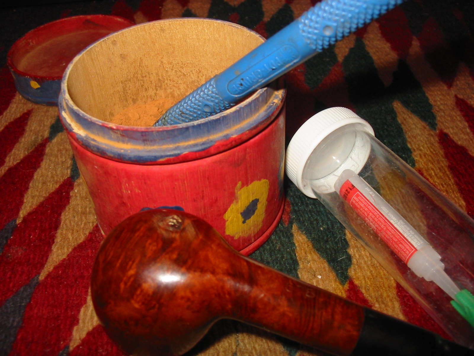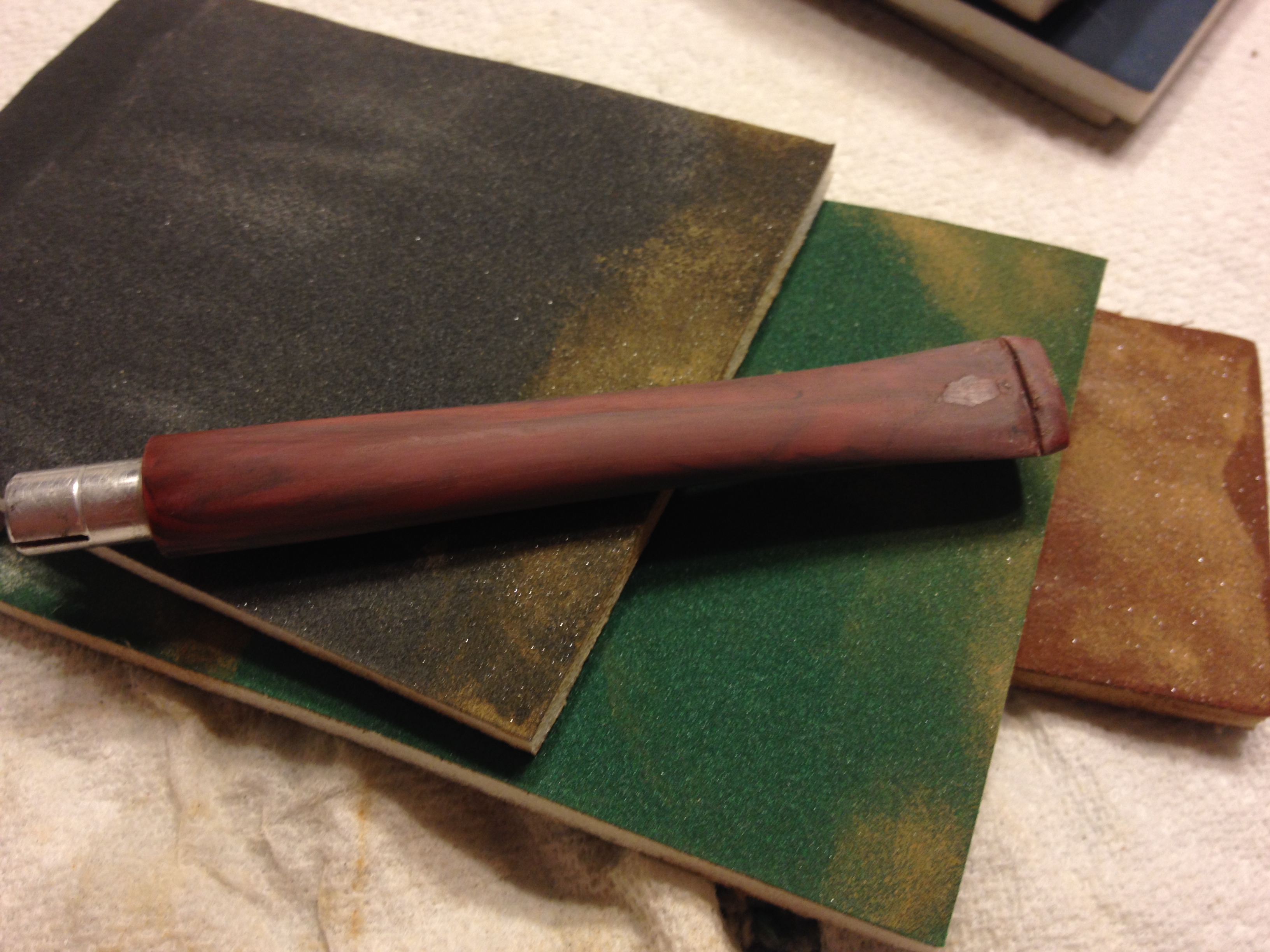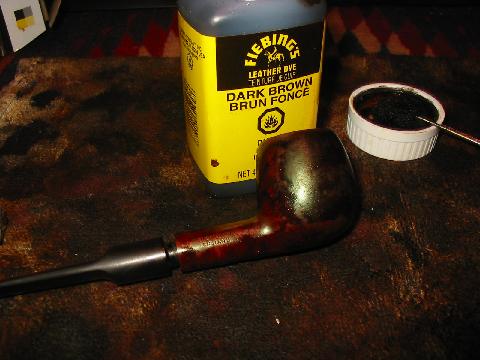 I stained the bowl with a dark brown aniline stain. I heated the briar, applied the stain, flamed it and repeated the process to get a good solid, even coverage on the briar.