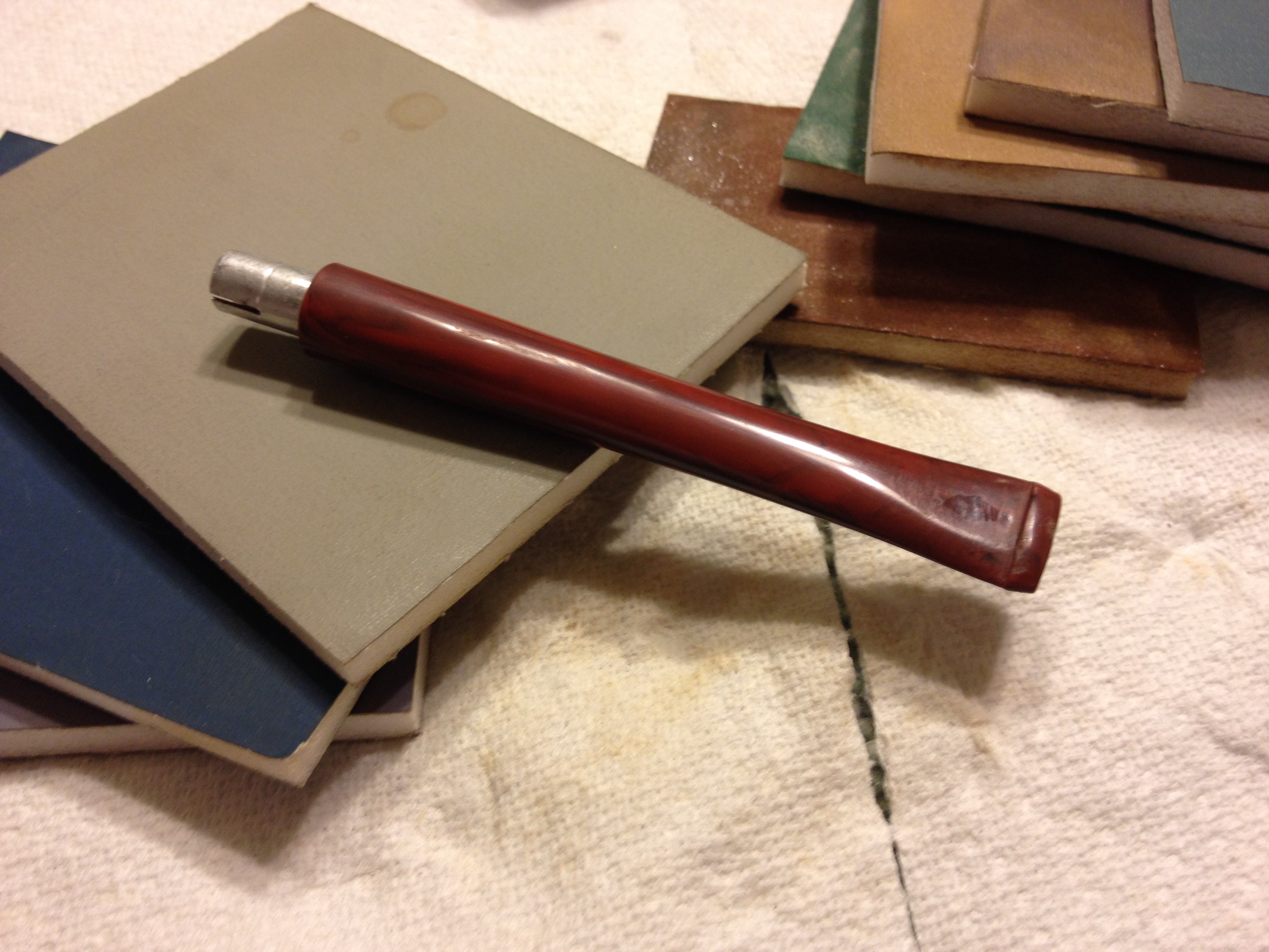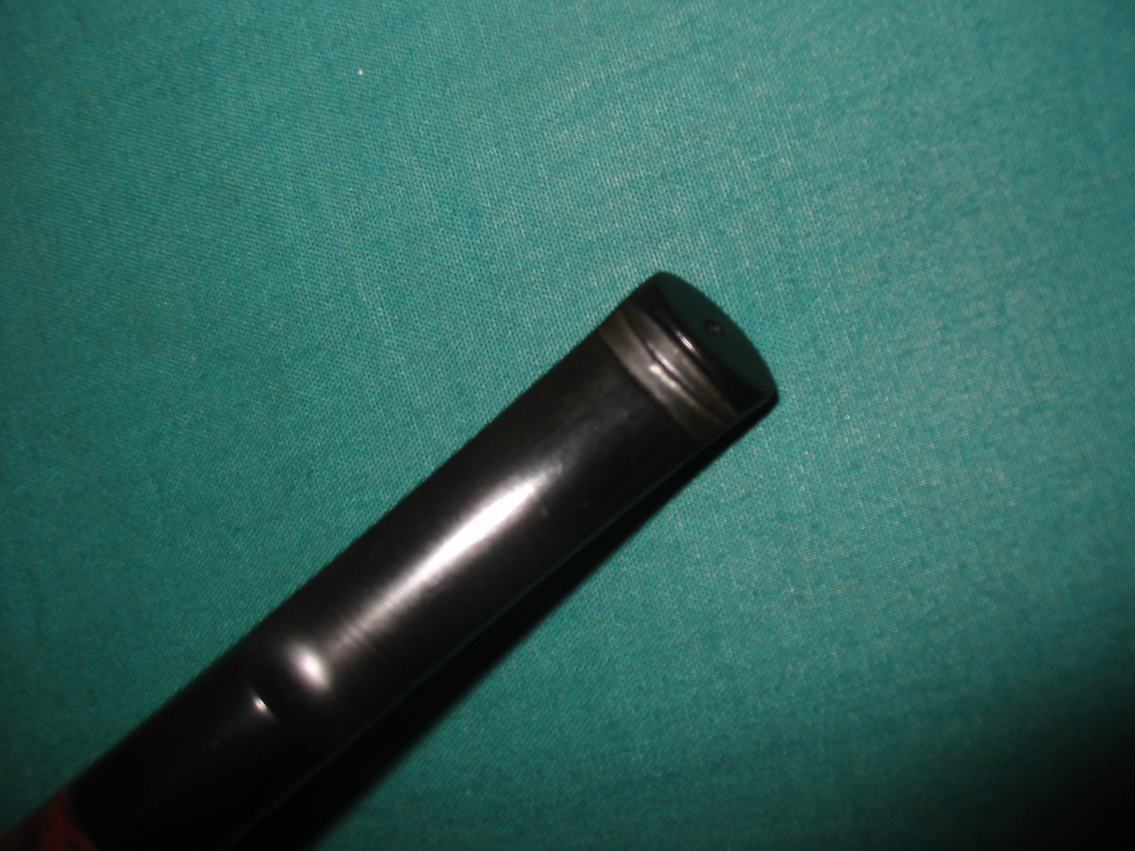 I scrubbed the stem with Meguiar’s Scratch X2.0 and when it dry buffed it off with a cotton pad. I repeated this process several times, scrubbing the grooves and dip on the end of the stem with the same tooth brush. I rubbed the stem down with Obsidian Oil and when dry took it the buffer for another buff with White Diamond. I gave it several coats of carnauba wax, buffing it with a soft flannel buff between coats. I found it very hard to remove some of the oxidation from the channels/grooves on the top and bottom of the stem. Under the flash it is clear that there is still some oxidation at that point. I rubbed it down with another coat of Obsidian Oil being careful to get deep into the edges of the grooves and the dip on the top of the stem.
