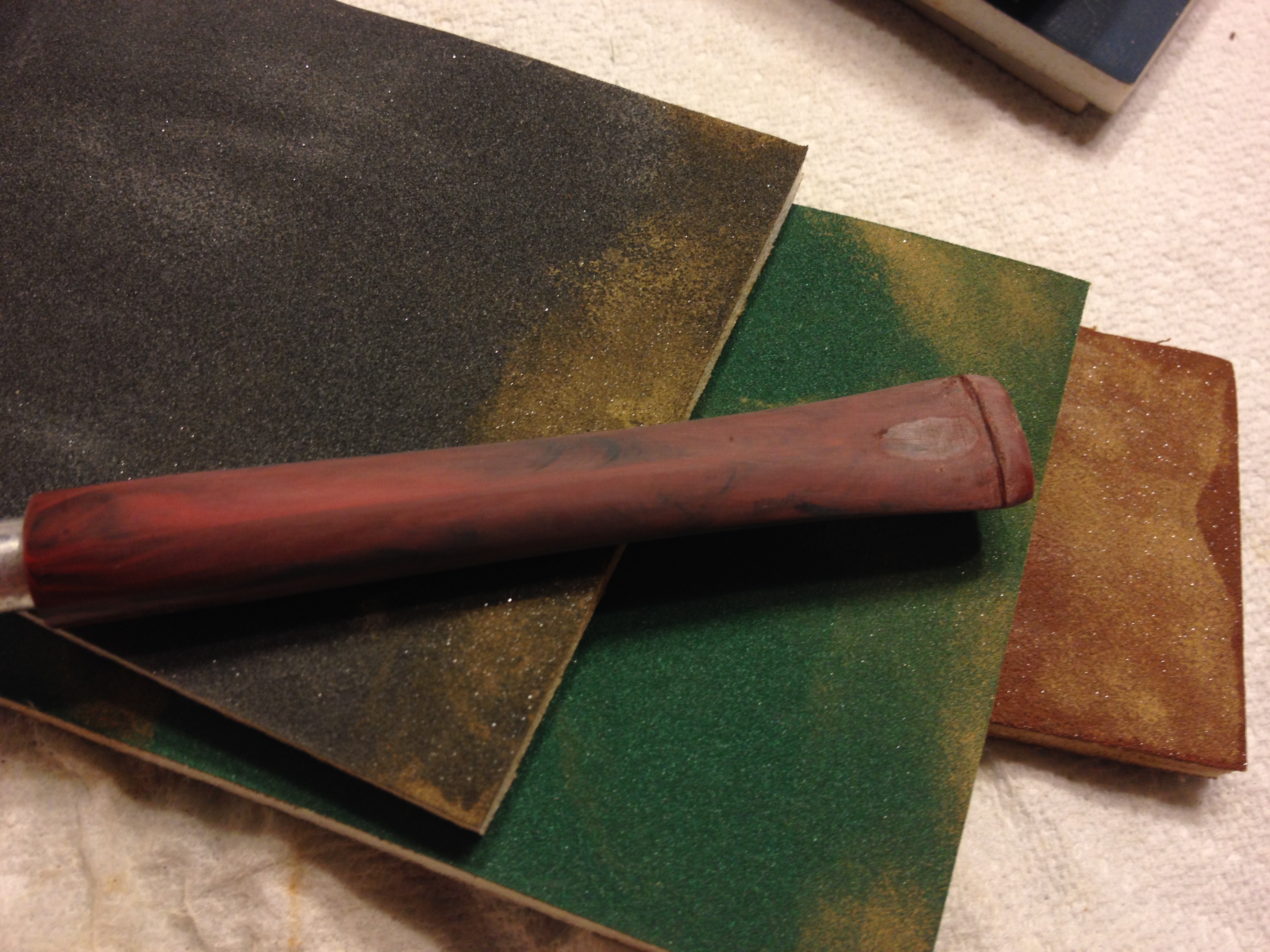 I sanded the patches with 220 grit sandpaper, medium and fine grit sanding sponges and then with 1500-2400 grit micromesh sanding pads to smooth out the patches and blend them into the surface of the bowl.